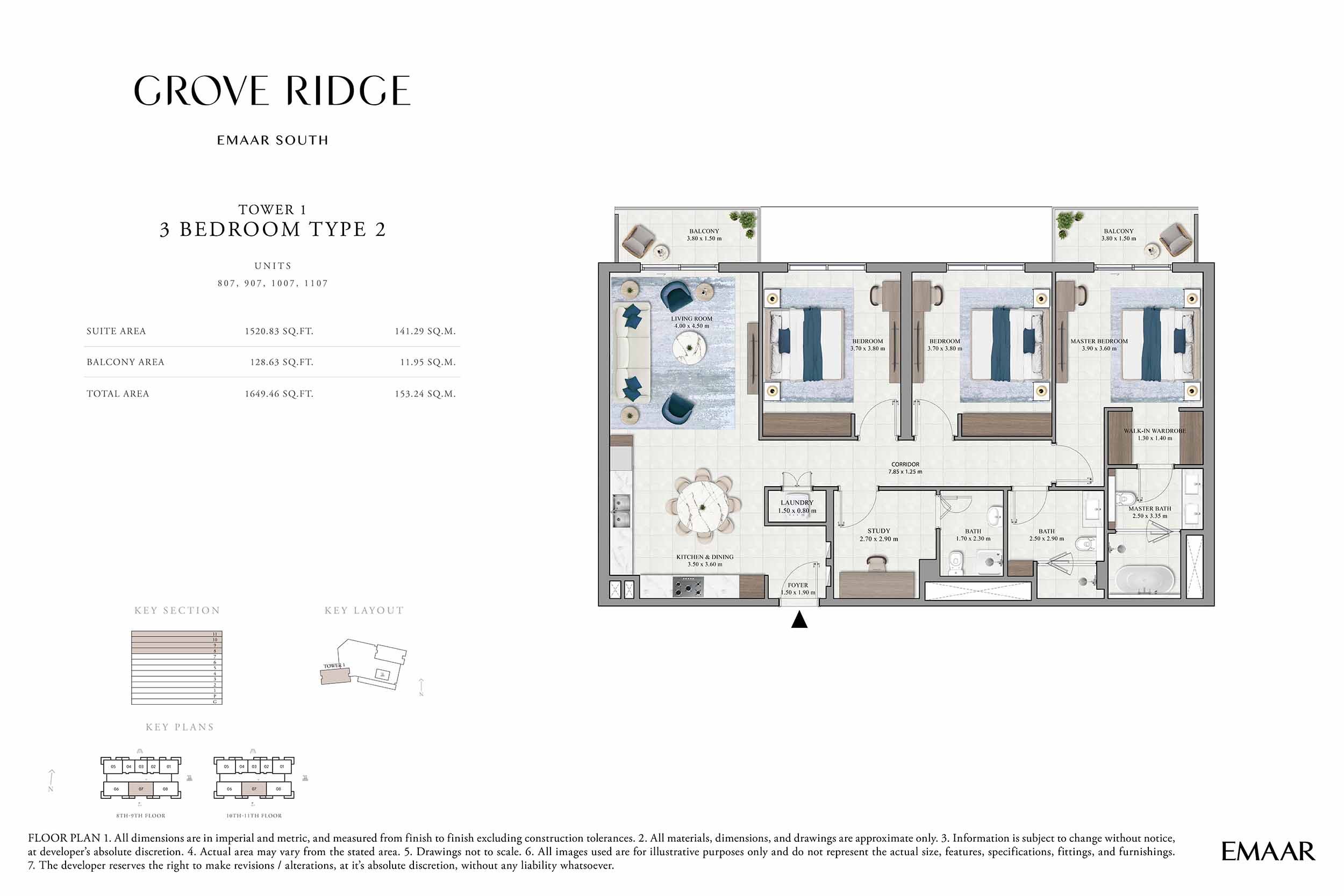 | Tower 1 | 3 Bedrooms + Study | 8th-11th Floor (Type 2-Unit 807-1107) | 1649.46 Sq Ft | Click Here |