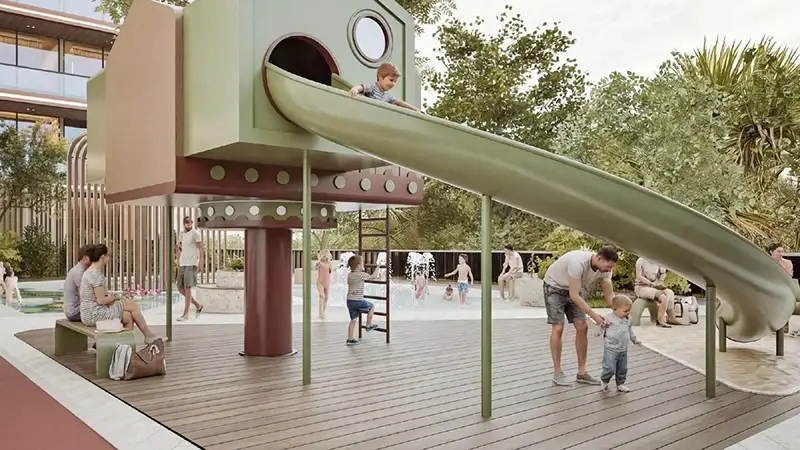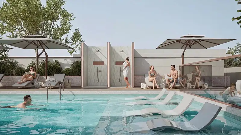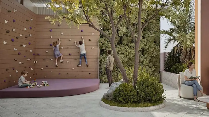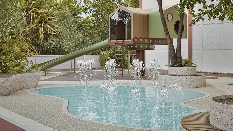 Outside architecture, the façade offers a life experience, which is focused on serenity and relatability. The landscaped podium includes water features, shaded seating arrangements, children play areas as well as accentual communal meeting spaces of significant interaction. Reflective pools are framed with sculptural wooden arches and greenery helps to soften pathways and recreational angles. It is built and is set to evoke the atmosphere of an exclusive thanksgiving in the city: the mornings will be spent with walks through the garden courtyards and the evenings will be spent near the lamplight and peaceful waterfalls. All common areas promote social interaction and privacy, which support the philosophy of belonging applied in the project.