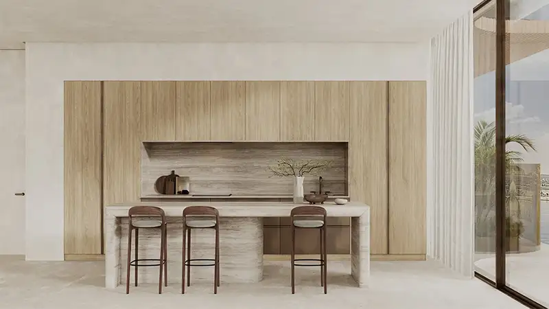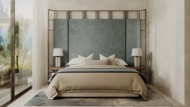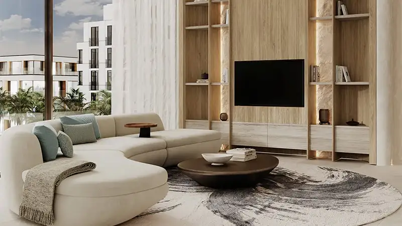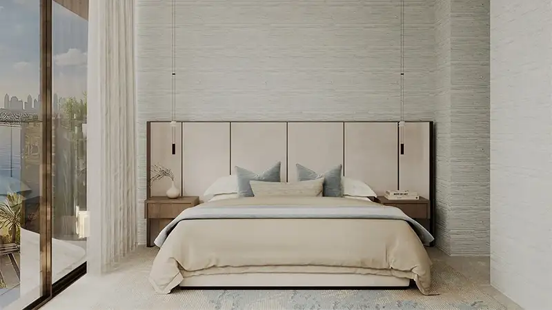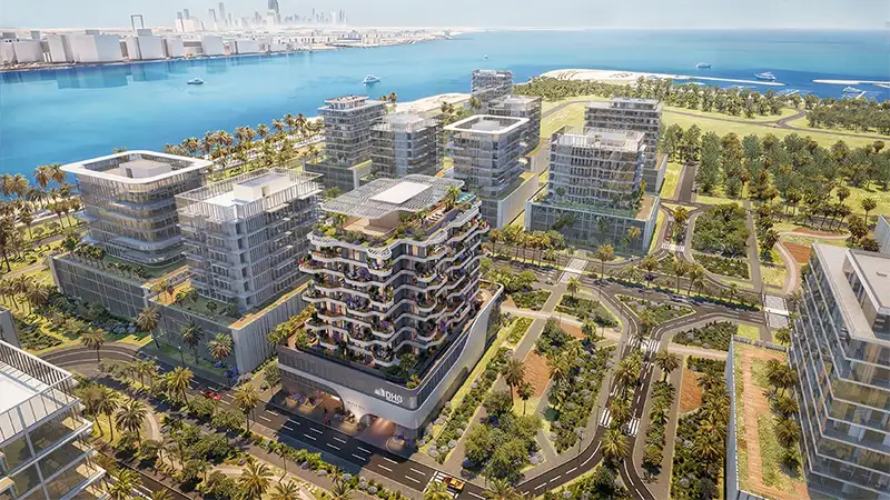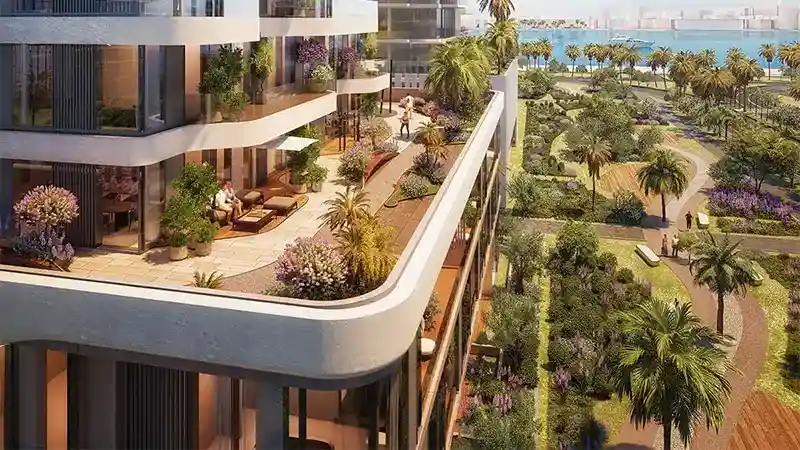 Once inside the façade, one finds greenspace, overlooking a privately owned marina, where the yachts are all softly rocking against its polished wooden docks. The architecture is based on the lines of minimalism and expansive floor-ceiling windows, which provide interior areas with daylight and highlight carefully designed finishes. The interiors are made with high quality materials such as marble floors in the foyer, engineered timber living room, and the metallic patches that come with the feeling of very quiet luxury. Most importantly, the project feels very harmonious: the structural silhouette of the towers as it is contemporary is enhanced by the flowing curves of the waterfront, the terraces and the balconies provide endless view on the sea, the Dubai skyline, and the greenery of the island around it.