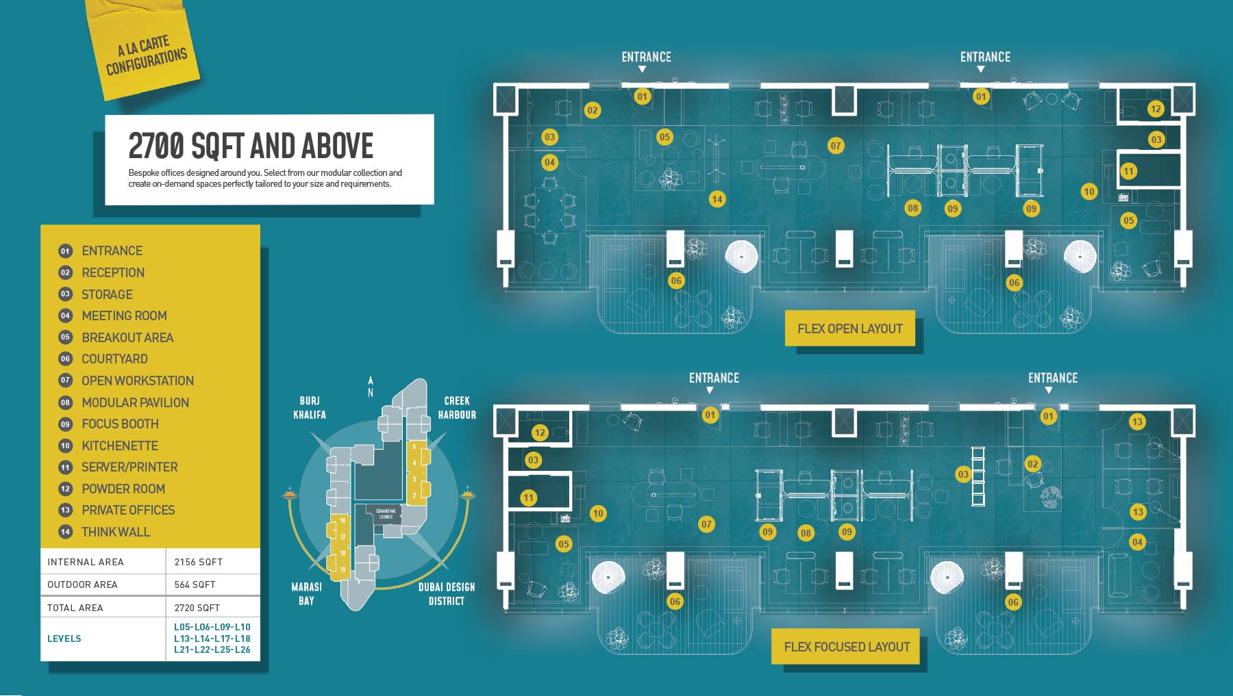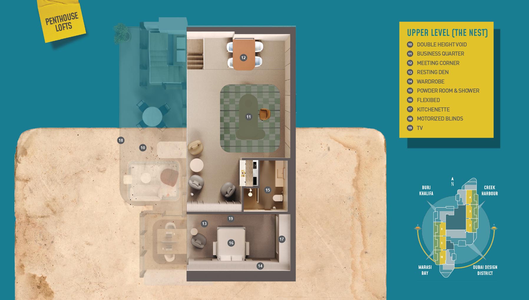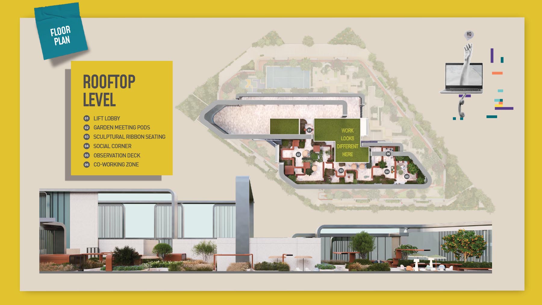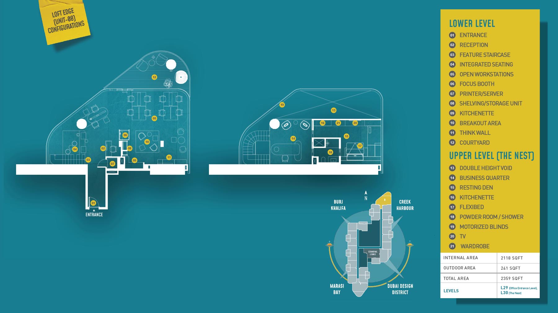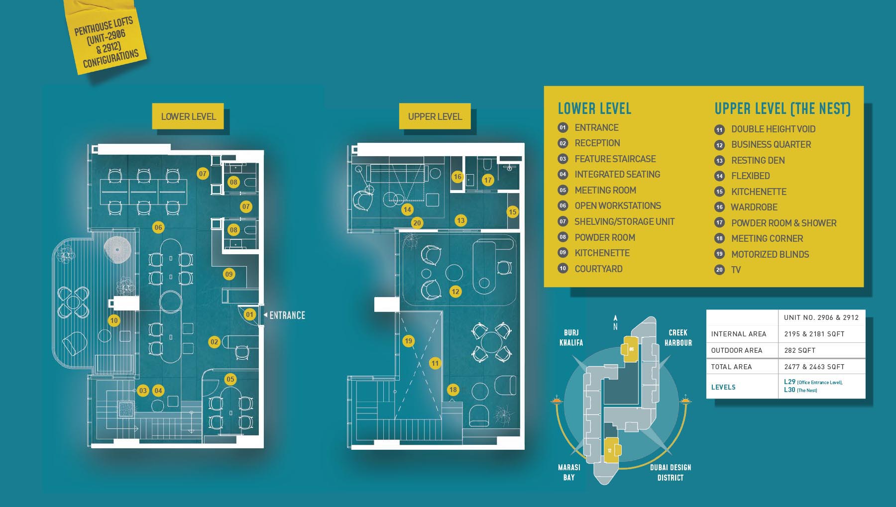 HQ by Rove is emerging as an attention-grabbing Grade – A office building with distinctive floor plans within modular offices, loft offices, and penthouse loft offices. In this 23-storey building, the modular working spaces are divided into studios, deluxe, executive, simplex edge, and A La Carte units where meeting rooms, quality furnishings, and thoughtful layouts create an ideal and hassle-free ambience for working. The loft-edge units offer double-height ceilings, and exquisite design detail. However, the additional services of call handling, high-speed internet, IT tech support, office assistance, and smart booking are available for all employees.