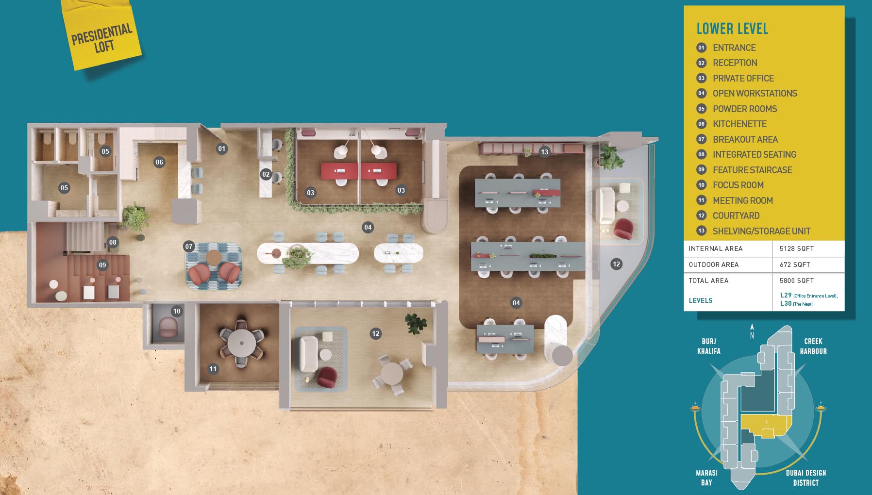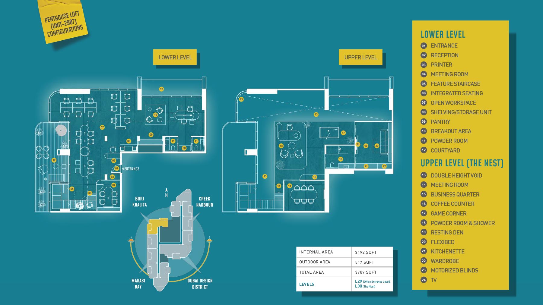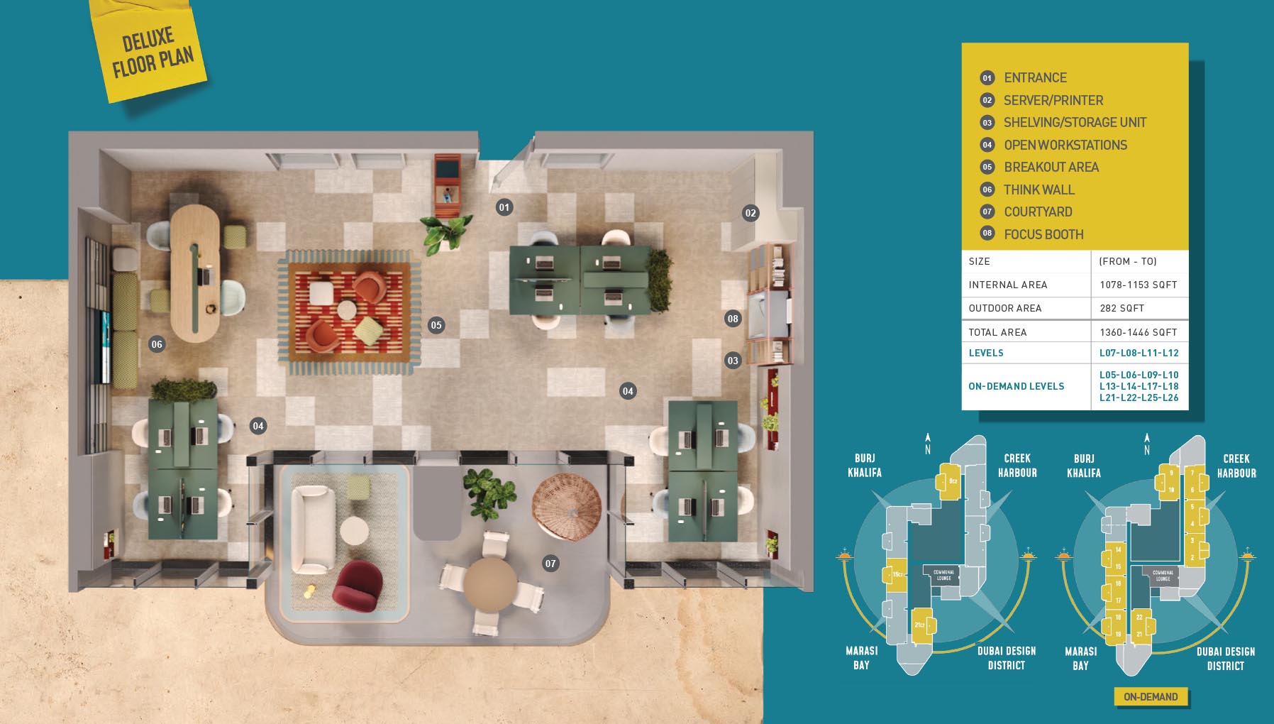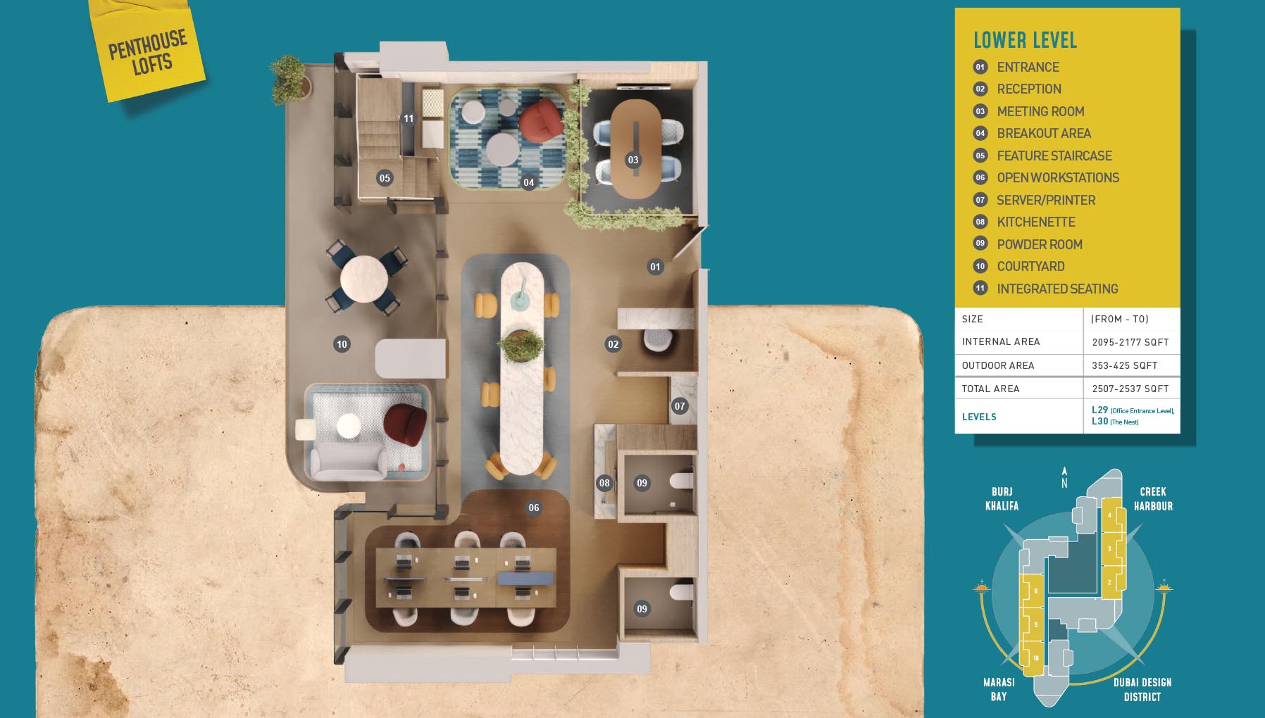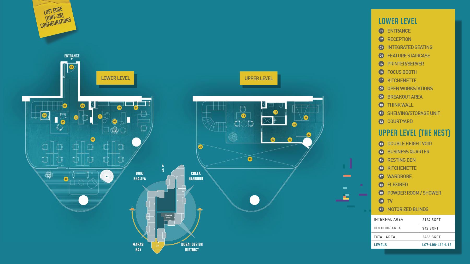 HQ by Rove is emerging as an attention-grabbing Grade – A office building with distinctive floor plans within modular offices, loft offices, and penthouse loft offices. In this 23-storey building, the modular working spaces are divided into studios, deluxe, executive, simplex edge, and A La Carte units where meeting rooms, quality furnishings, and thoughtful layouts create an ideal and hassle-free ambience for working. The loft-edge units offer double-height ceilings, and exquisite design detail. However, the additional services of call handling, high-speed internet, IT tech support, office assistance, and smart booking are available for all employees.