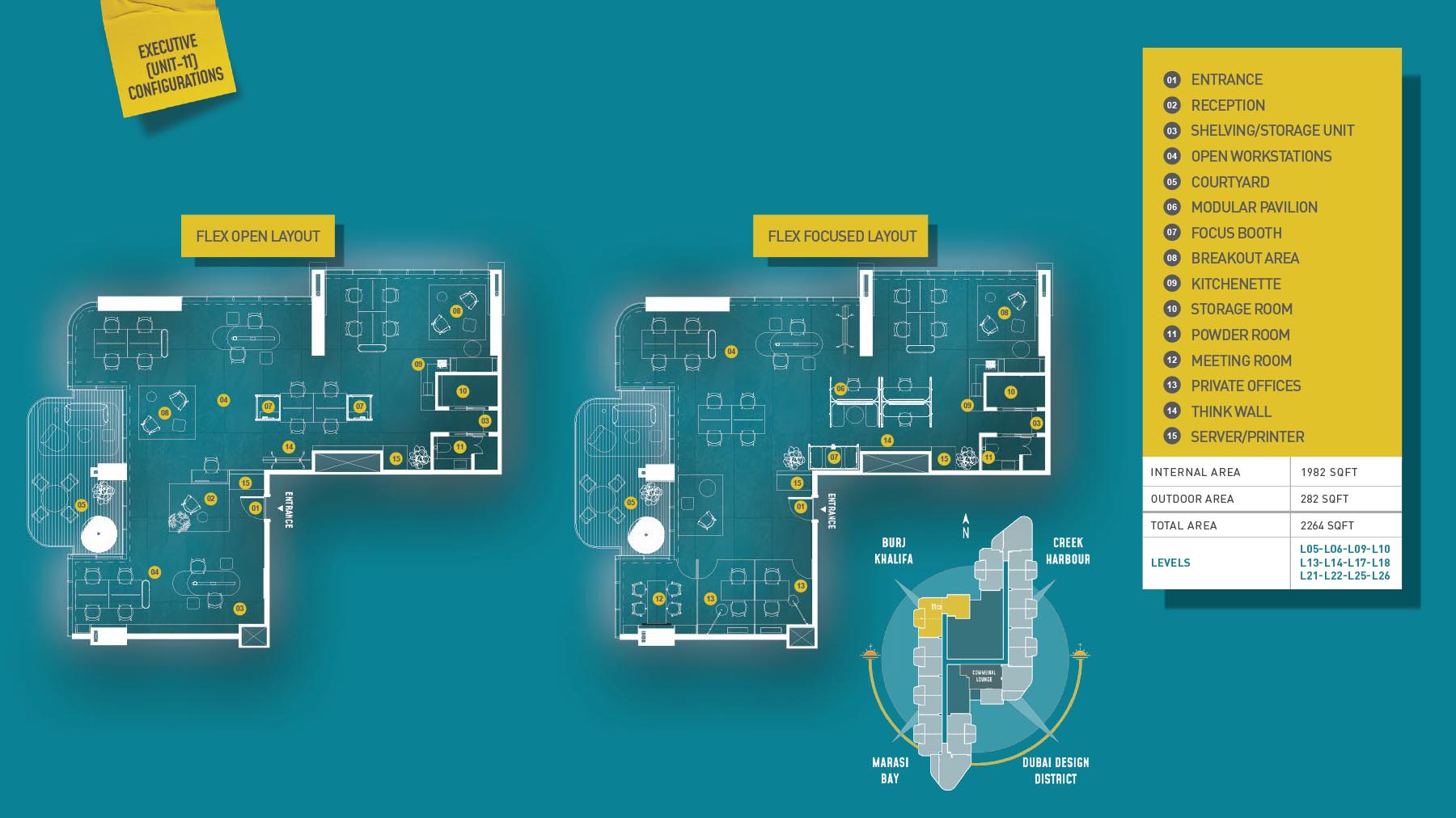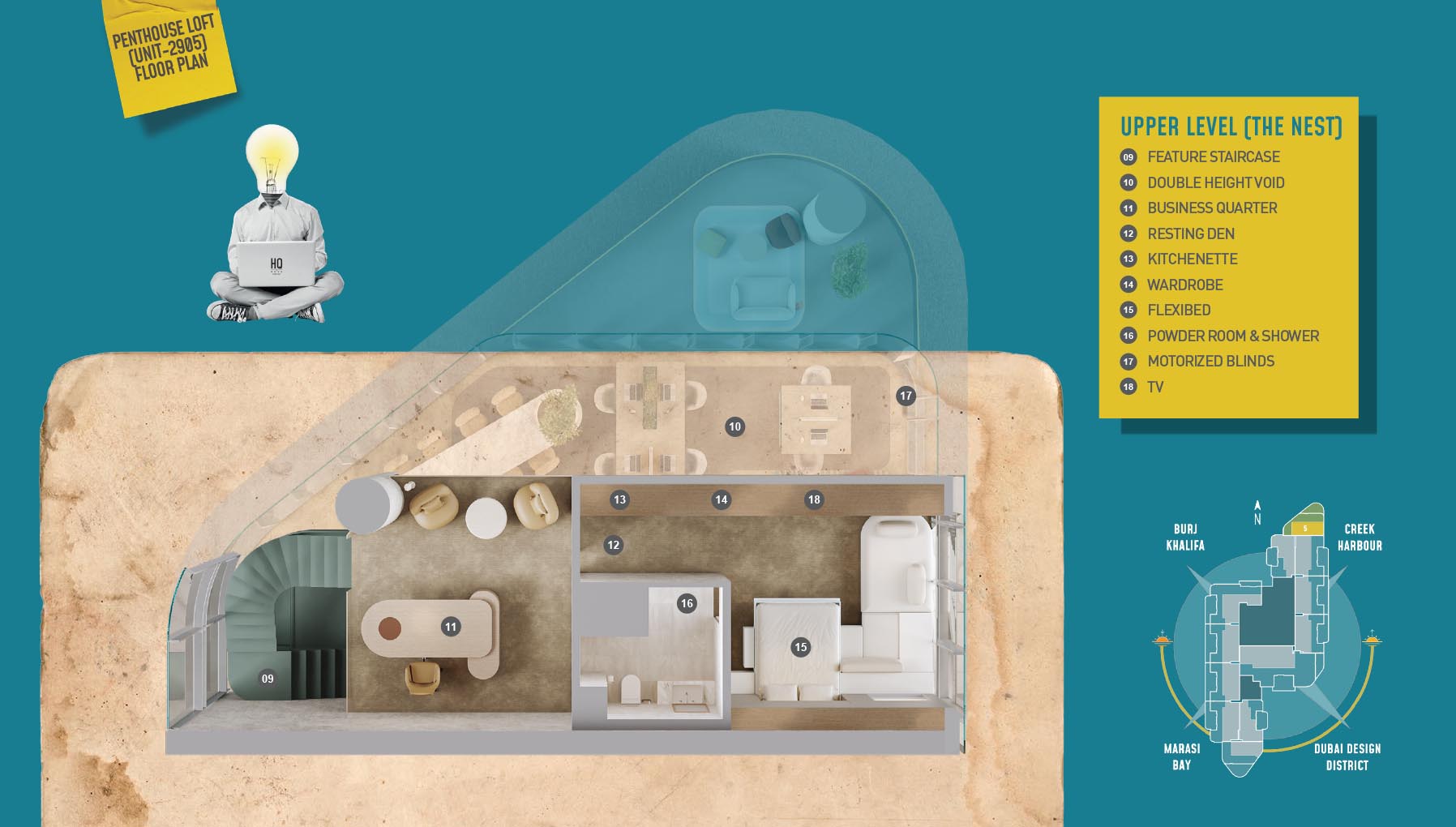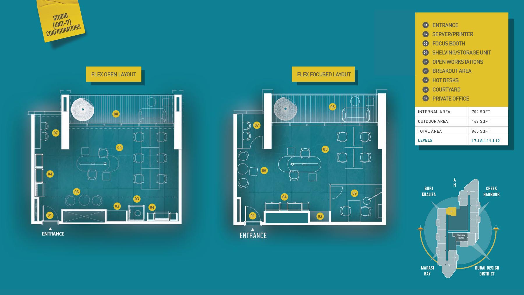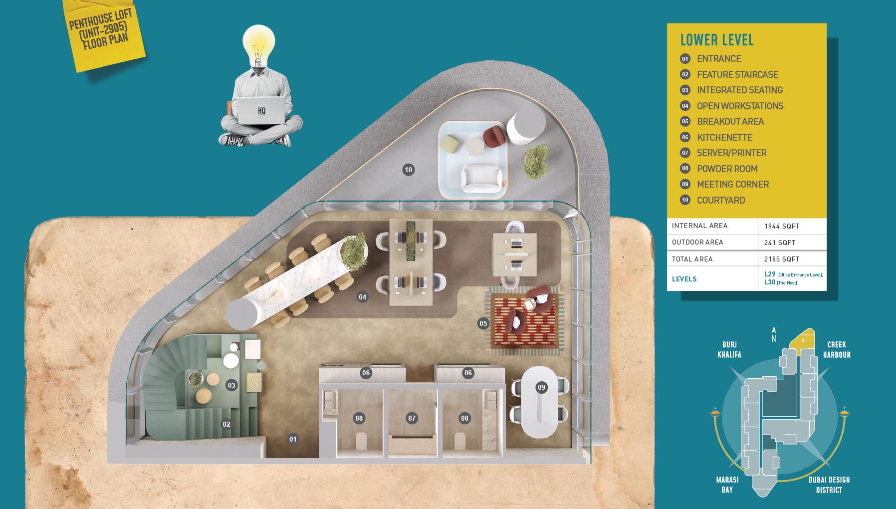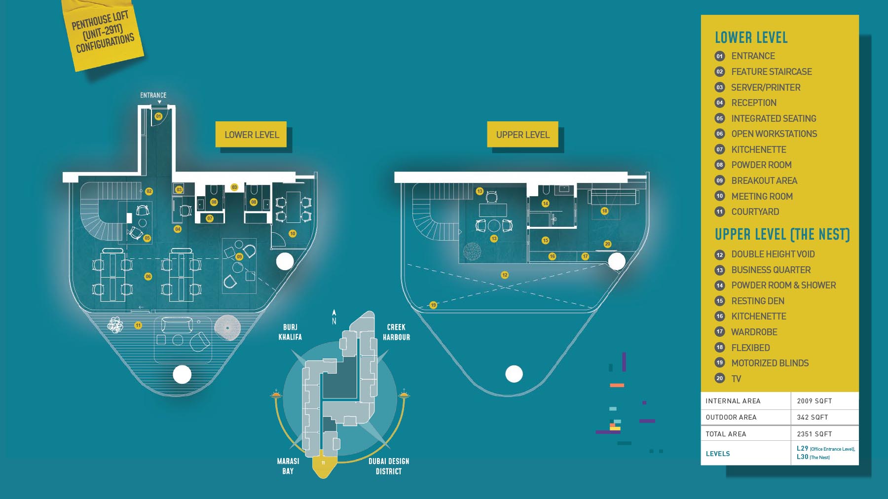 HQ by Rove is emerging as an attention-grabbing Grade – A office building with distinctive floor plans within modular offices, loft offices, and penthouse loft offices. In this 23-storey building, the modular working spaces are divided into studios, deluxe, executive, simplex edge, and A La Carte units where meeting rooms, quality furnishings, and thoughtful layouts create an ideal and hassle-free ambience for working. The loft-edge units offer double-height ceilings, and exquisite design detail. However, the additional services of call handling, high-speed internet, IT tech support, office assistance, and smart booking are available for all employees.