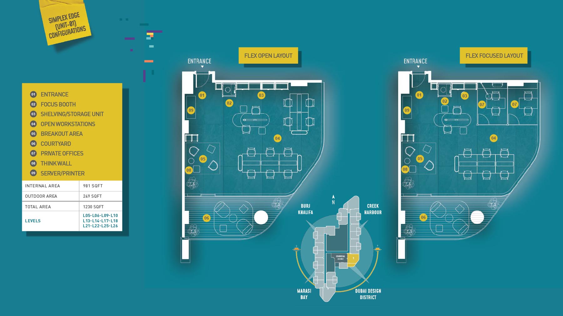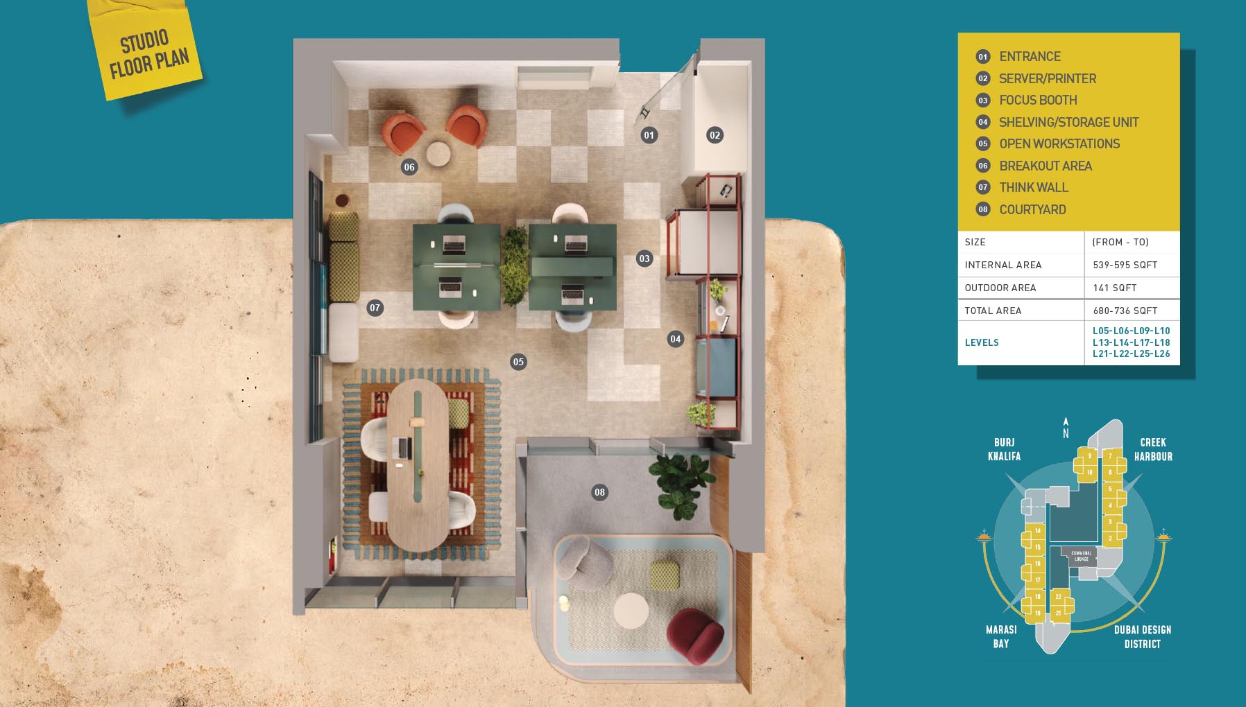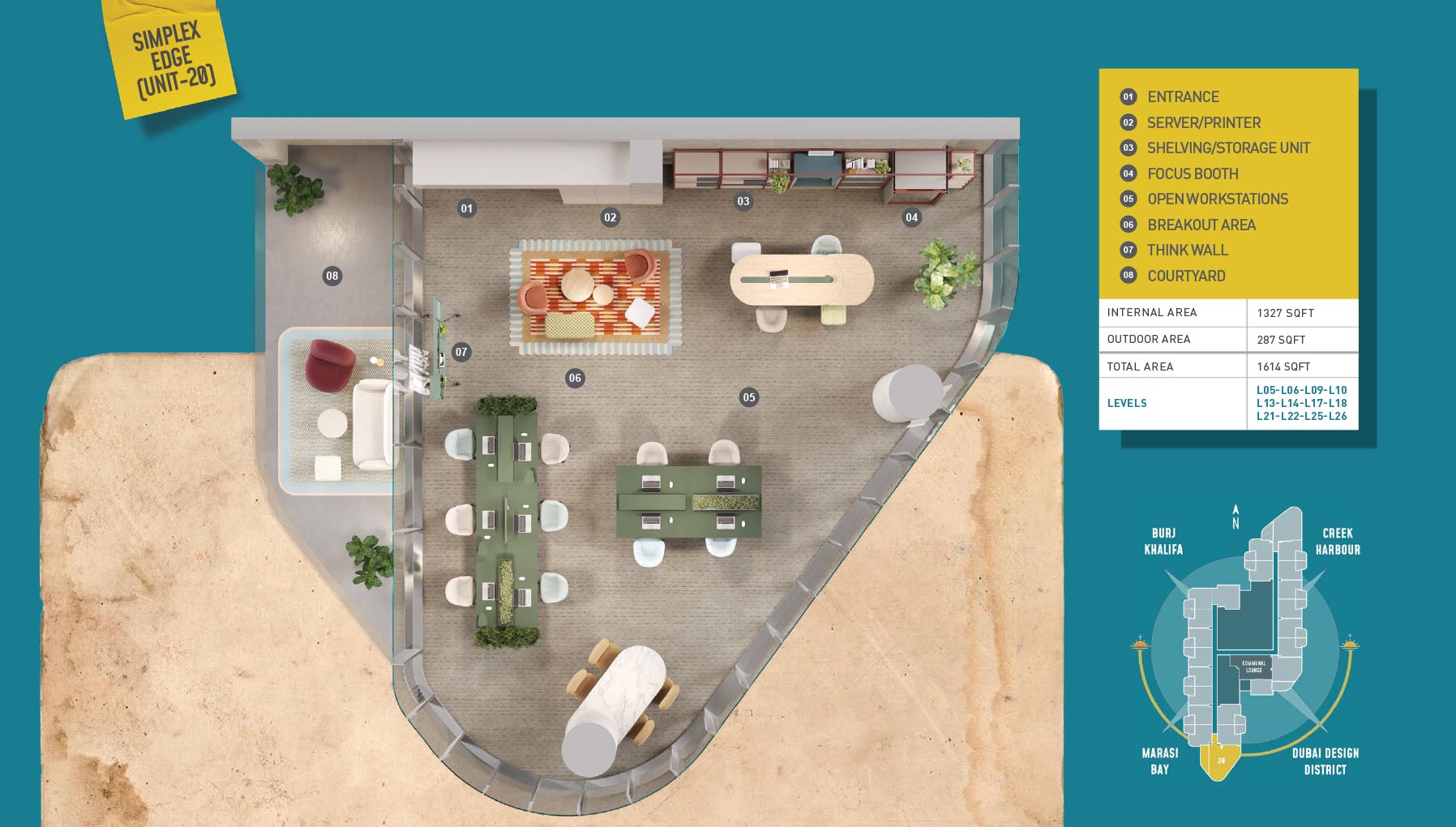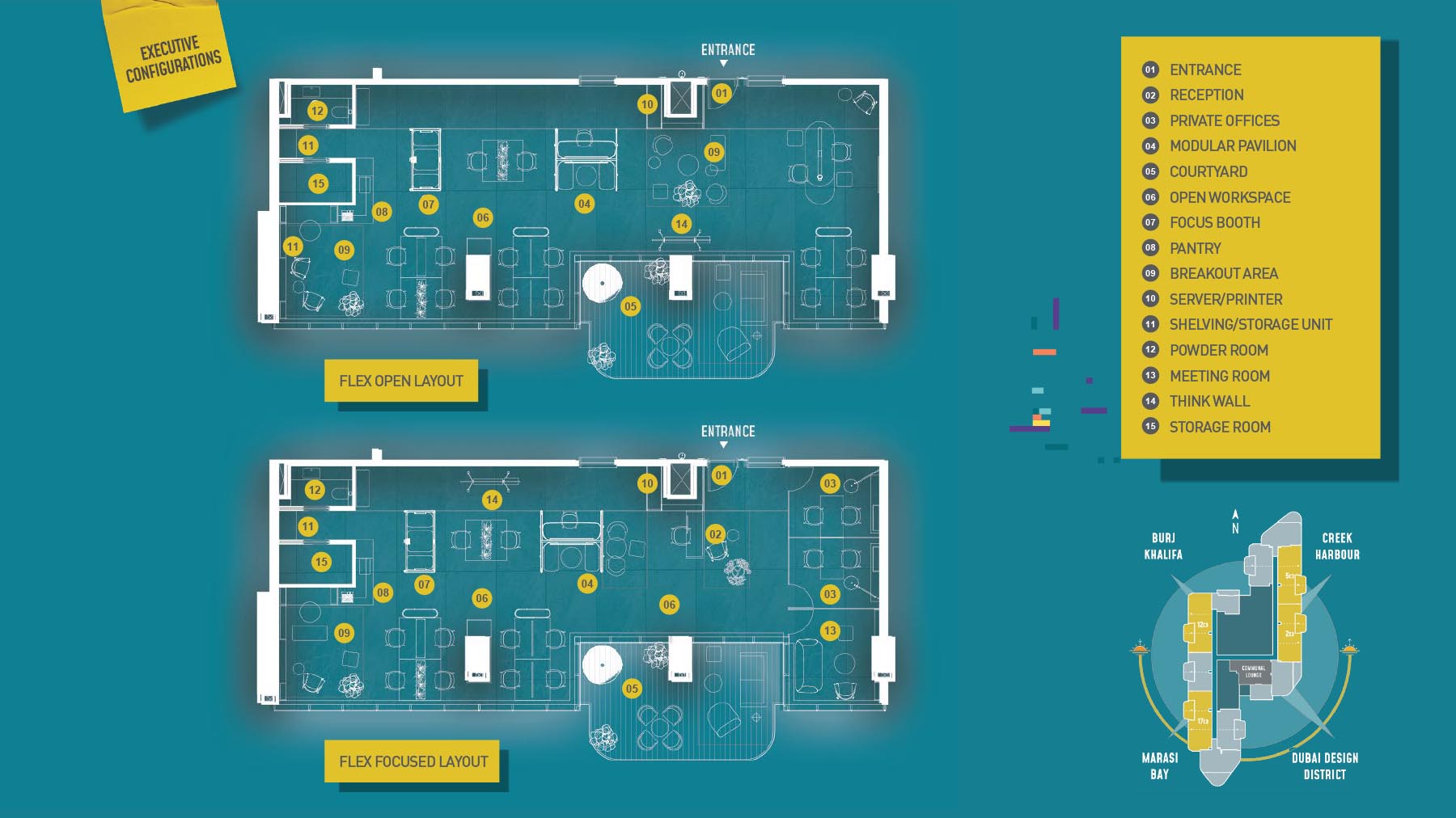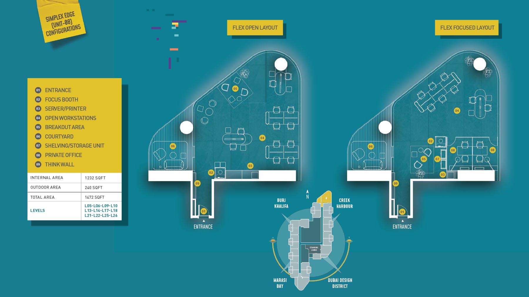 HQ by Rove is emerging as an attention-grabbing Grade – A office building with distinctive floor plans within modular offices, loft offices, and penthouse loft offices. In this 23-storey building, the modular working spaces are divided into studios, deluxe, executive, simplex edge, and A La Carte units where meeting rooms, quality furnishings, and thoughtful layouts create an ideal and hassle-free ambience for working. The loft-edge units offer double-height ceilings, and exquisite design detail. However, the additional services of call handling, high-speed internet, IT tech support, office assistance, and smart booking are available for all employees.