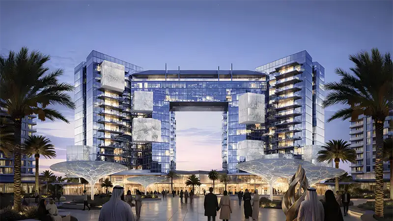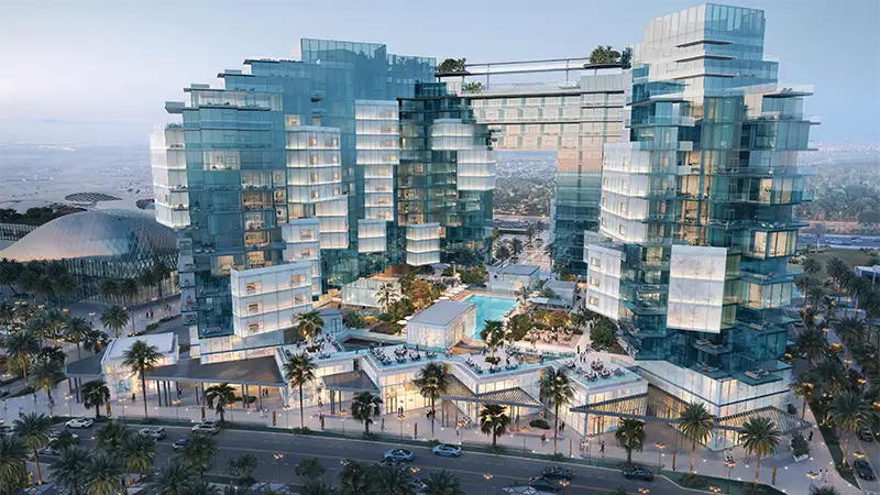 - Interconnected structures, glass façades, and layered geometric forms that create a visually striking and modern skyline presence.