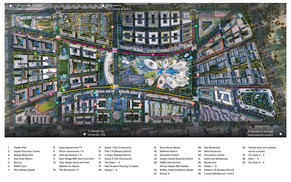 Jana master plan is highly tuned with the overall vision of Aljada, which is about being connected, available, and living towards the community. The building is strategically placed to incorporate landscaped walkways, open areas, and pedestrian friendly areas that outline the urban structure of the community. The neighbourhood is conveniently linked to shopping streets, recreational areas, and fitness centers so that all essentials of daily life are easily accessible. Its design is focused on spatial compatibility and the residential clusters are formed with a goal of providing privacy without disruption to sight lines and functionality to community facilities. Through development, there are green spaces and recreational areas, encouraging a healthy and active lifestyle.