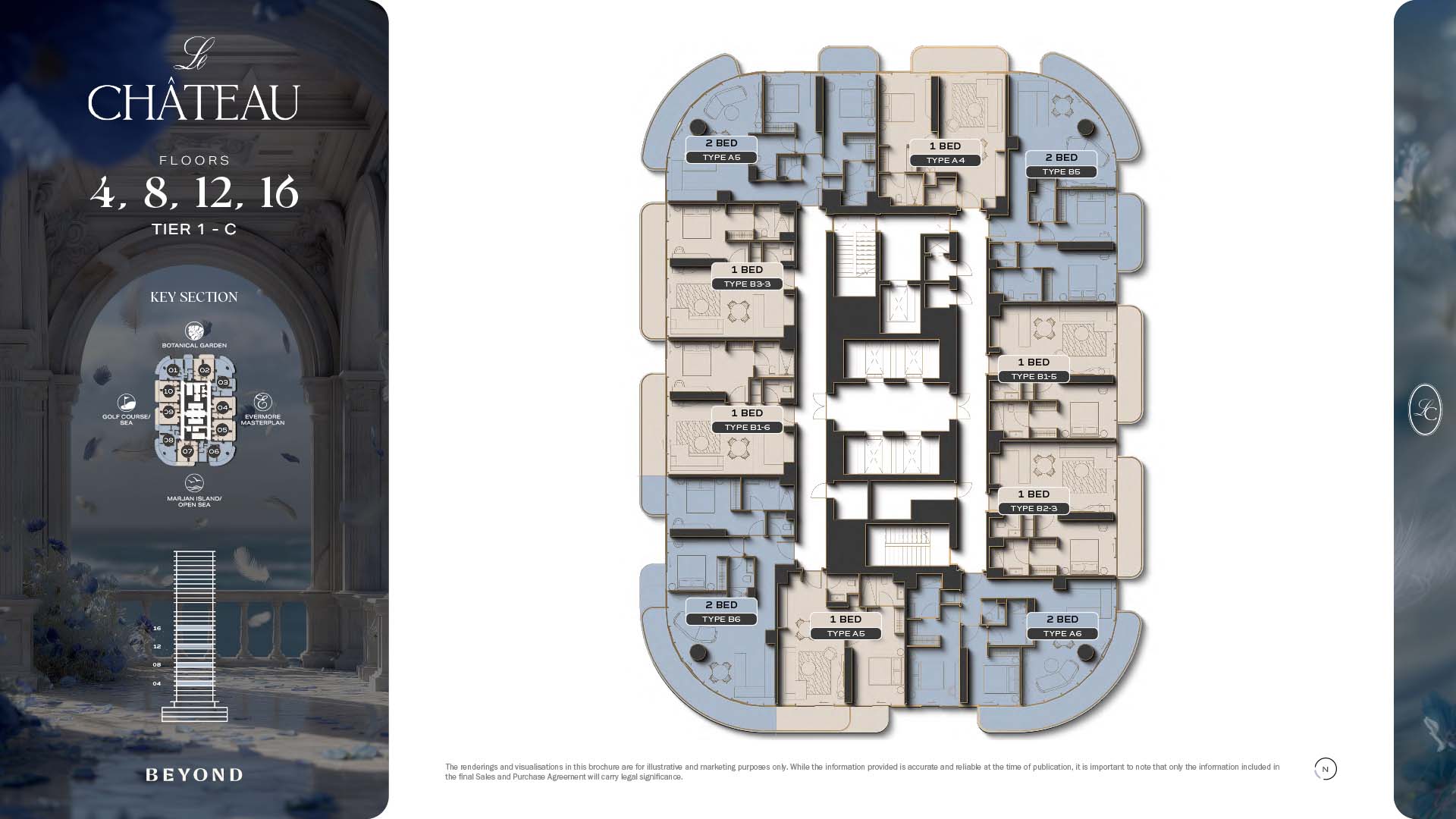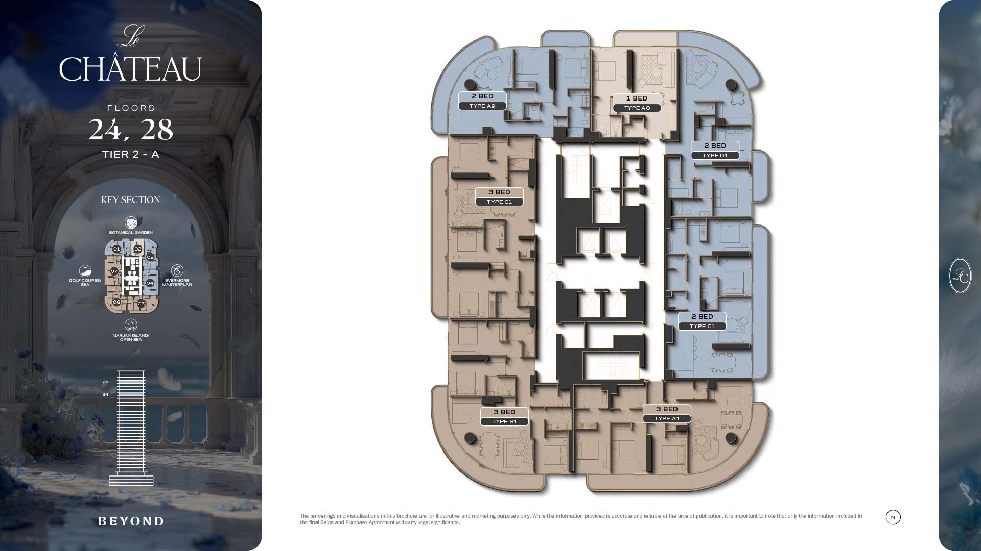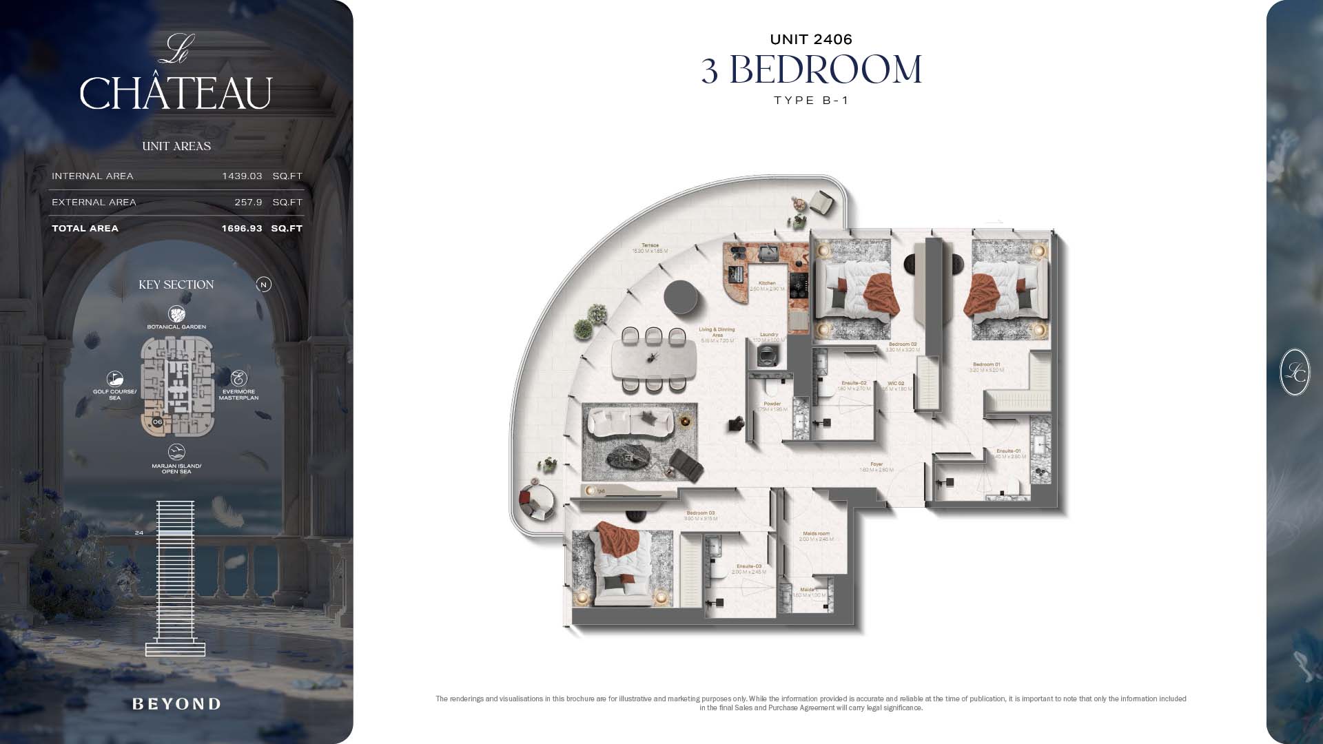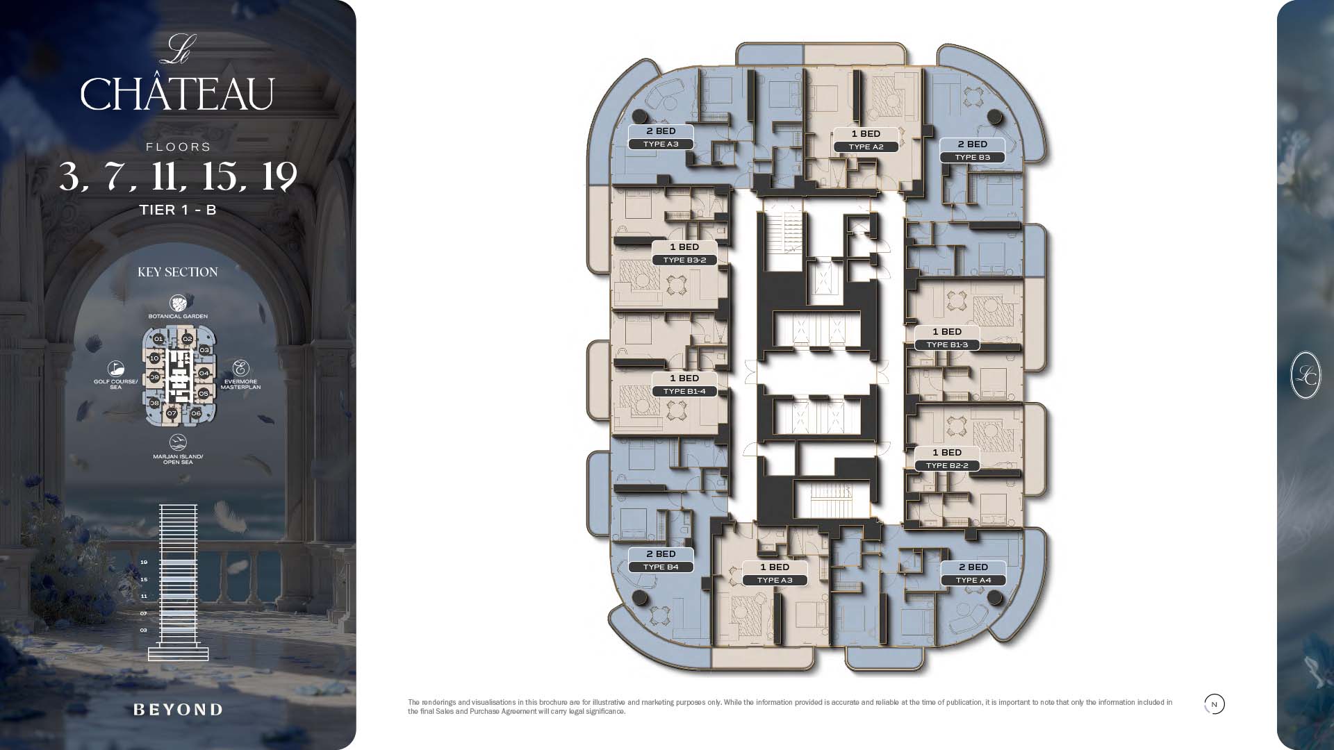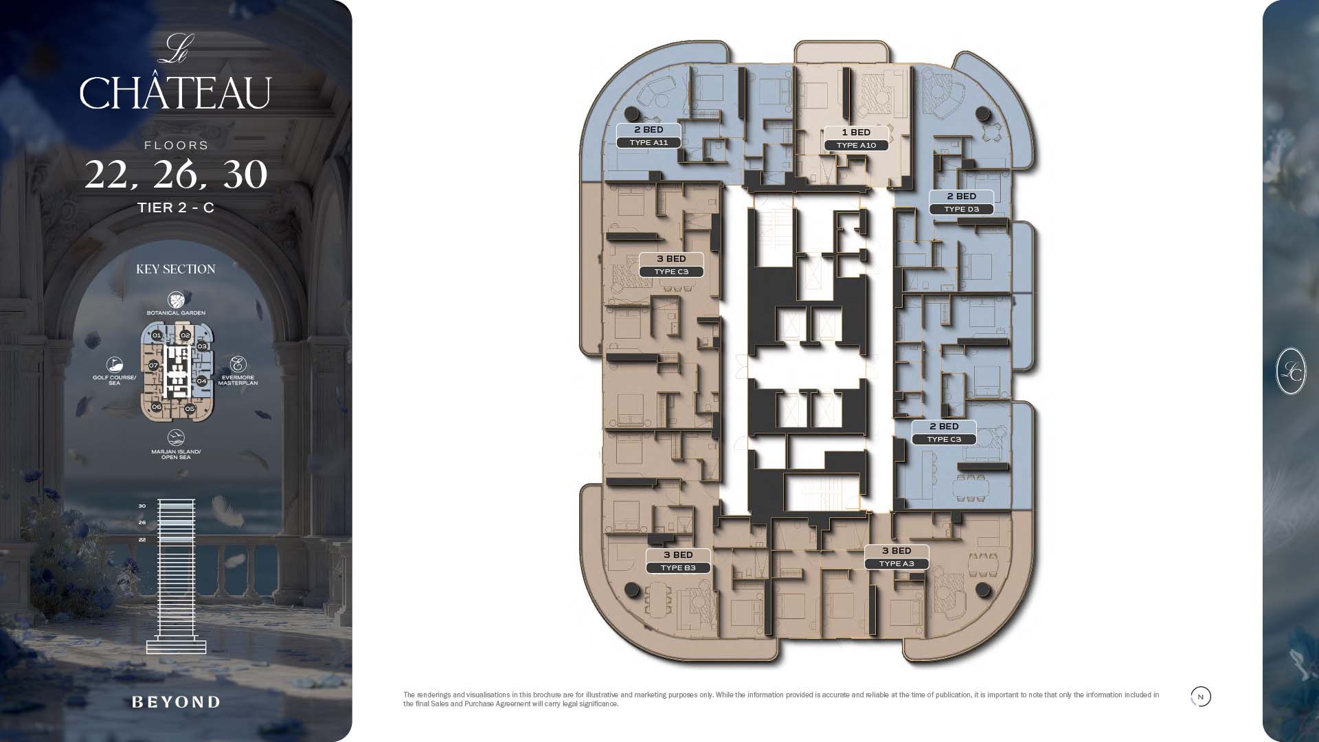 The floor plans of Le Chateau are devised in the way that they resemble effortlessness, balance, and spaciousness within 1, 2 and 3 bedroom apartments. The homes are well designed to make use of natural light, landscapes, and accommodate a use of space. The living and dining areas are open without divisions and they move towards the exterior as large balconies extend the interior areas. Bedrooms are placed in such a way that gives them privacy and calmness with plentiful glazing giving views of sea and skyline. Considerate zoning enables commonplace living, recreation and amusement to co-exist together in harmony.