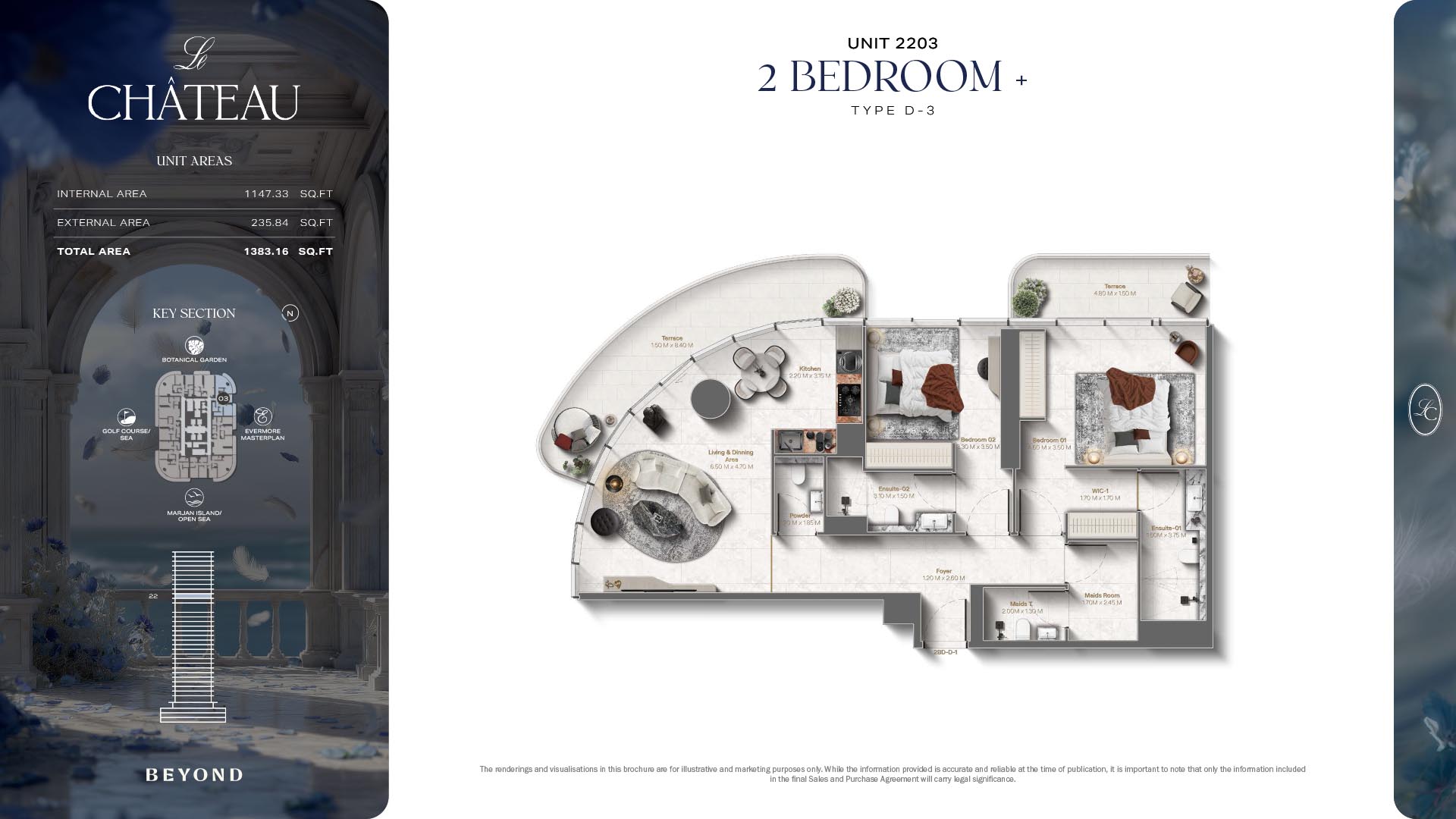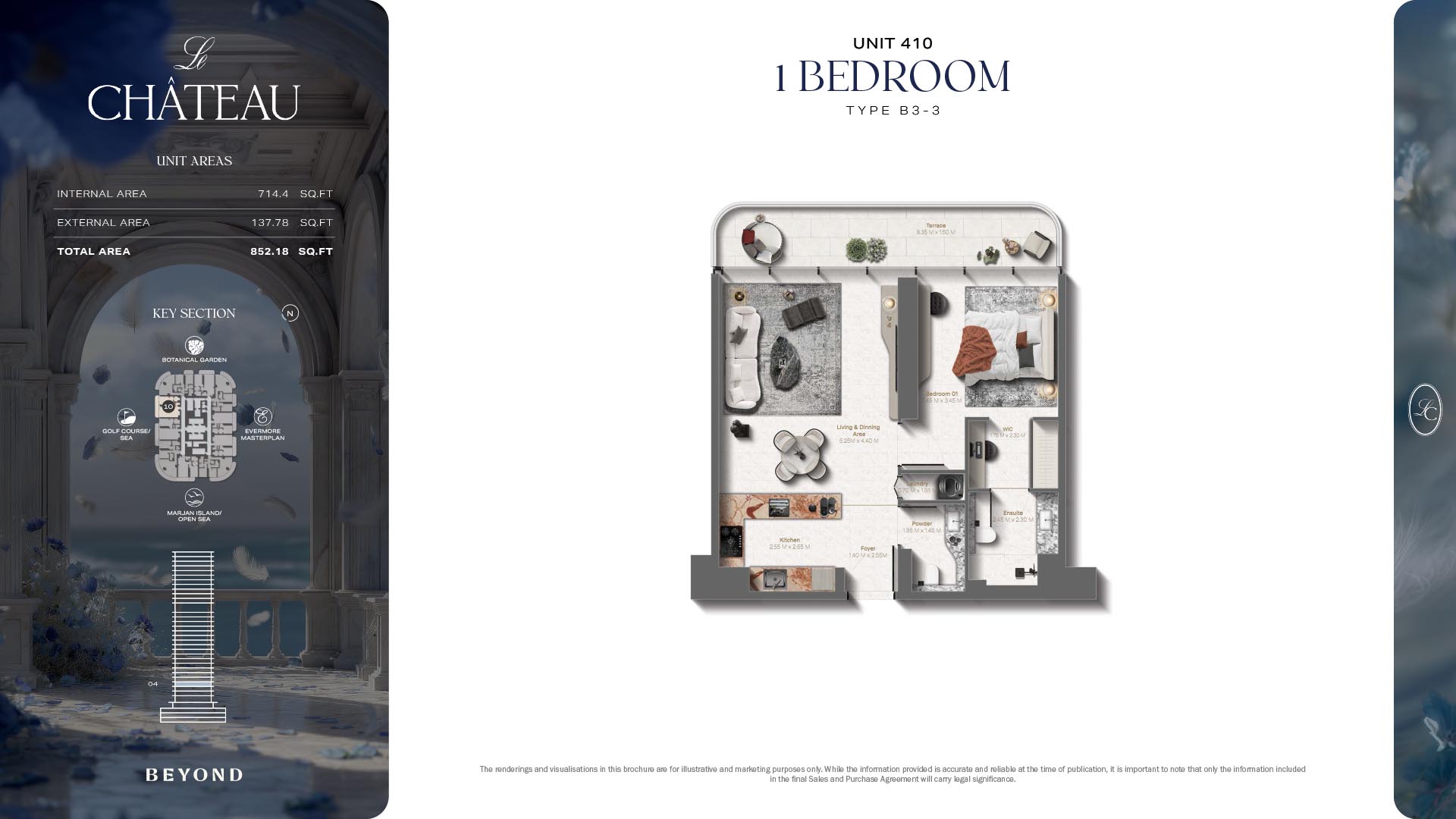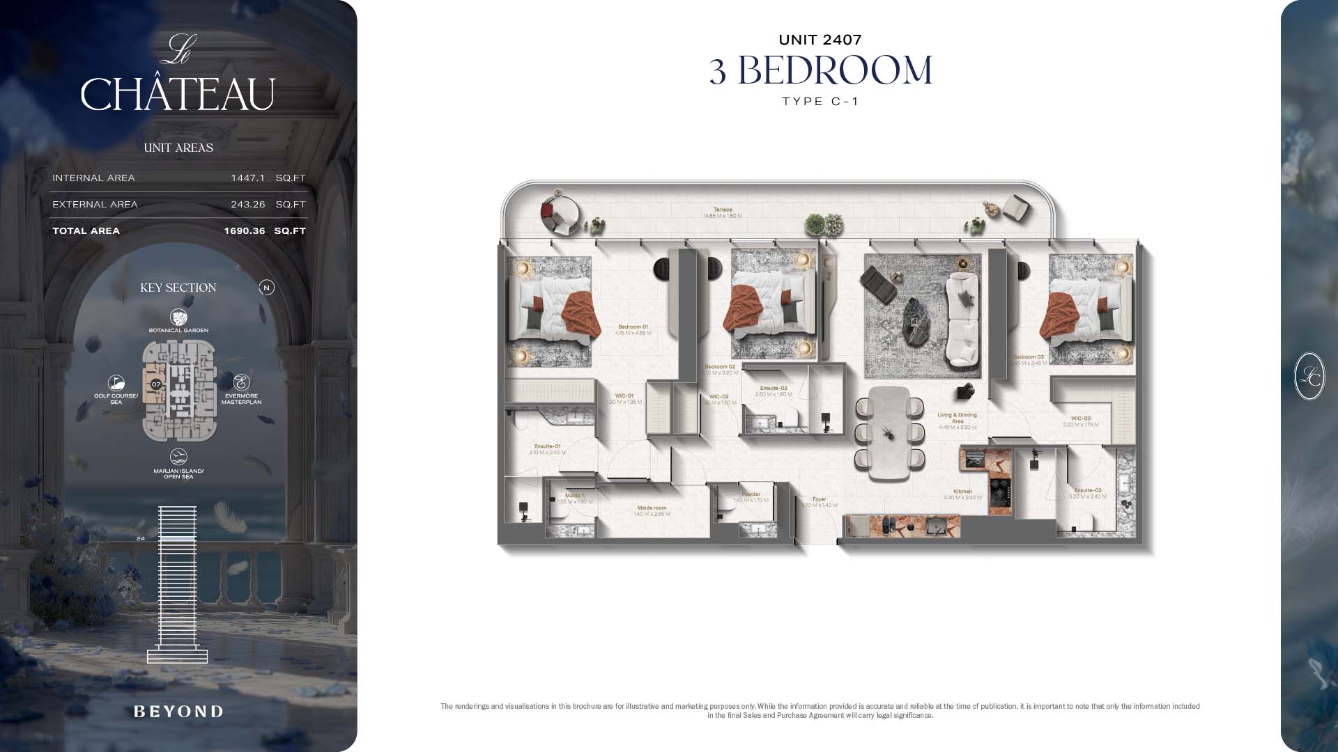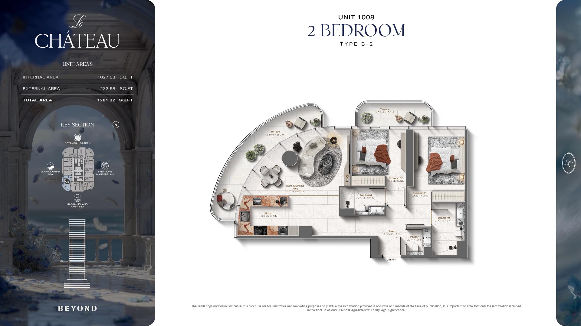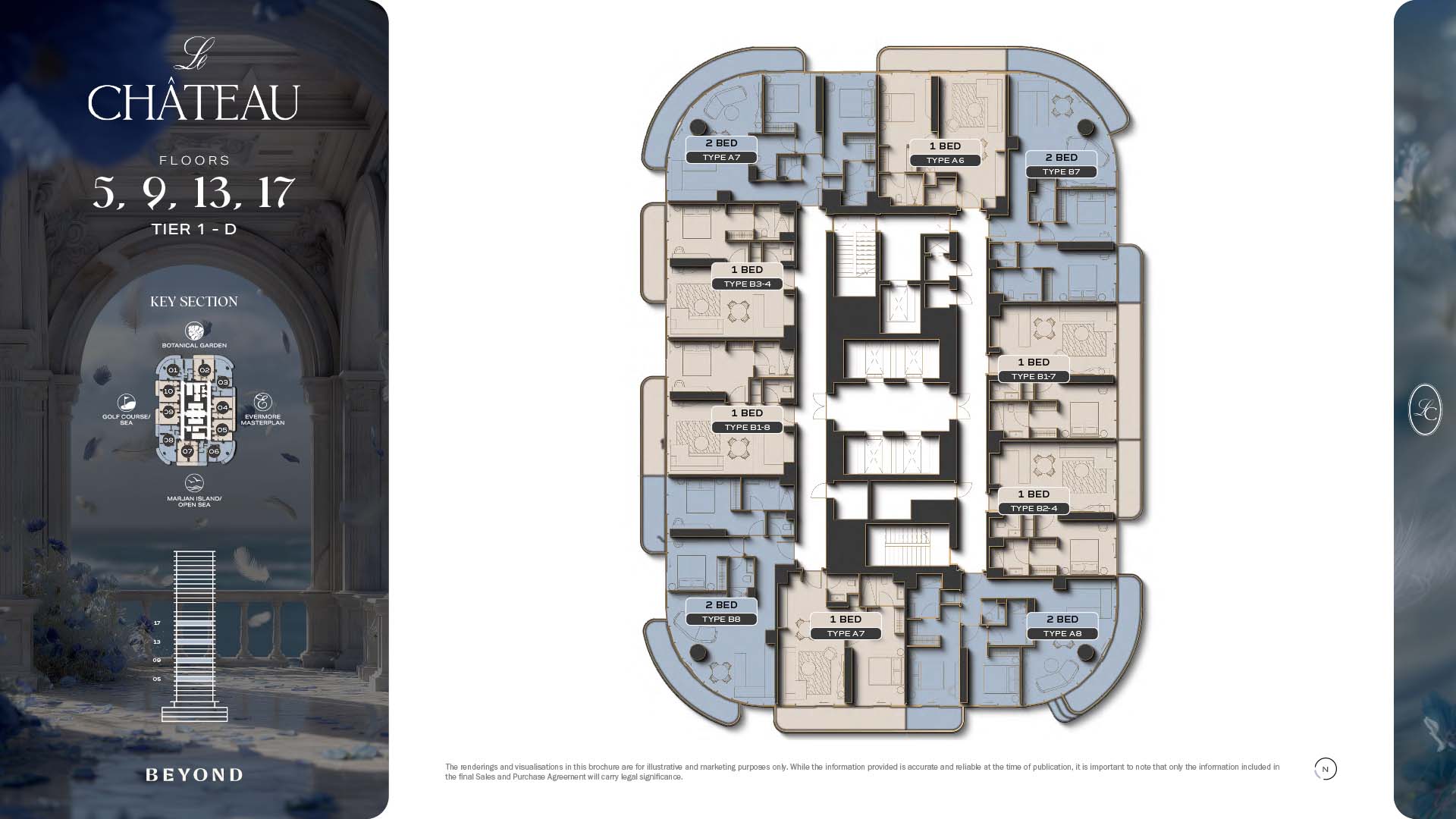 The floor plans of Le Chateau are devised in the way that they resemble effortlessness, balance, and spaciousness within 1, 2 and 3 bedroom apartments. The homes are well designed to make use of natural light, landscapes, and accommodate a use of space. The living and dining areas are open without divisions and they move towards the exterior as large balconies extend the interior areas. Bedrooms are placed in such a way that gives them privacy and calmness with plentiful glazing giving views of sea and skyline. Considerate zoning enables commonplace living, recreation and amusement to co-exist together in harmony.