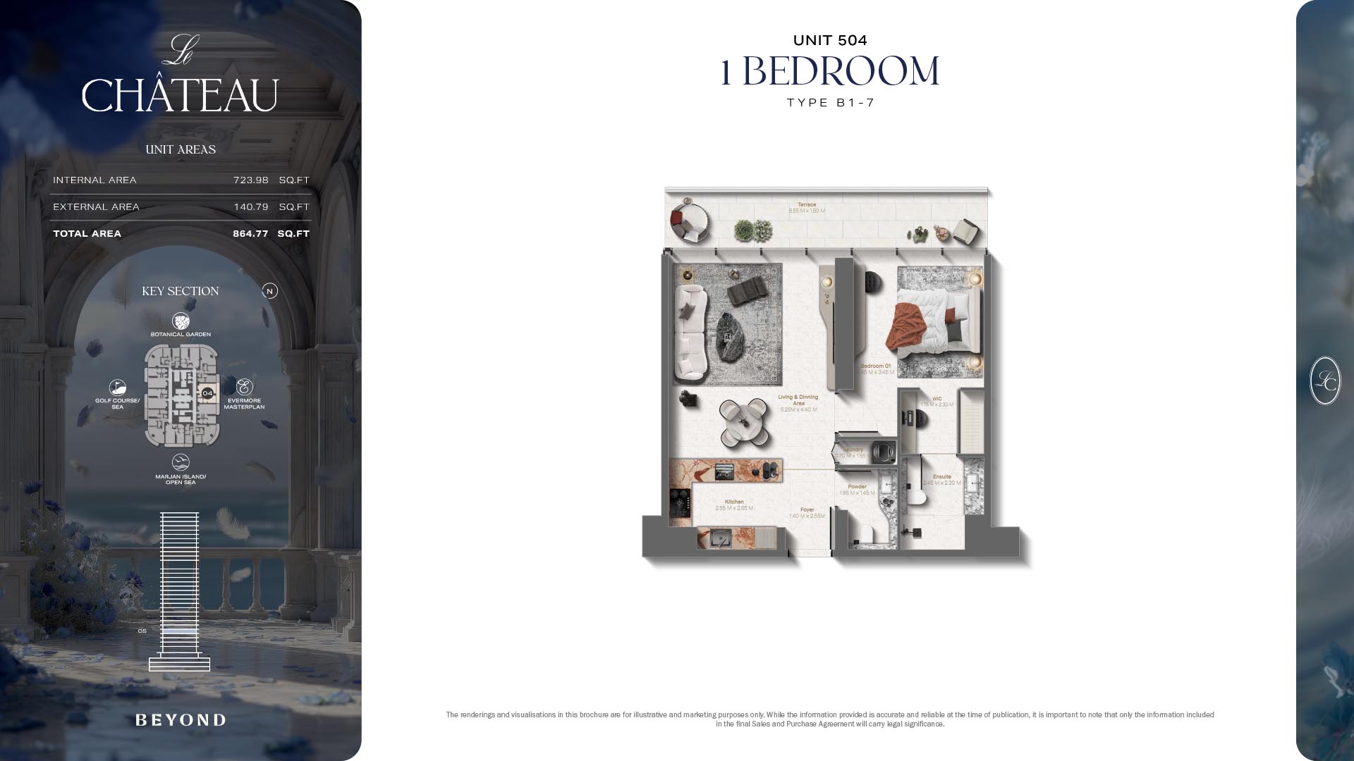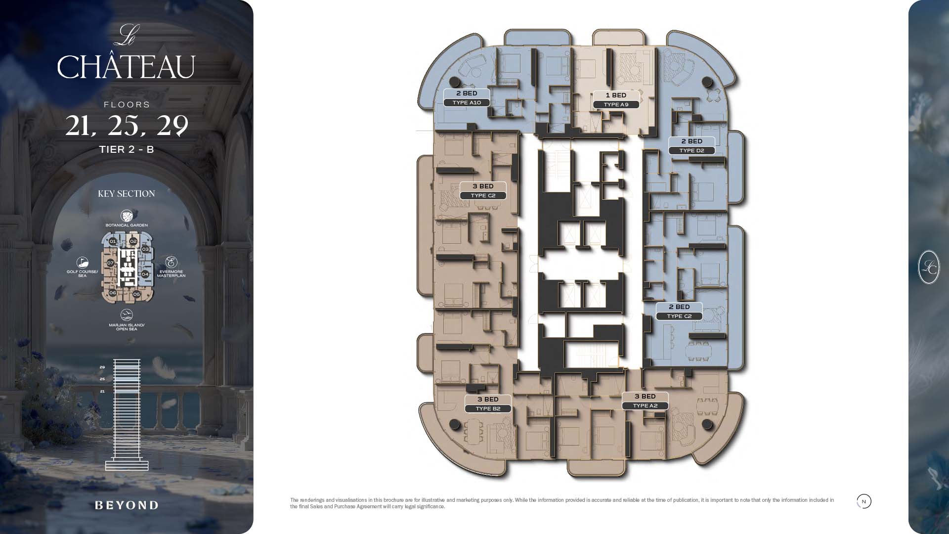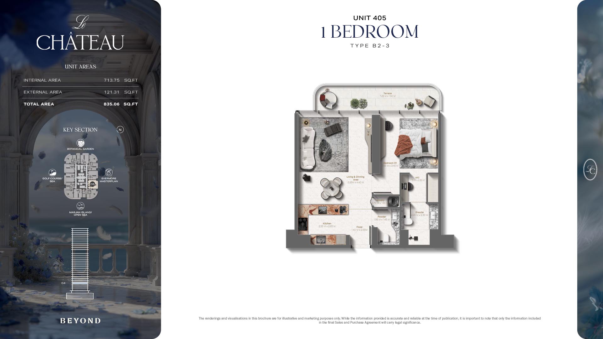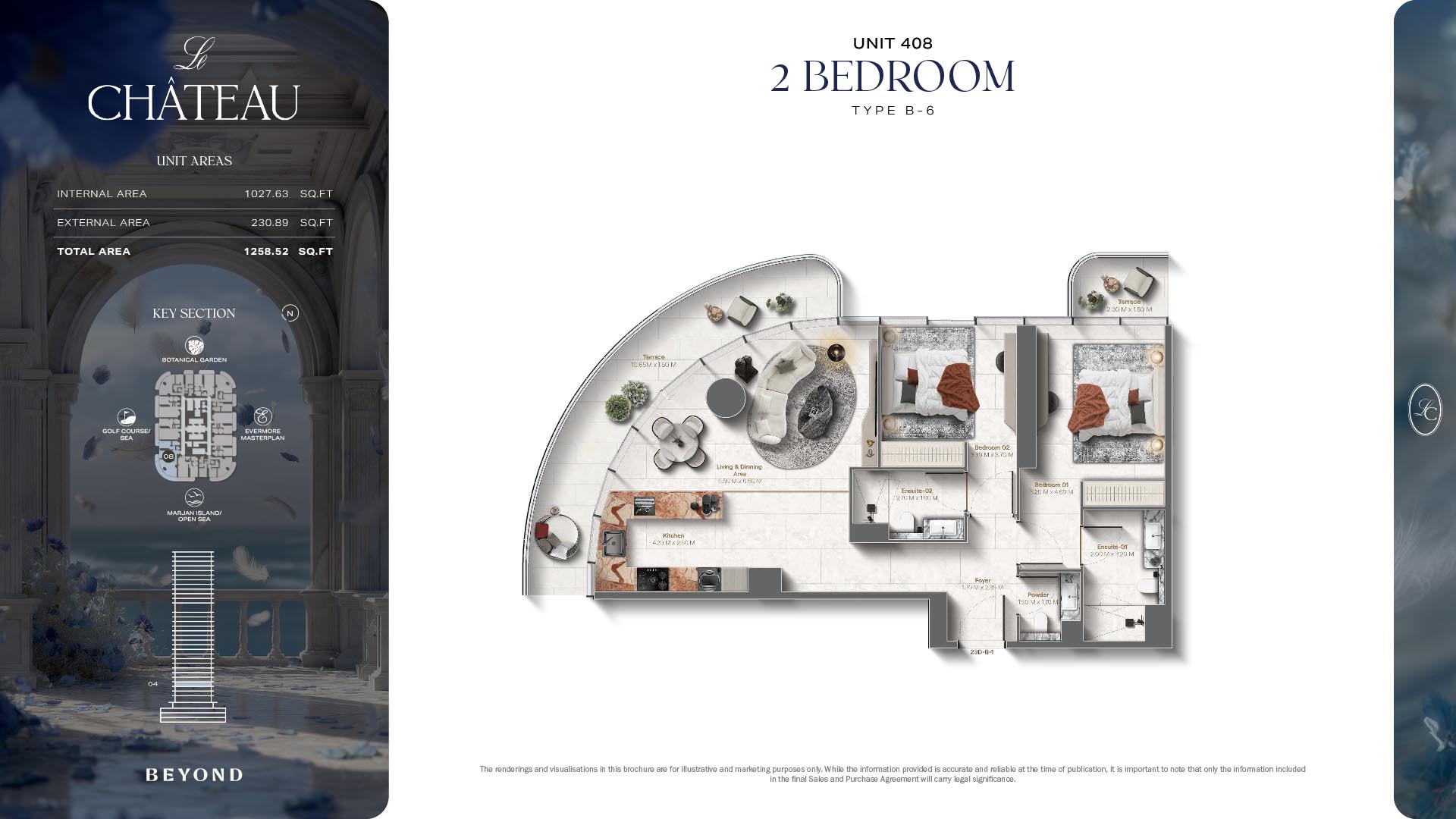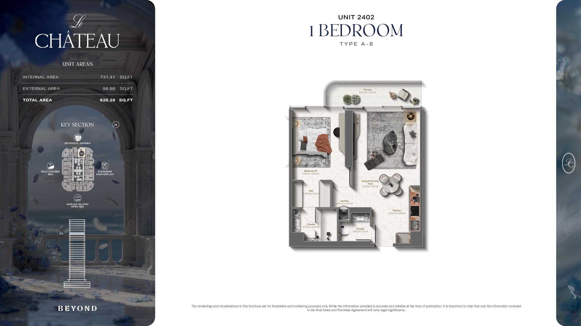 The floor plans of Le Chateau are devised in the way that they resemble effortlessness, balance, and spaciousness within 1, 2 and 3 bedroom apartments. The homes are well designed to make use of natural light, landscapes, and accommodate a use of space. The living and dining areas are open without divisions and they move towards the exterior as large balconies extend the interior areas. Bedrooms are placed in such a way that gives them privacy and calmness with plentiful glazing giving views of sea and skyline. Considerate zoning enables commonplace living, recreation and amusement to co-exist together in harmony.