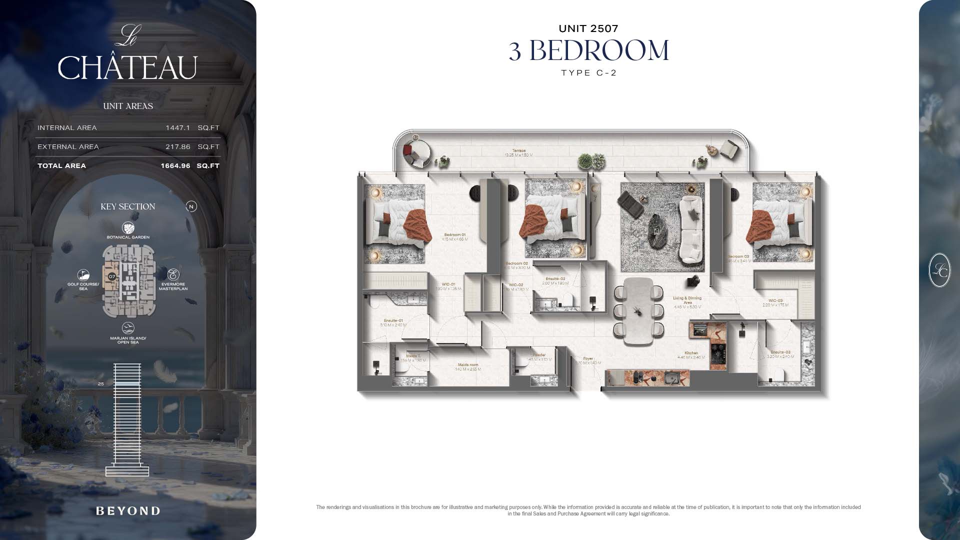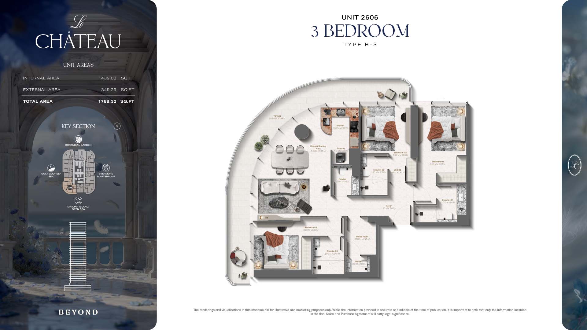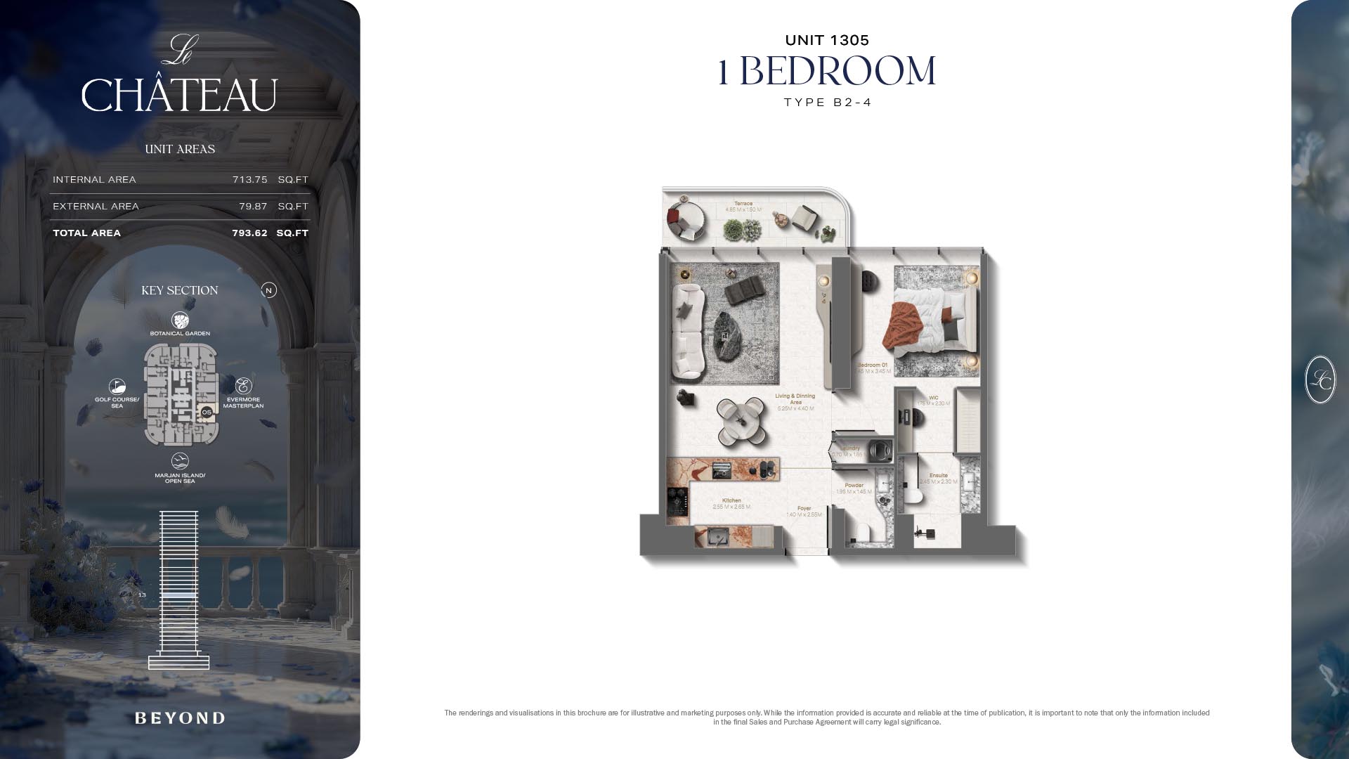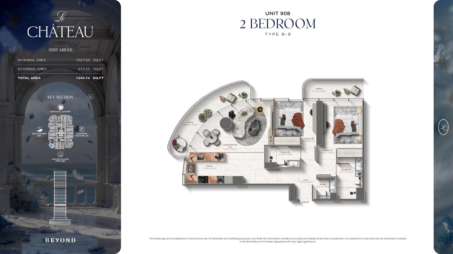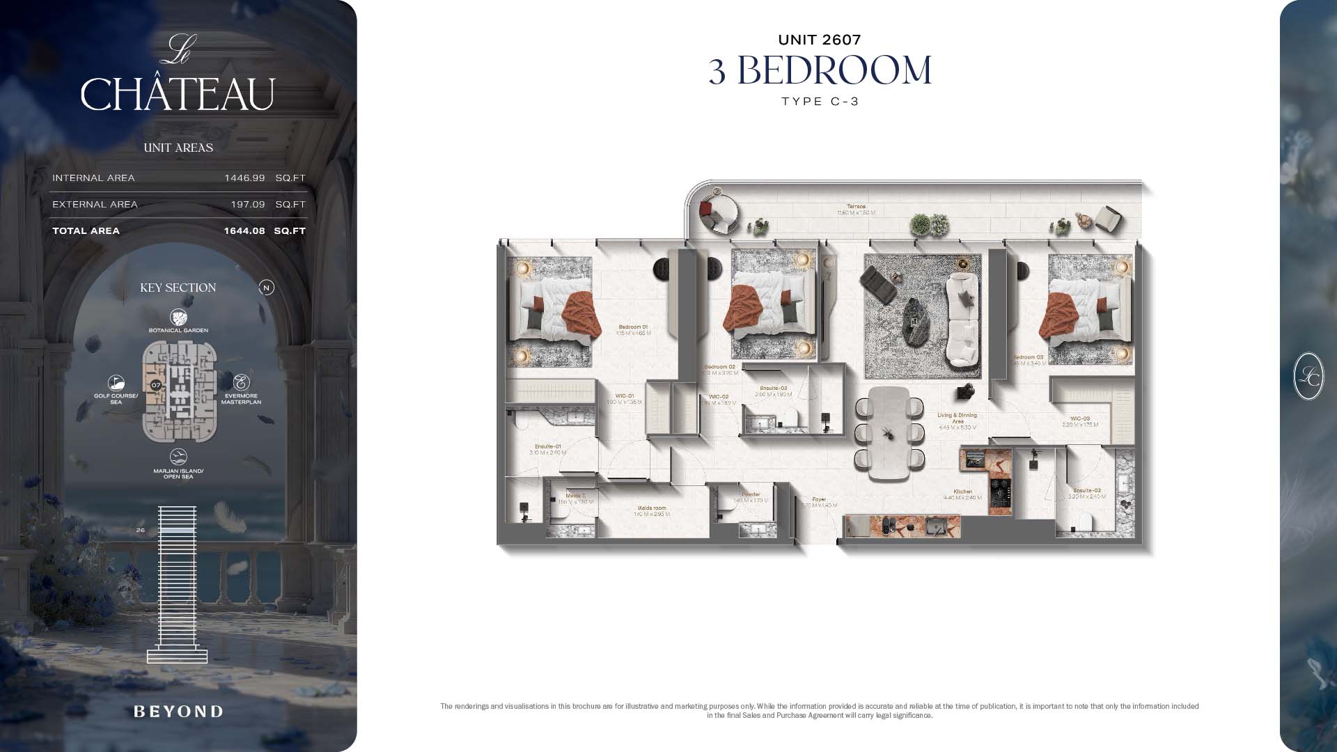 The floor plans of Le Chateau are devised in the way that they resemble effortlessness, balance, and spaciousness within 1, 2 and 3 bedroom apartments. The homes are well designed to make use of natural light, landscapes, and accommodate a use of space. The living and dining areas are open without divisions and they move towards the exterior as large balconies extend the interior areas. Bedrooms are placed in such a way that gives them privacy and calmness with plentiful glazing giving views of sea and skyline. Considerate zoning enables commonplace living, recreation and amusement to co-exist together in harmony.