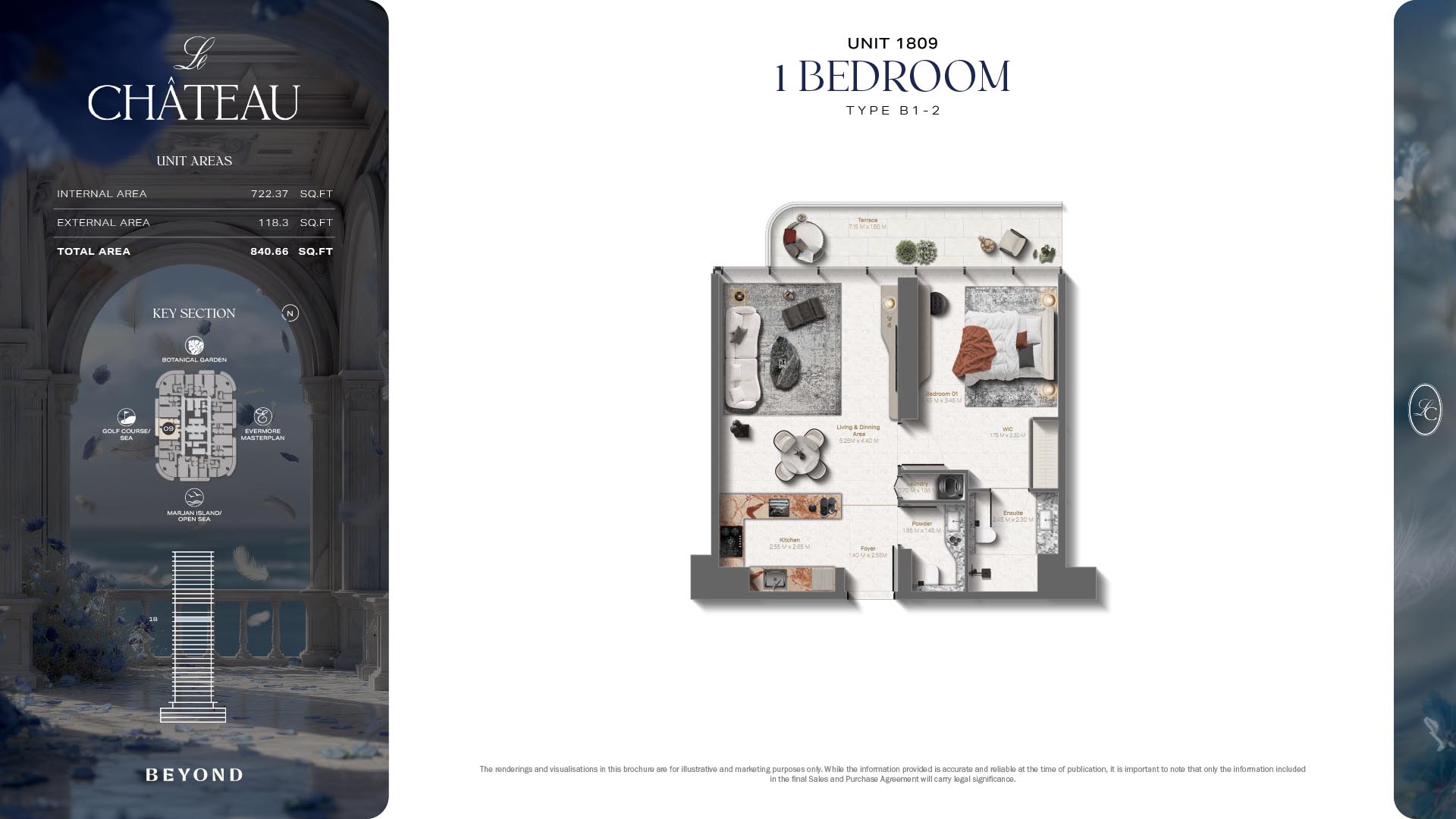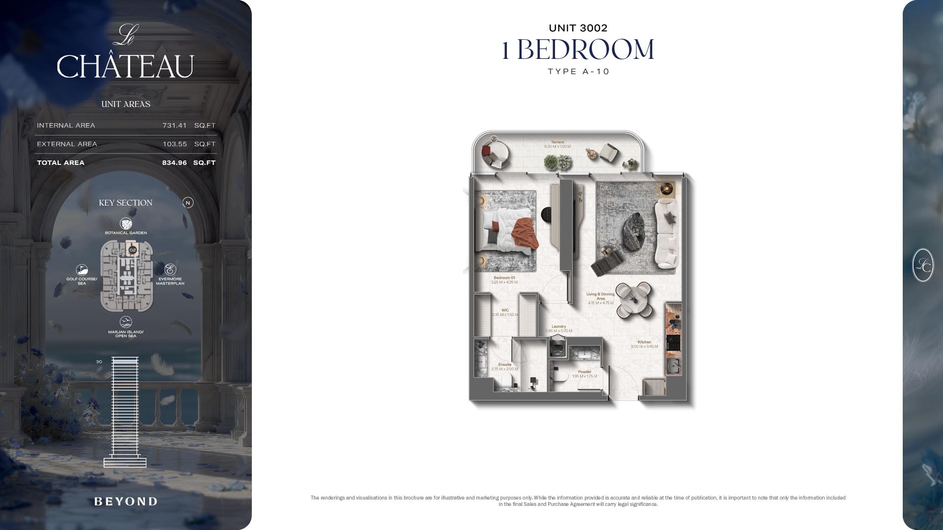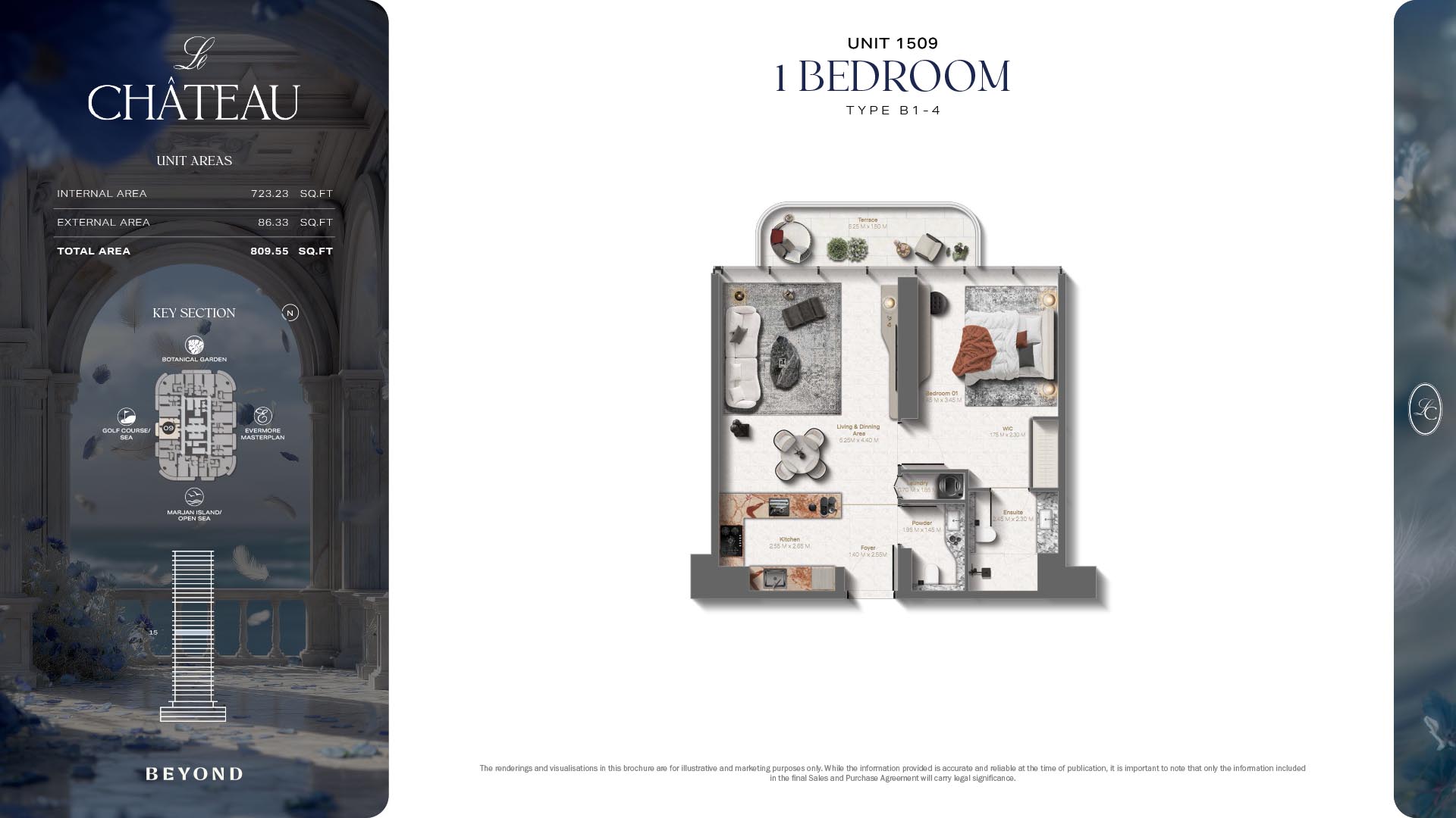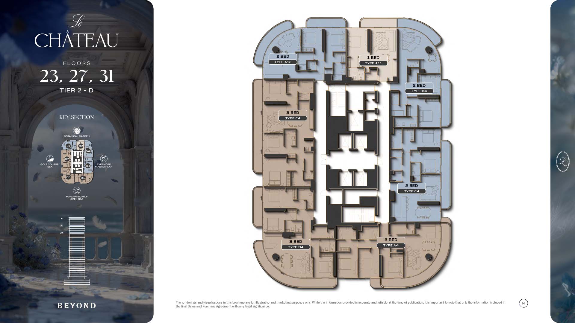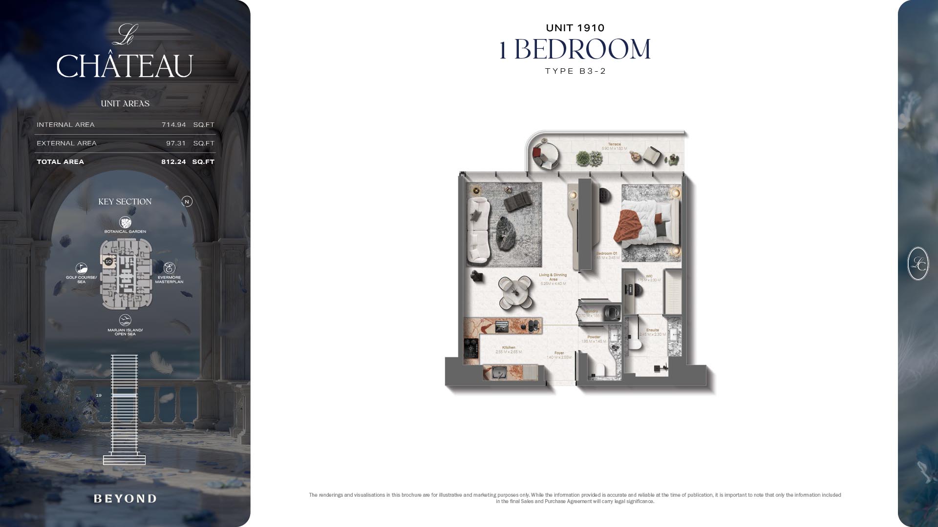 The floor plans of Le Chateau are devised in the way that they resemble effortlessness, balance, and spaciousness within 1, 2 and 3 bedroom apartments. The homes are well designed to make use of natural light, landscapes, and accommodate a use of space. The living and dining areas are open without divisions and they move towards the exterior as large balconies extend the interior areas. Bedrooms are placed in such a way that gives them privacy and calmness with plentiful glazing giving views of sea and skyline. Considerate zoning enables commonplace living, recreation and amusement to co-exist together in harmony.
