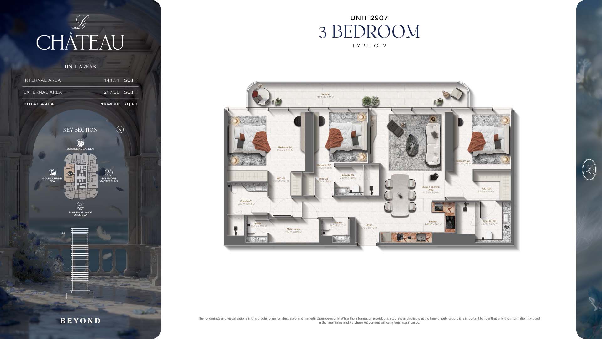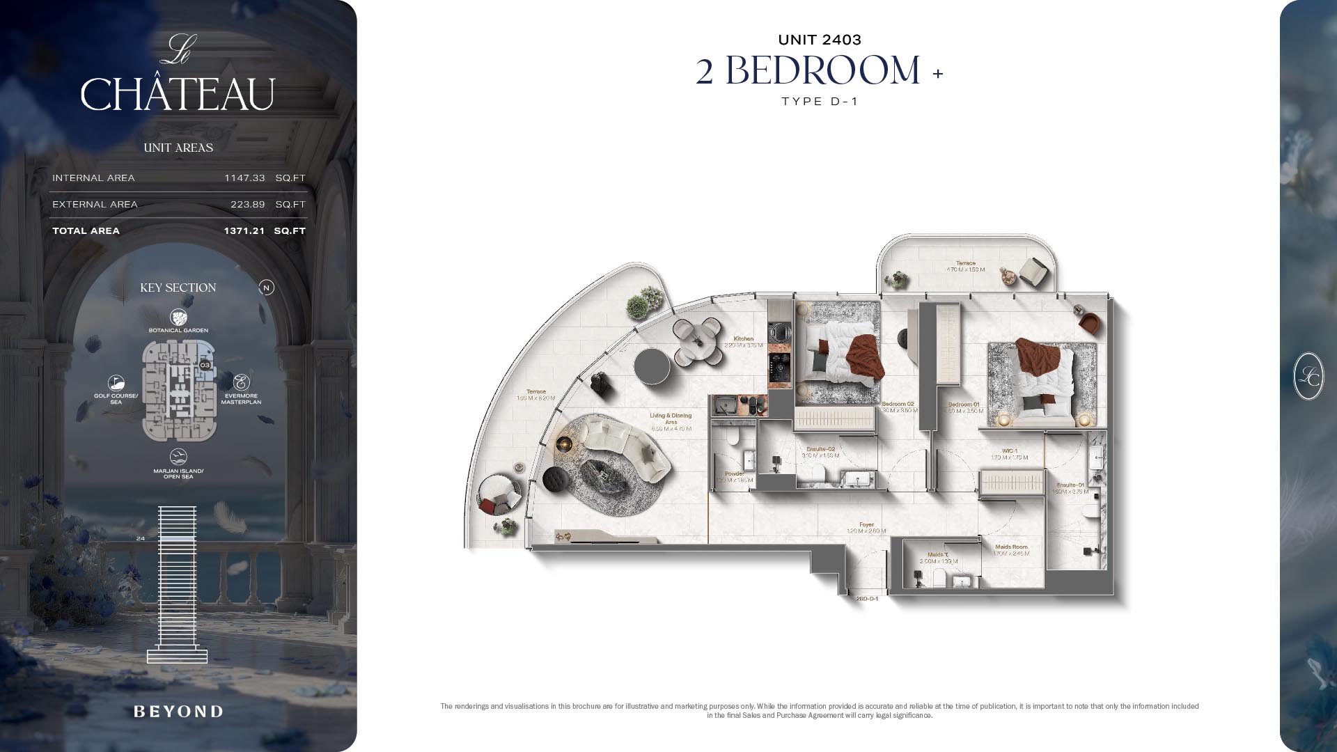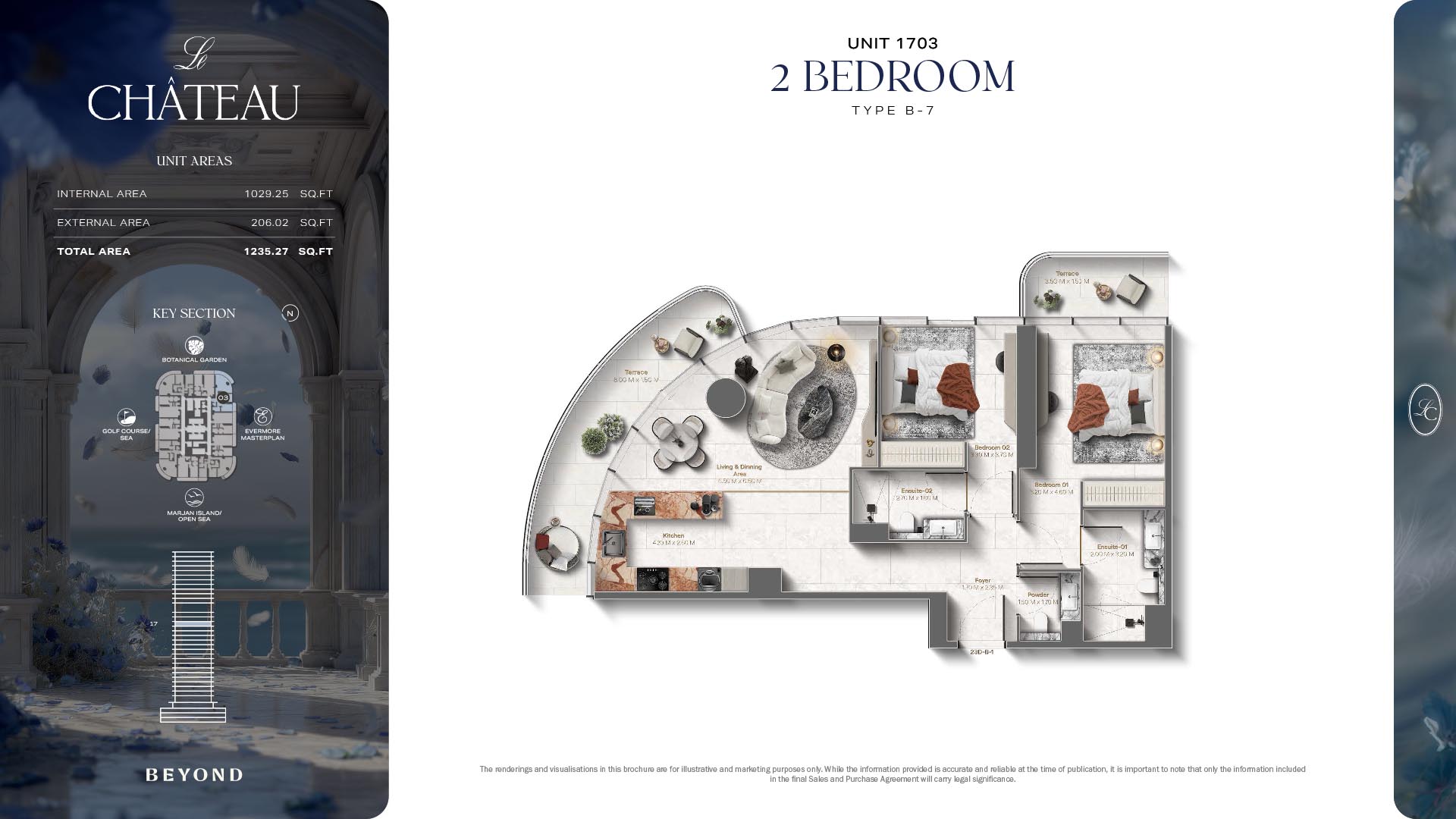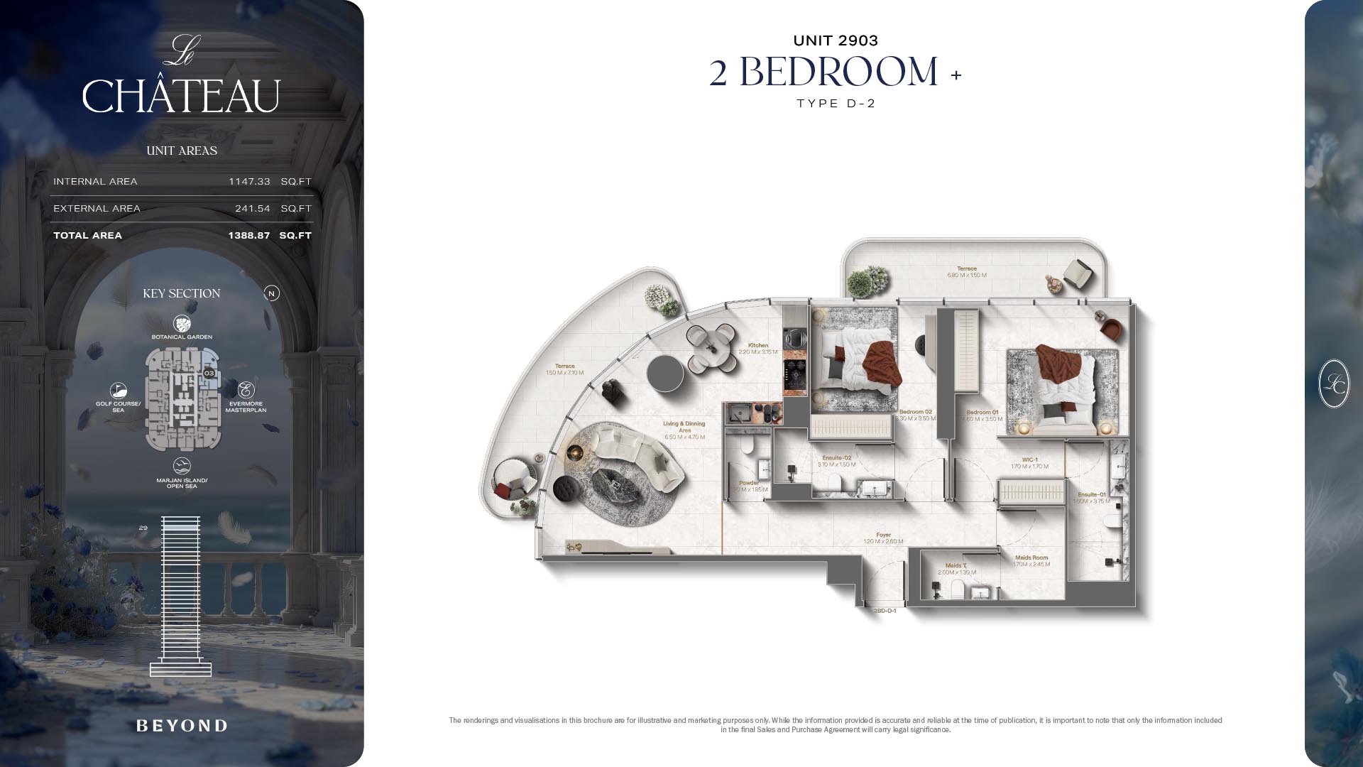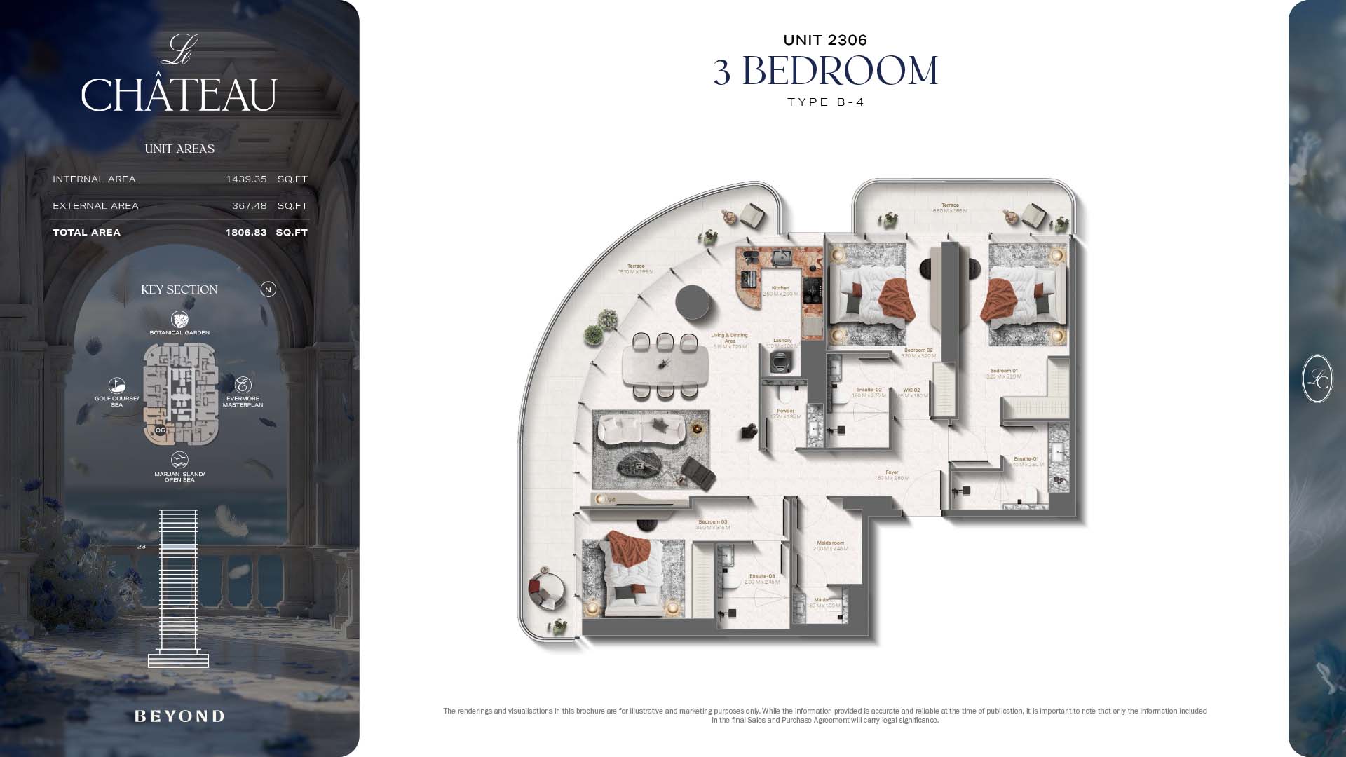 The floor plans of Le Chateau are devised in the way that they resemble effortlessness, balance, and spaciousness within 1, 2 and 3 bedroom apartments. The homes are well designed to make use of natural light, landscapes, and accommodate a use of space. The living and dining areas are open without divisions and they move towards the exterior as large balconies extend the interior areas. Bedrooms are placed in such a way that gives them privacy and calmness with plentiful glazing giving views of sea and skyline. Considerate zoning enables commonplace living, recreation and amusement to co-exist together in harmony.