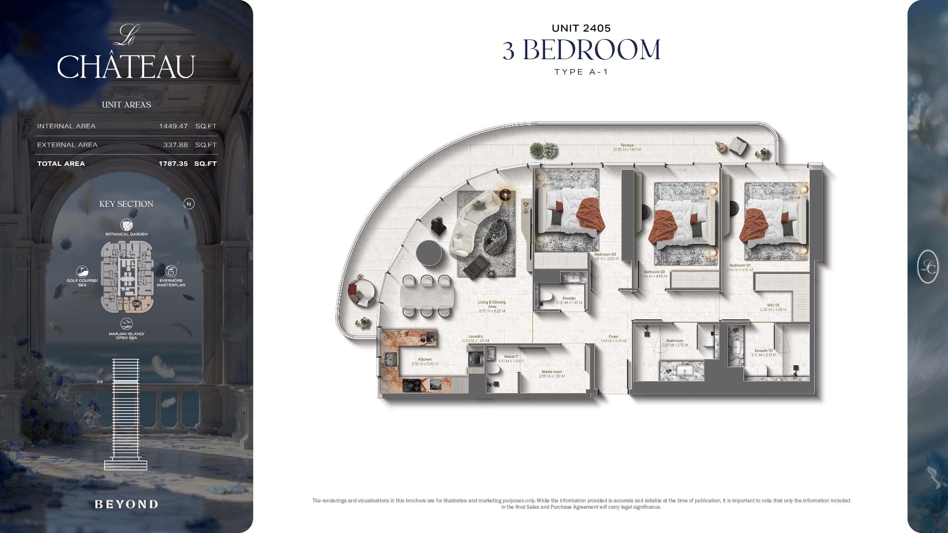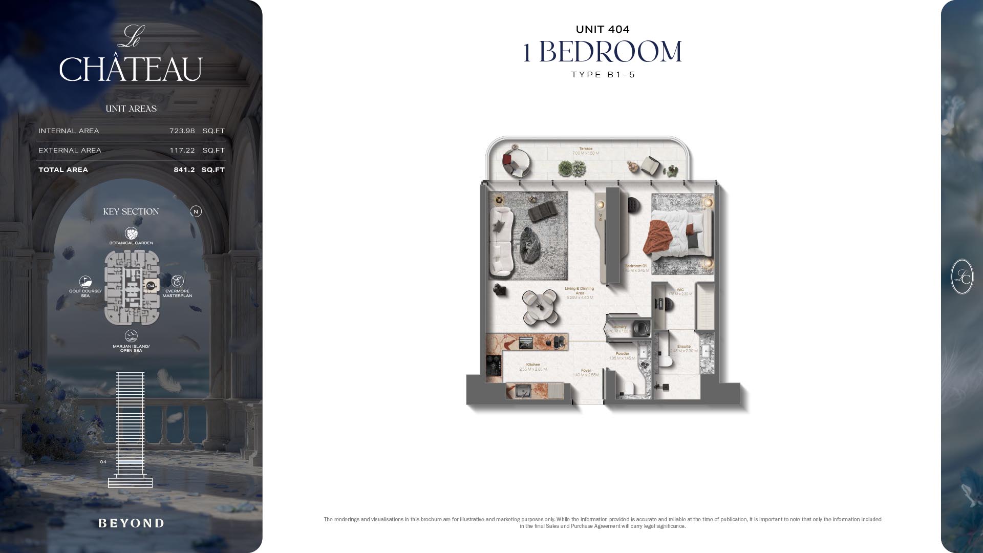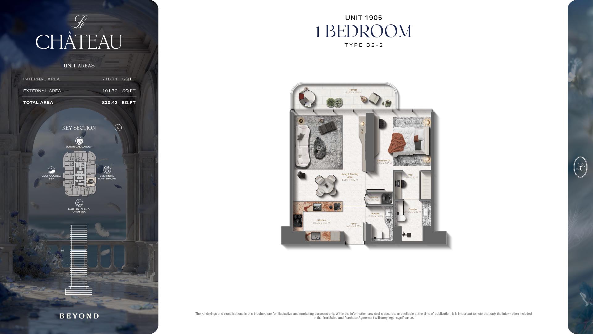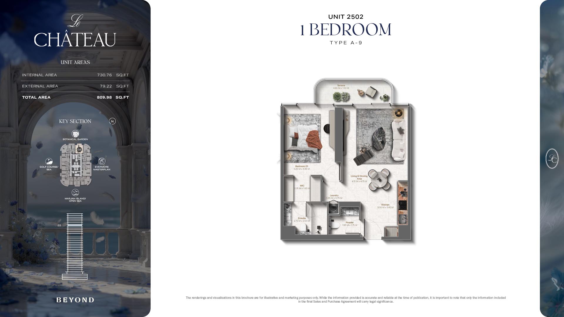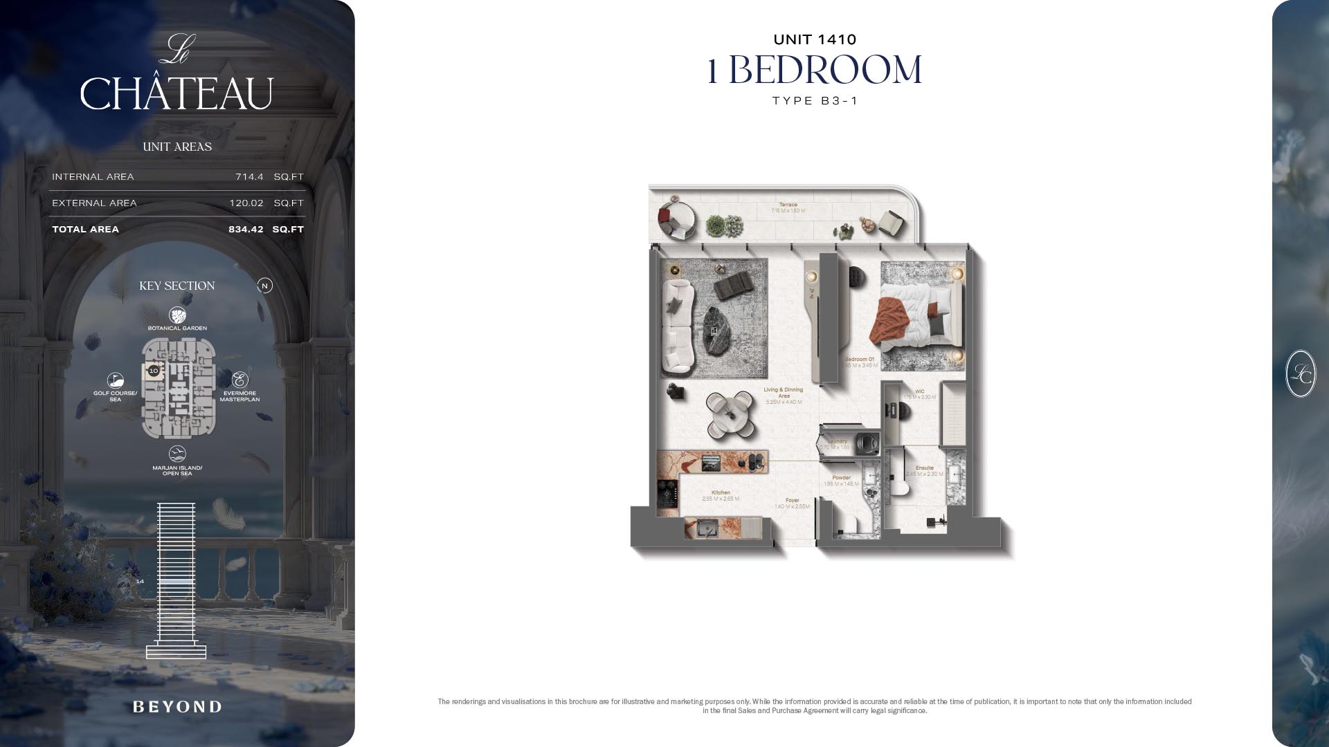 The floor plans of Le Chateau are devised in the way that they resemble effortlessness, balance, and spaciousness within 1, 2 and 3 bedroom apartments. The homes are well designed to make use of natural light, landscapes, and accommodate a use of space. The living and dining areas are open without divisions and they move towards the exterior as large balconies extend the interior areas. Bedrooms are placed in such a way that gives them privacy and calmness with plentiful glazing giving views of sea and skyline. Considerate zoning enables commonplace living, recreation and amusement to co-exist together in harmony.