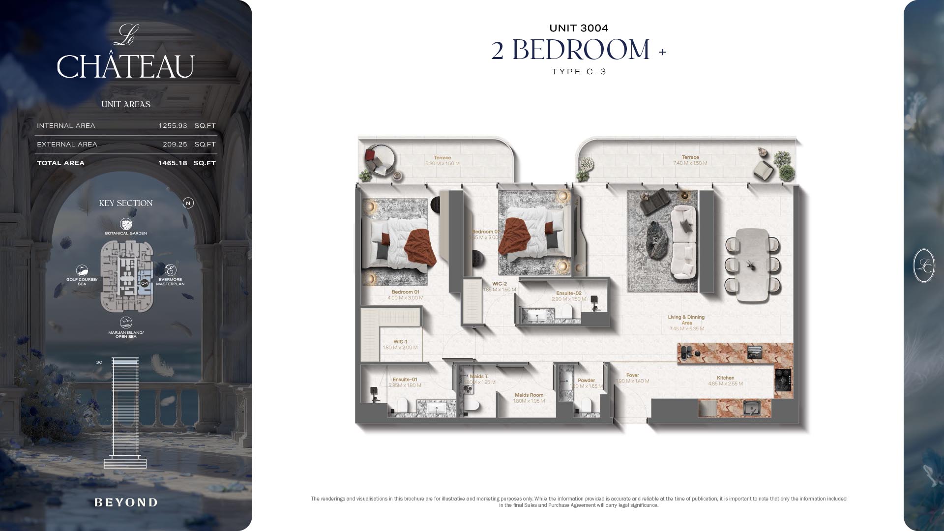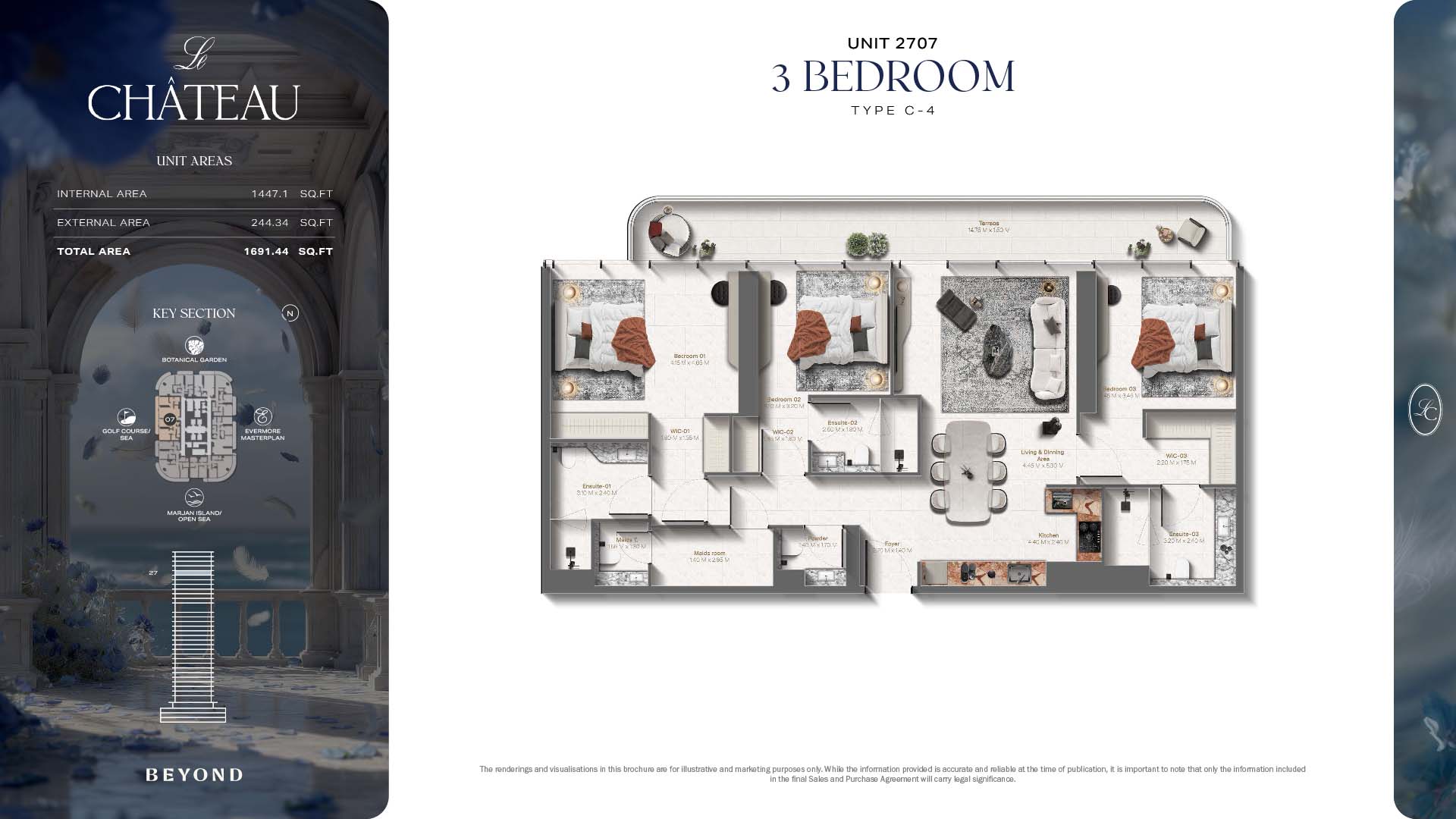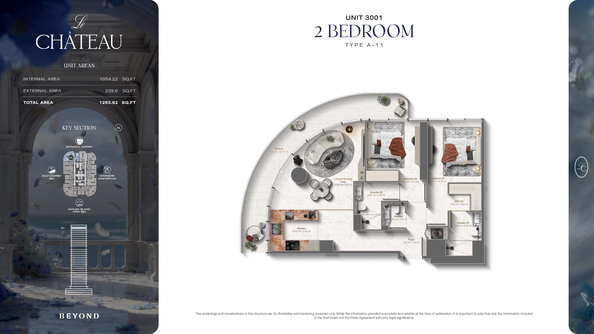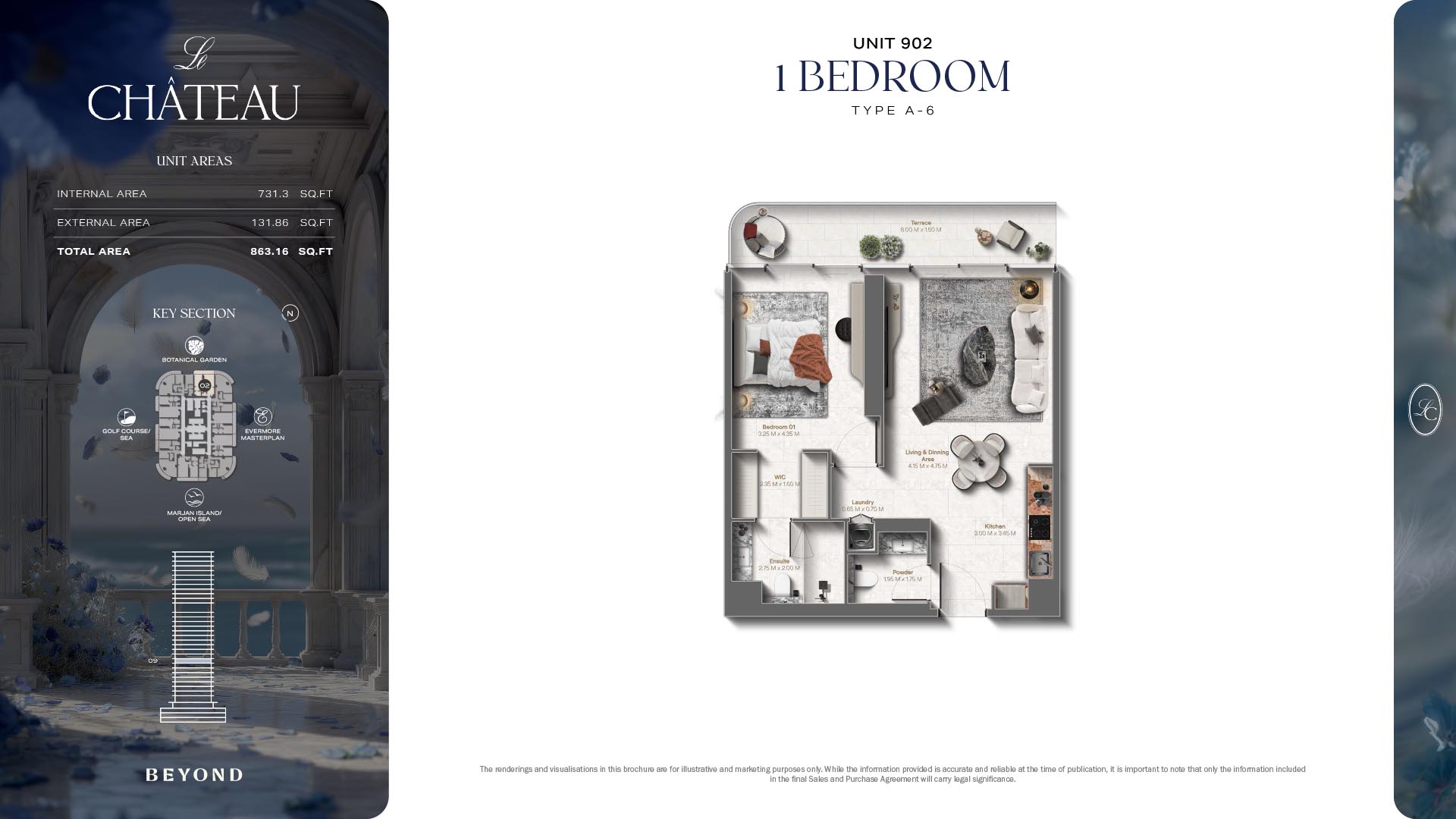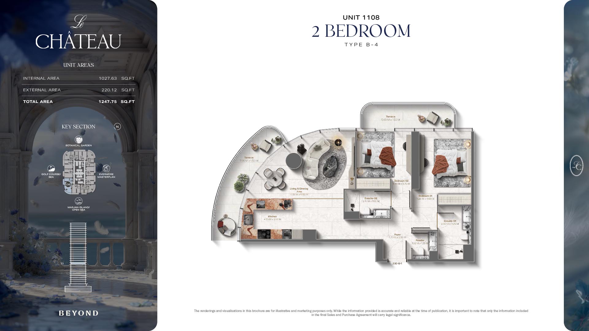 The floor plans of Le Chateau are devised in the way that they resemble effortlessness, balance, and spaciousness within 1, 2 and 3 bedroom apartments. The homes are well designed to make use of natural light, landscapes, and accommodate a use of space. The living and dining areas are open without divisions and they move towards the exterior as large balconies extend the interior areas. Bedrooms are placed in such a way that gives them privacy and calmness with plentiful glazing giving views of sea and skyline. Considerate zoning enables commonplace living, recreation and amusement to co-exist together in harmony.