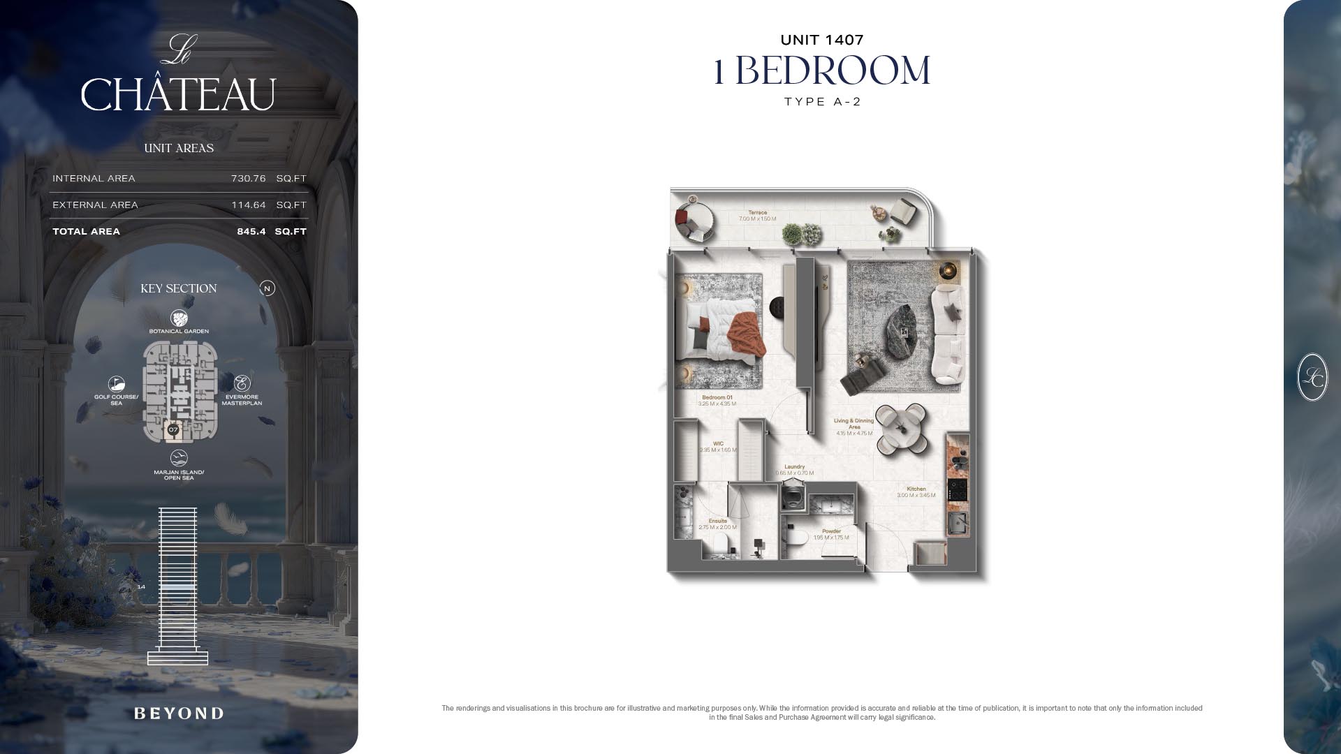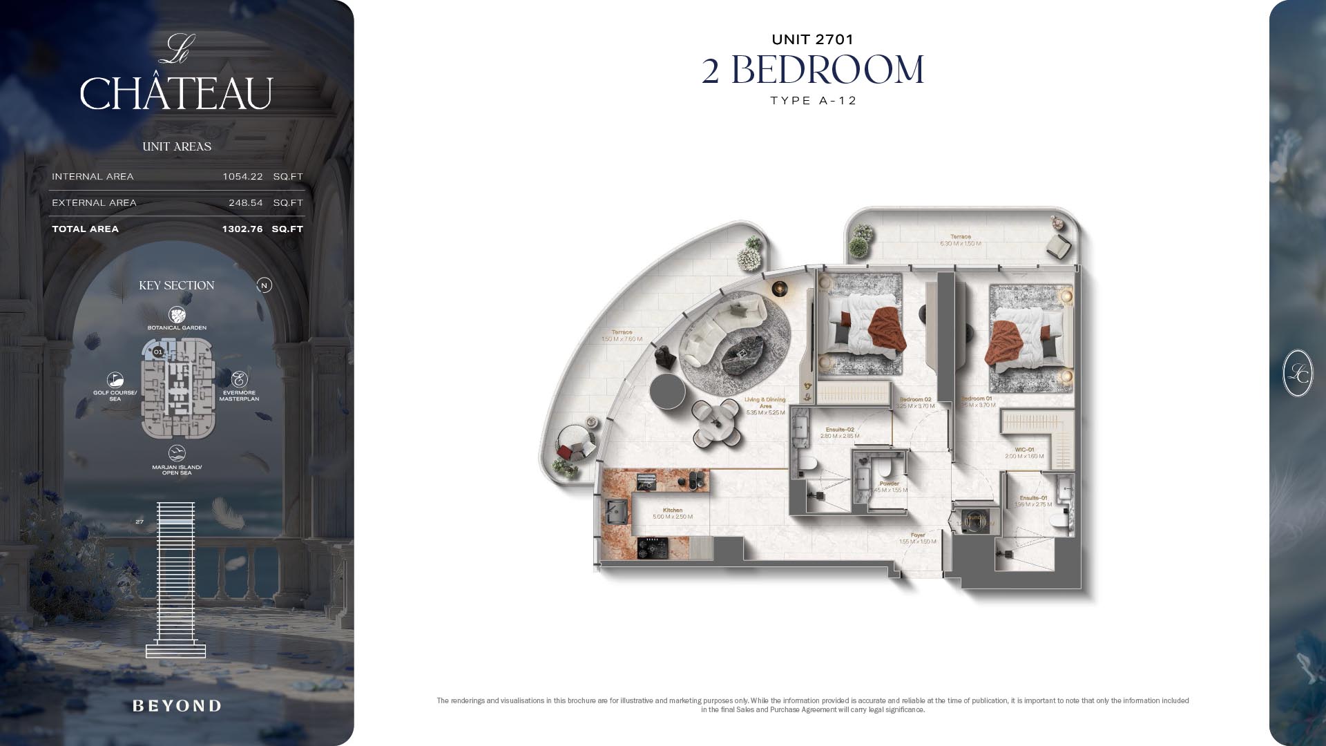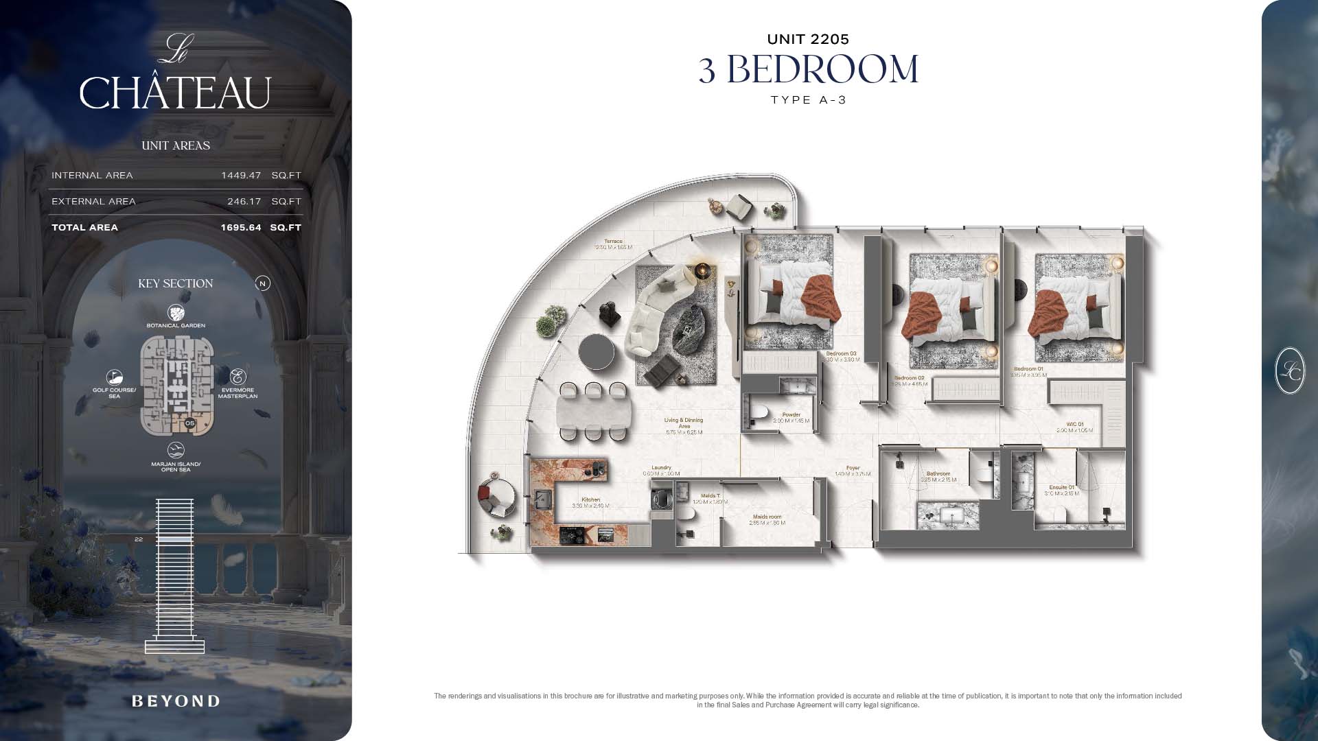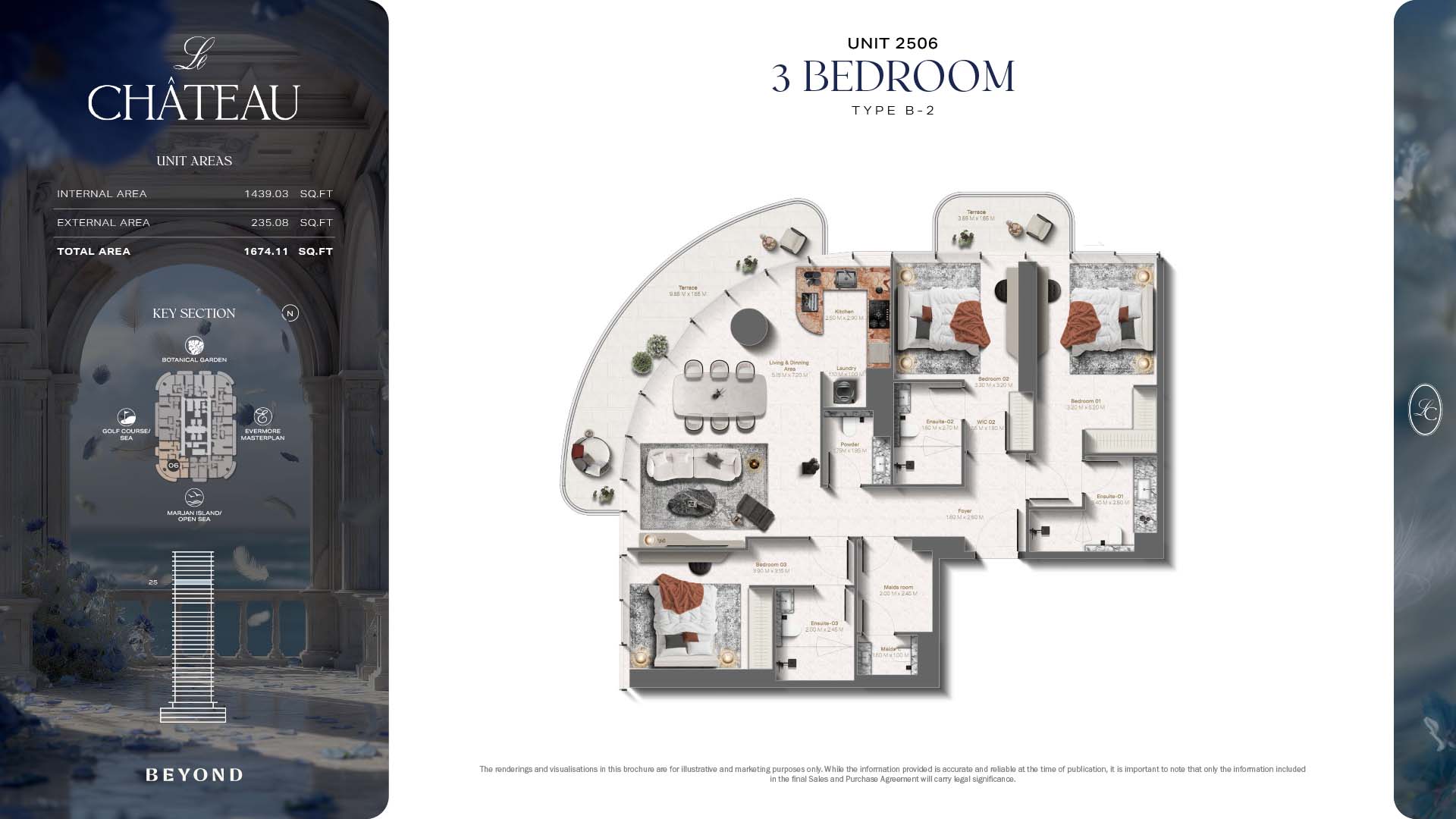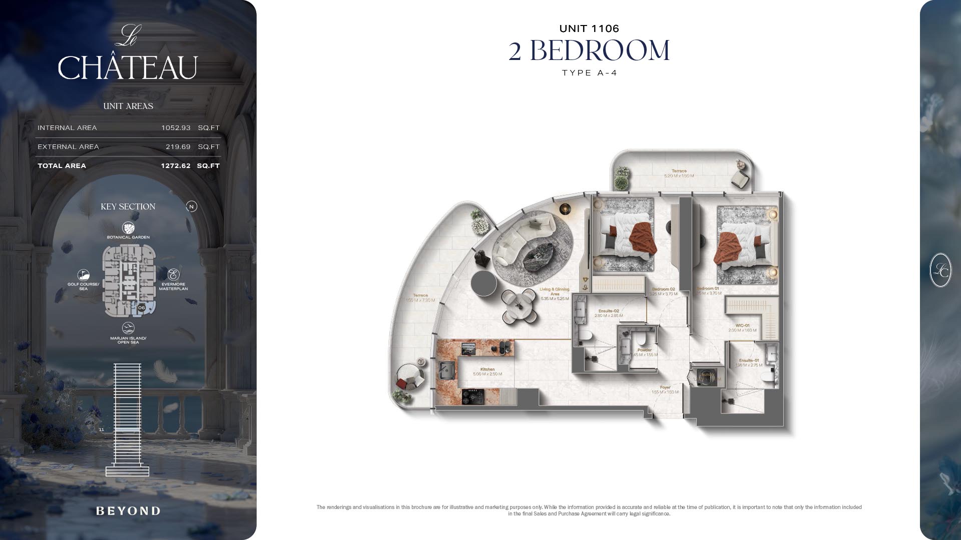 The floor plans of Le Chateau are devised in the way that they resemble effortlessness, balance, and spaciousness within 1, 2 and 3 bedroom apartments. The homes are well designed to make use of natural light, landscapes, and accommodate a use of space. The living and dining areas are open without divisions and they move towards the exterior as large balconies extend the interior areas. Bedrooms are placed in such a way that gives them privacy and calmness with plentiful glazing giving views of sea and skyline. Considerate zoning enables commonplace living, recreation and amusement to co-exist together in harmony.