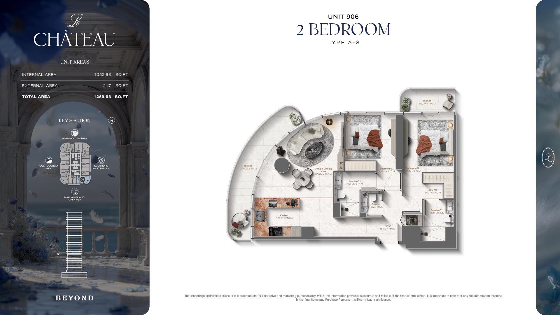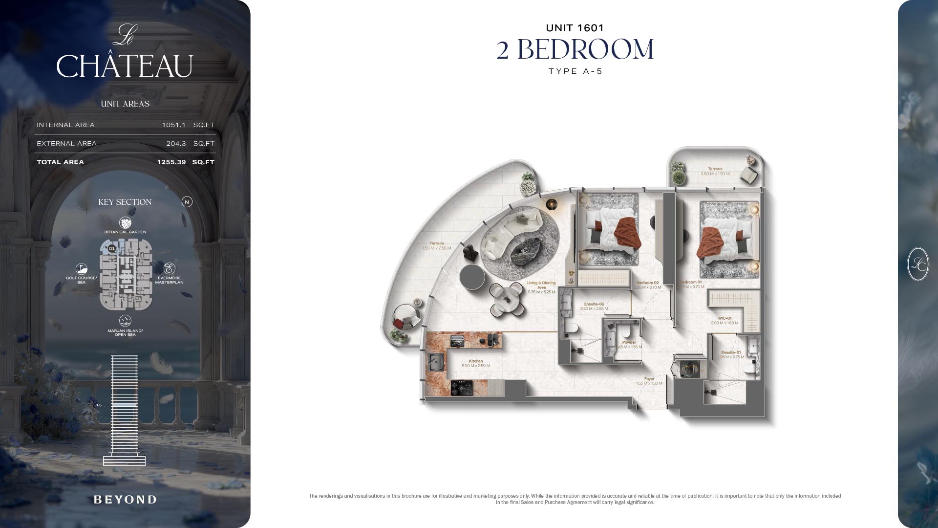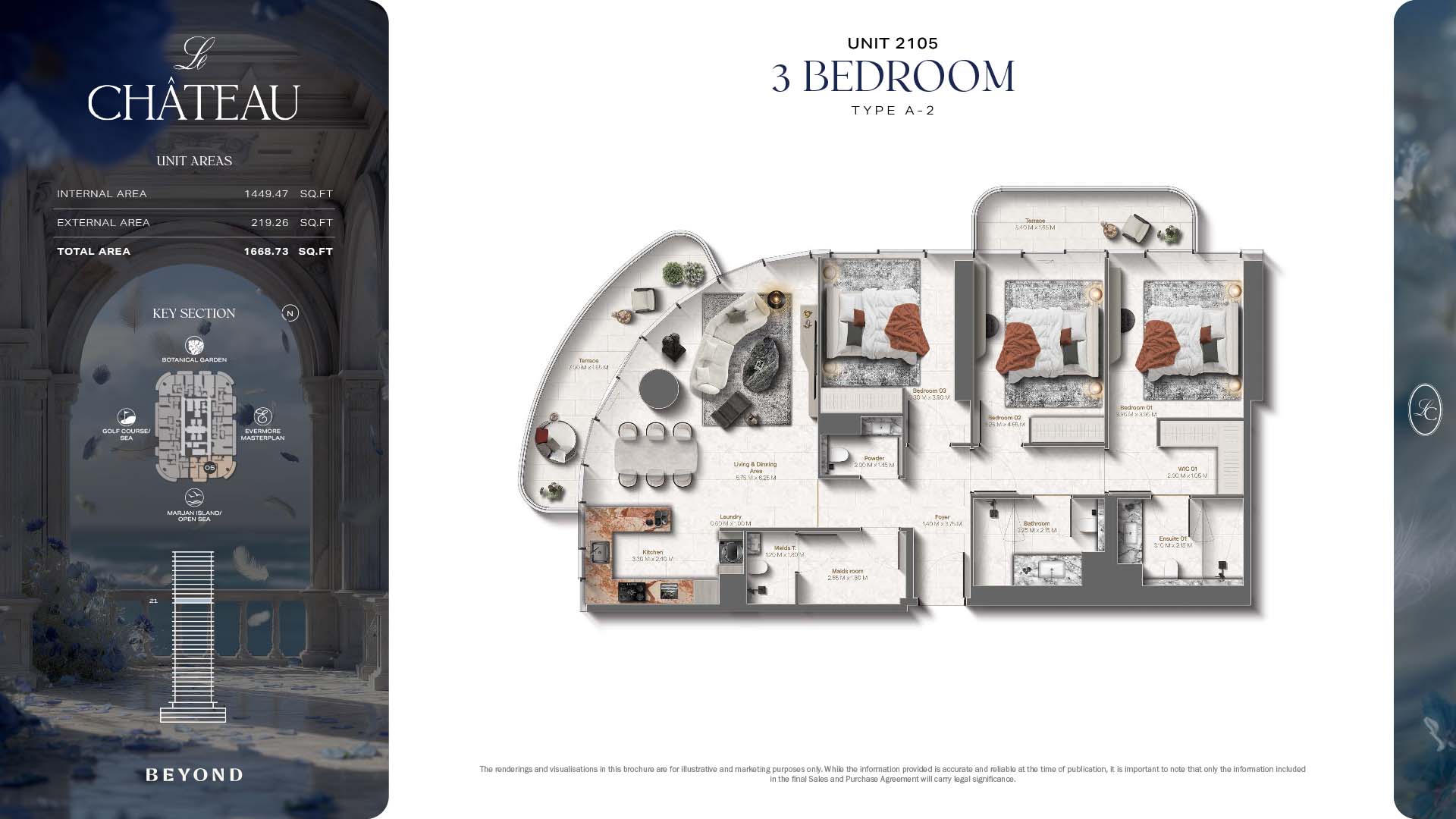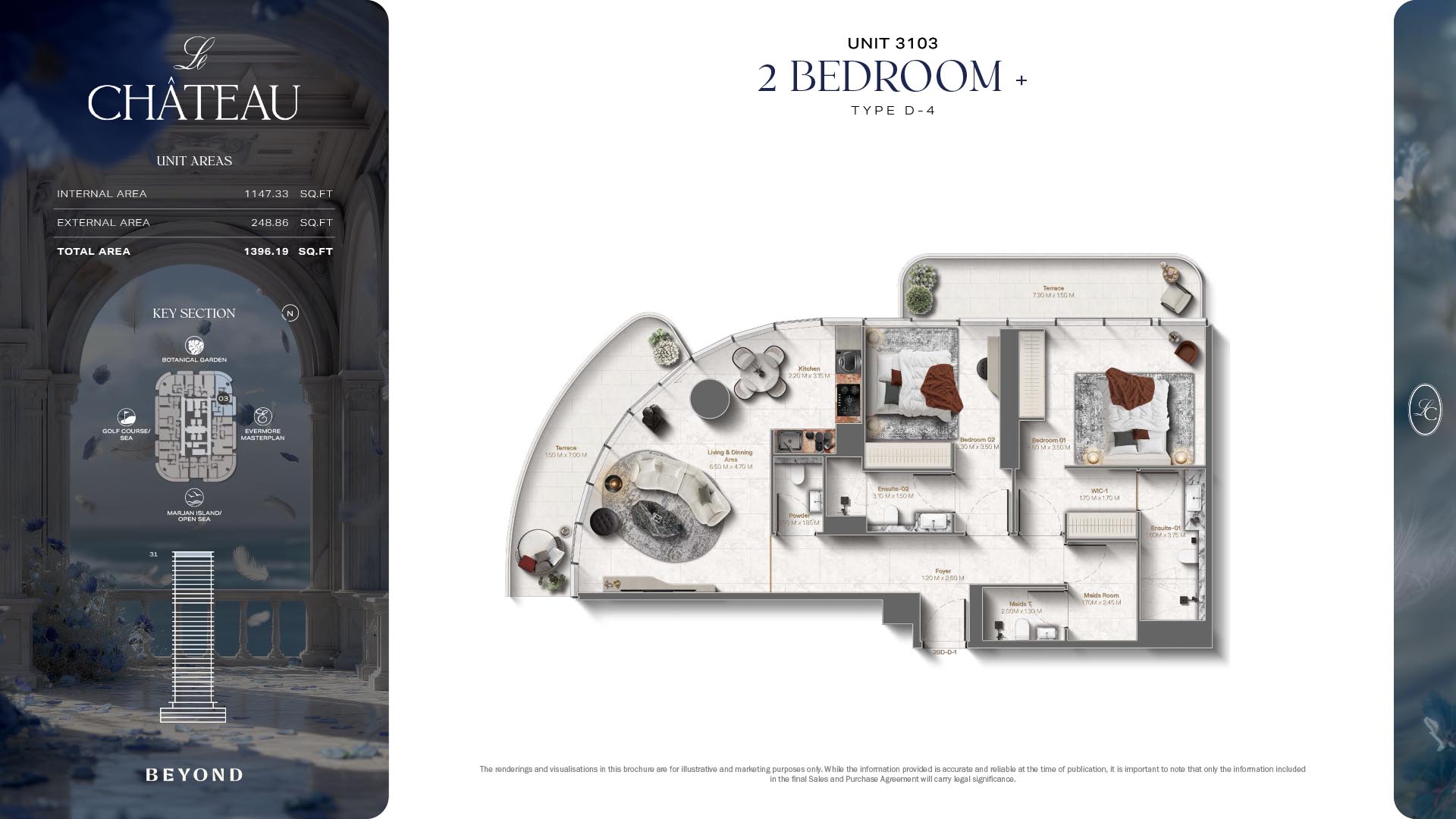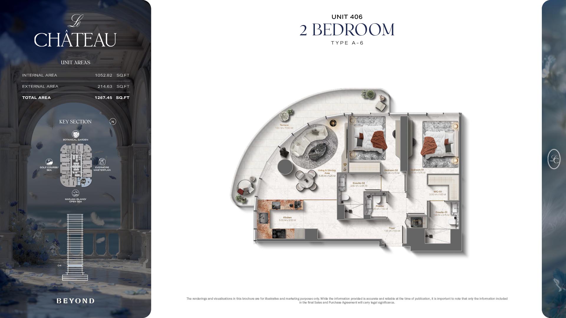 The floor plans of Le Chateau are devised in the way that they resemble effortlessness, balance, and spaciousness within 1, 2 and 3 bedroom apartments. The homes are well designed to make use of natural light, landscapes, and accommodate a use of space. The living and dining areas are open without divisions and they move towards the exterior as large balconies extend the interior areas. Bedrooms are placed in such a way that gives them privacy and calmness with plentiful glazing giving views of sea and skyline. Considerate zoning enables commonplace living, recreation and amusement to co-exist together in harmony.