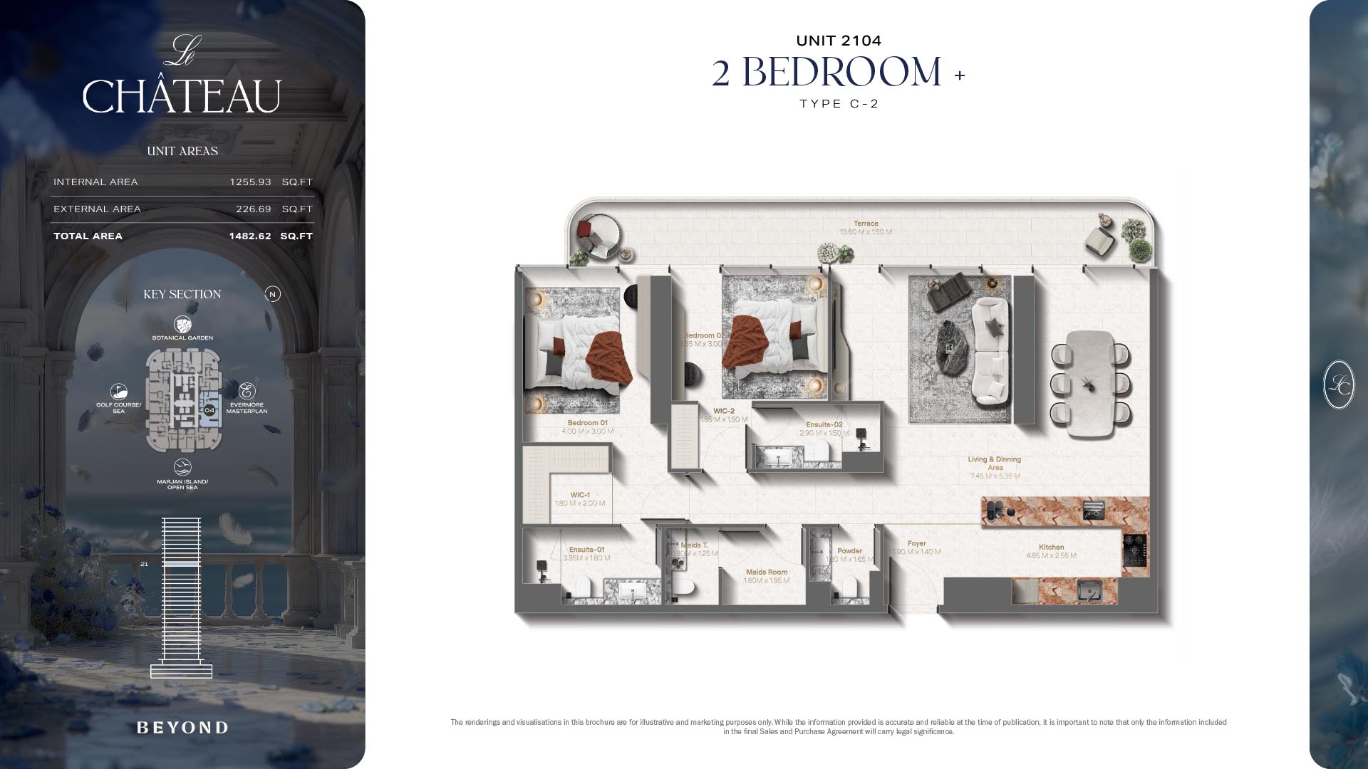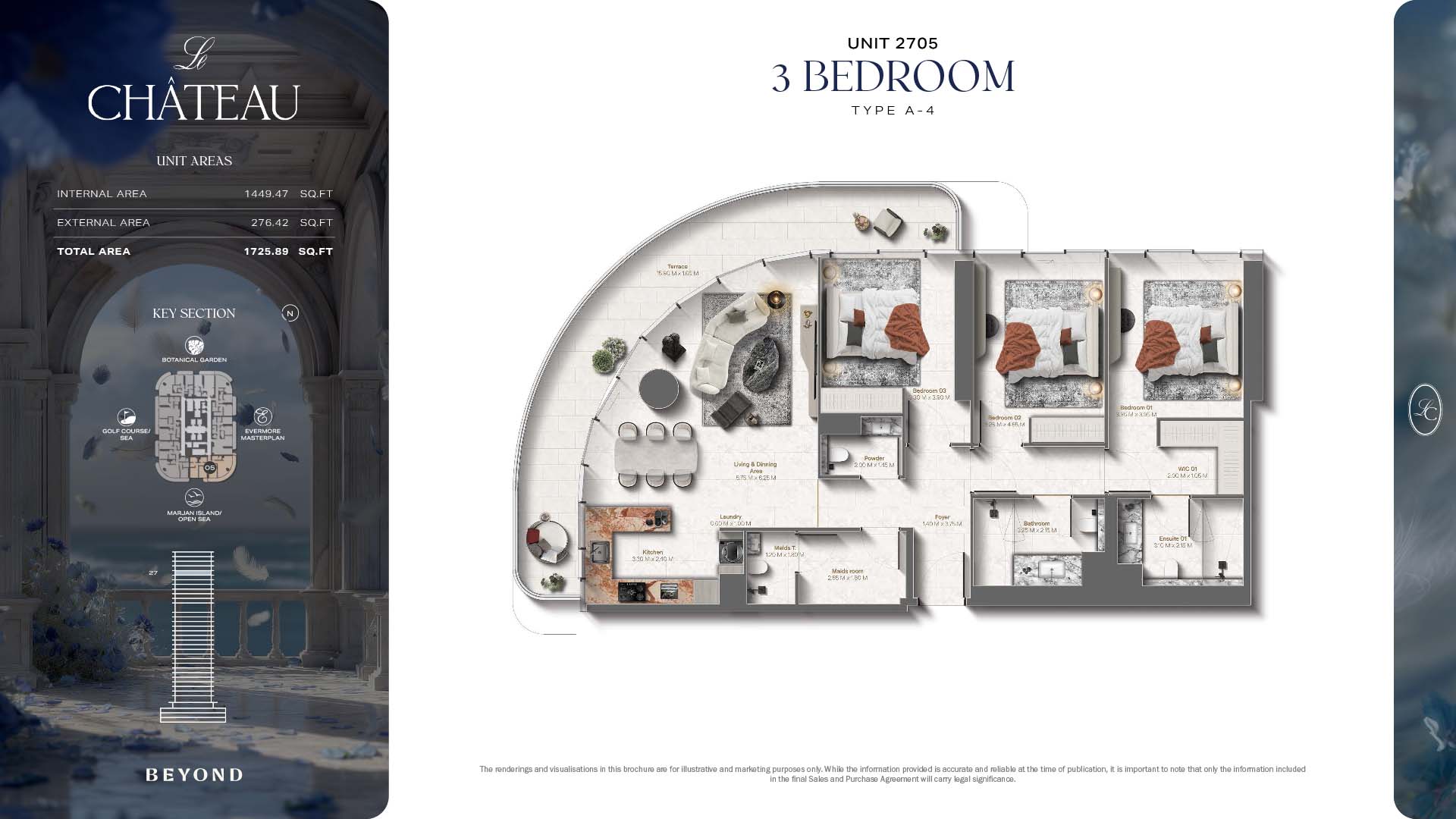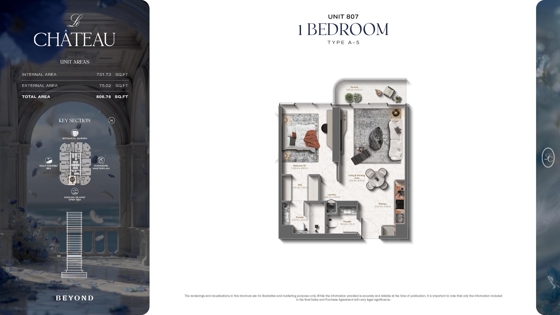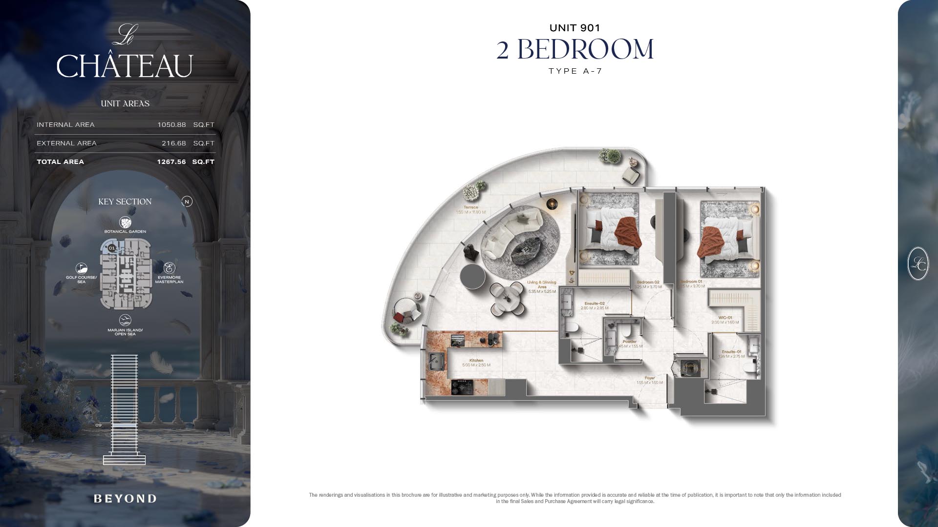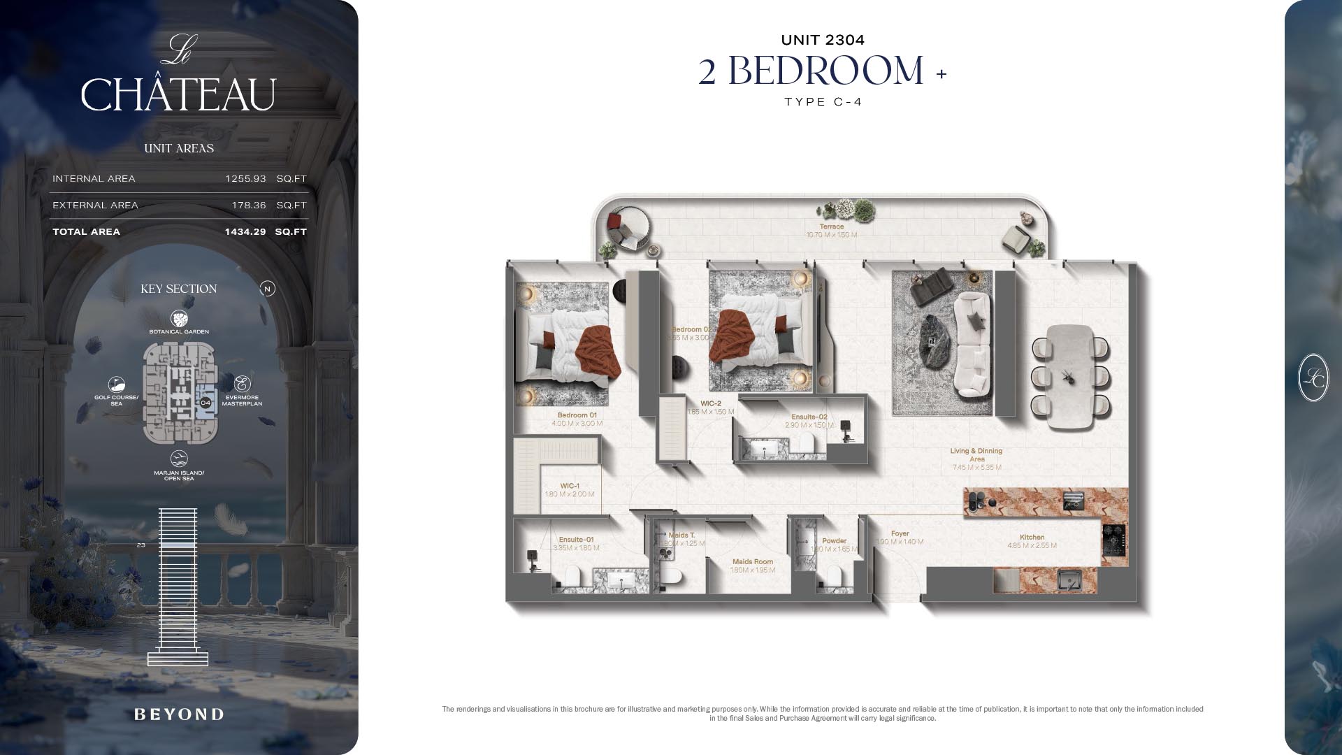 The floor plans of Le Chateau are devised in the way that they resemble effortlessness, balance, and spaciousness within 1, 2 and 3 bedroom apartments. The homes are well designed to make use of natural light, landscapes, and accommodate a use of space. The living and dining areas are open without divisions and they move towards the exterior as large balconies extend the interior areas. Bedrooms are placed in such a way that gives them privacy and calmness with plentiful glazing giving views of sea and skyline. Considerate zoning enables commonplace living, recreation and amusement to co-exist together in harmony.