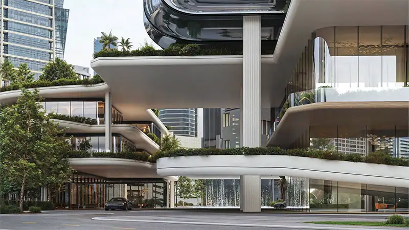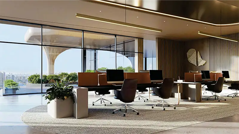 There are a total of 91 distinctive offices with different sizes, where the 30 units are half-floor offices, 2 units full floor offices, and 59 units of offices with diverse styles and sizes catered to the requirements of buyers. With 3 metres of floor-to-ceiling heights, each space offers uninterrupted vistas from Dubai’s desert to the vibrant cultural sites, Burj Khalifa, and the sea horizon. The podium level is dedicated to lifestyle opportunities, where you will find boutiques and premium brands, while in addition to culinary experiences, there are also cafes, bars, and rich dining venues with exceptional approaches.