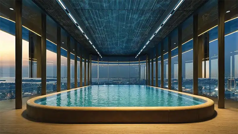 - An Executive Business Club with co-working & event spaces, and conference amenities and a wellness suite with a sky pool, gym, and yoga studio