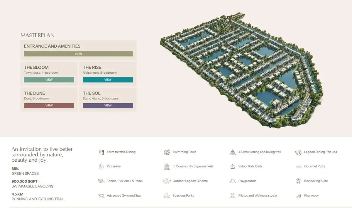 The most commendable factor is the dedication to lifestyle curation that is being taken to a new level. The vision of the community is the complete living situation with wellness, leisure, and socialization areas that find their places organically in the day-to-day life. The core lagoon is the very heart of the development, which has water where people can swim, a beach-style edge, and water-based activities like kayaking and paddle boarding. Other amenities that surround this are well manicured parks, health and wellness areas as well as an organized leisure centre that promotes an active and healthy lifestyle. The residents have access to the best wellness experiences like spa and fitness settings and fine dining establishments that can enhance the overall living experience.