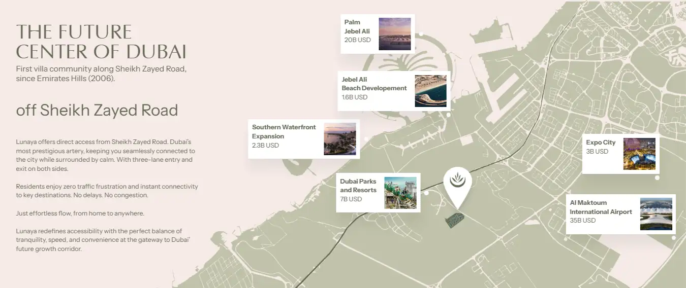 Located strategically on Sheikh Zayed Road as part of the Jebel Ali Village, allowing the establishment to enjoy outstanding connectivity with the environment being highly low-density. It is a great location because accessibility of most of the major business and lifestyle areas like the Dubai Marina, Downtown Dubai and Abu Dhabi corridors routes is easily accessible to both the residents and investors. This project is planned by the same team that created the legendary projects such as Al Barari, a project that is a posing testimony of the desire to create spaces that are thought-provoking, refreshing, and reinventing modern living.