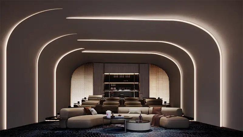- The architectural design is defined by soft curves, layered terraces, and fluid lines inspired by coastal forms and natural movement.