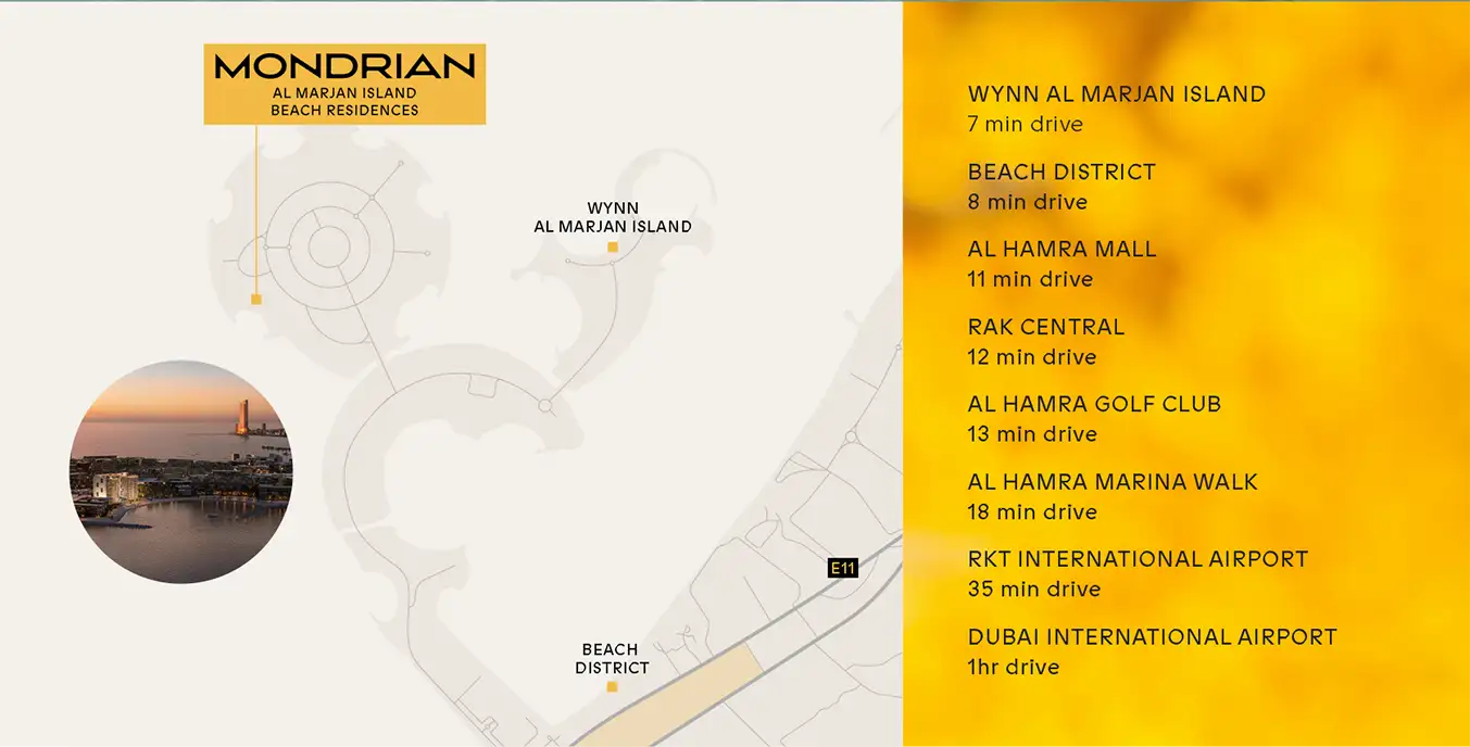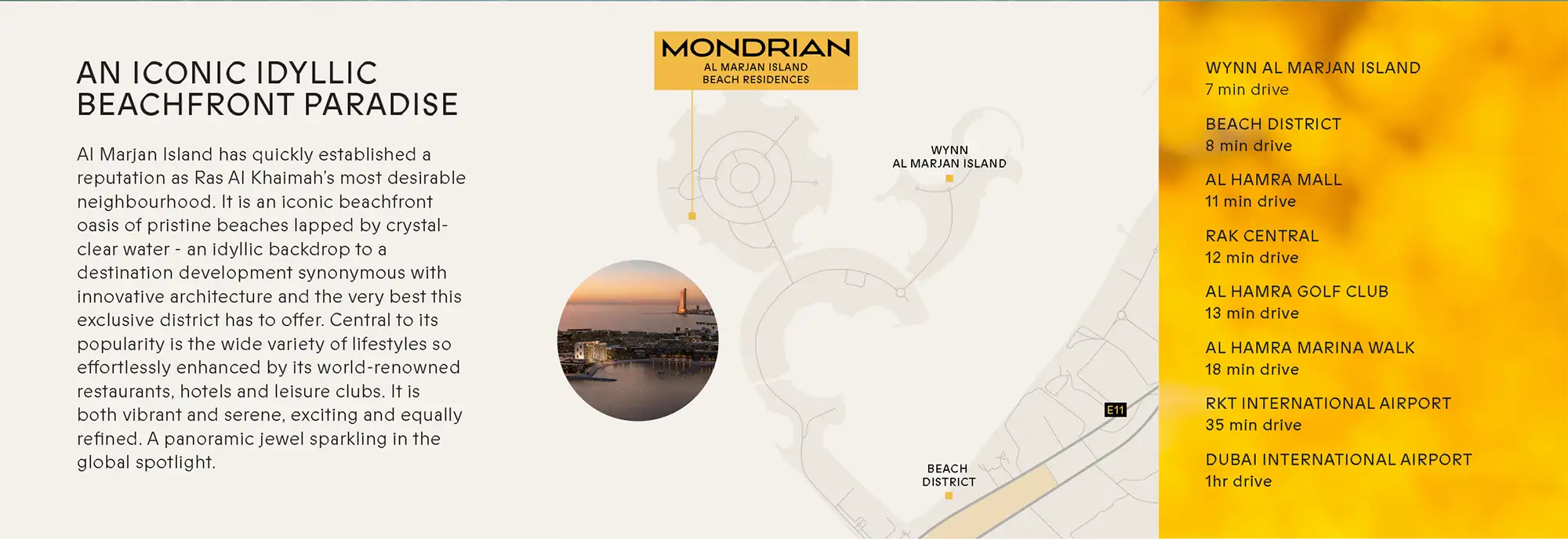 - Prime location in Al Marjan Island, Ras Al Khaimah with direct access to pristine sandy beaches and the Arabian Gulf.