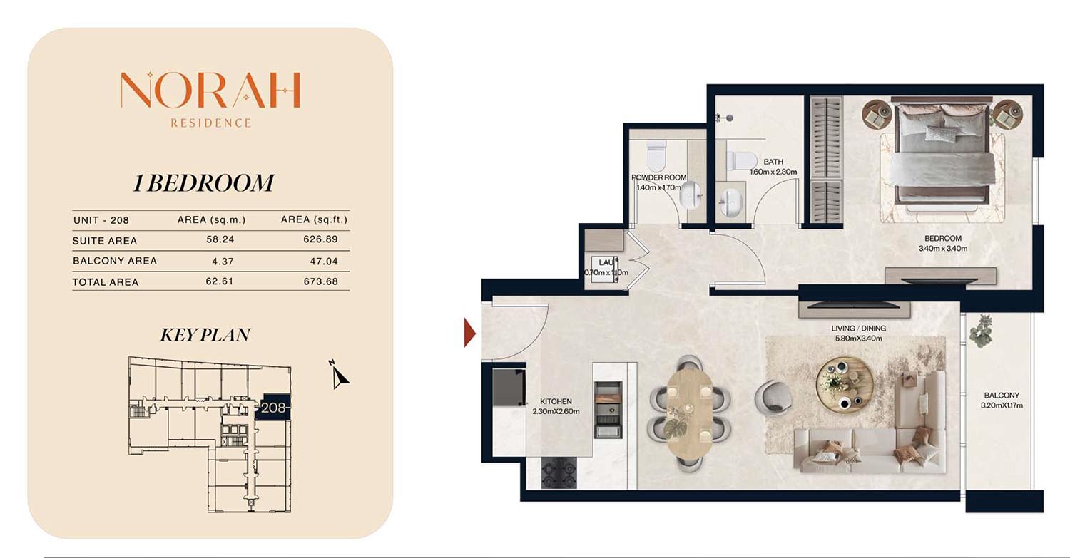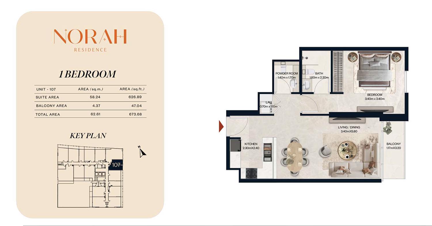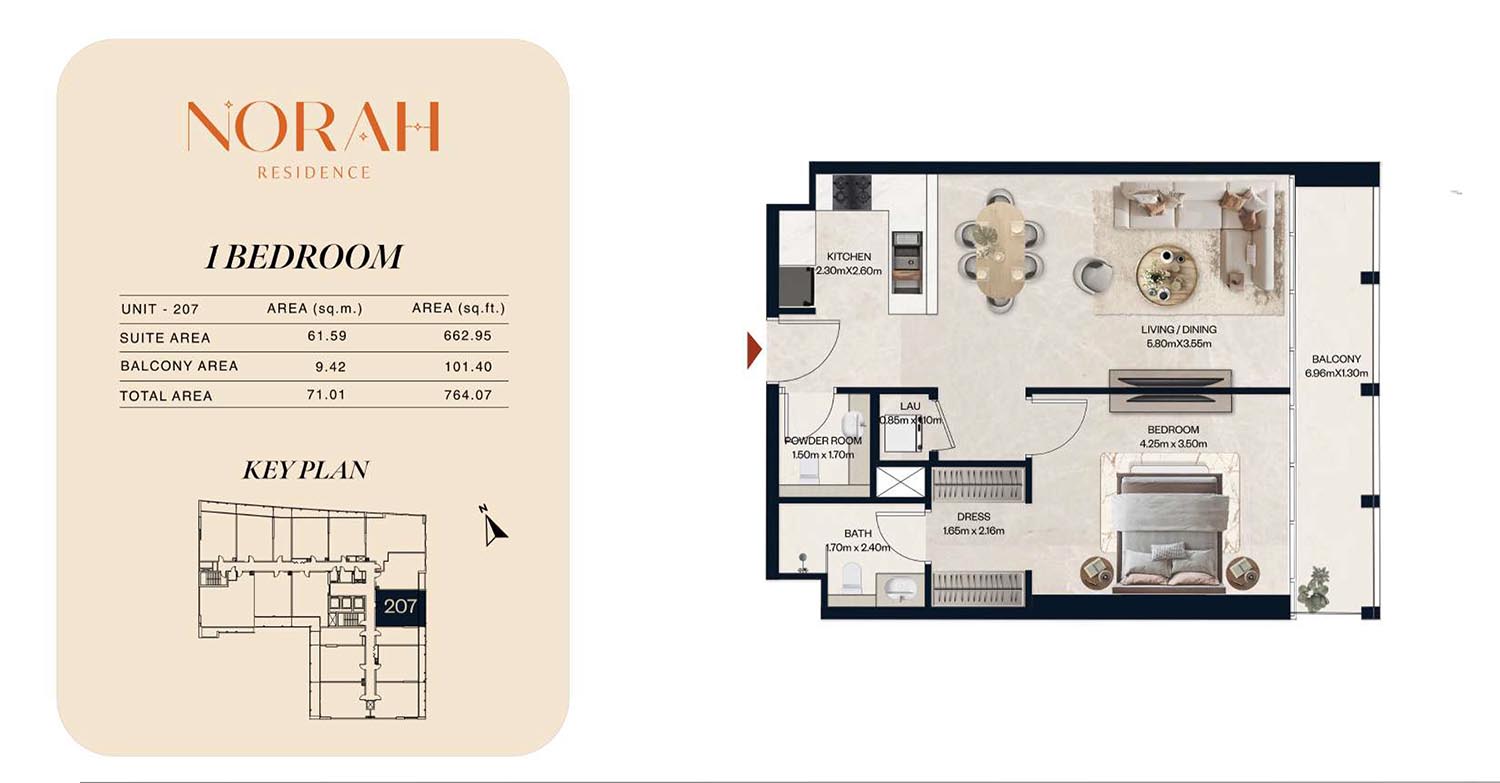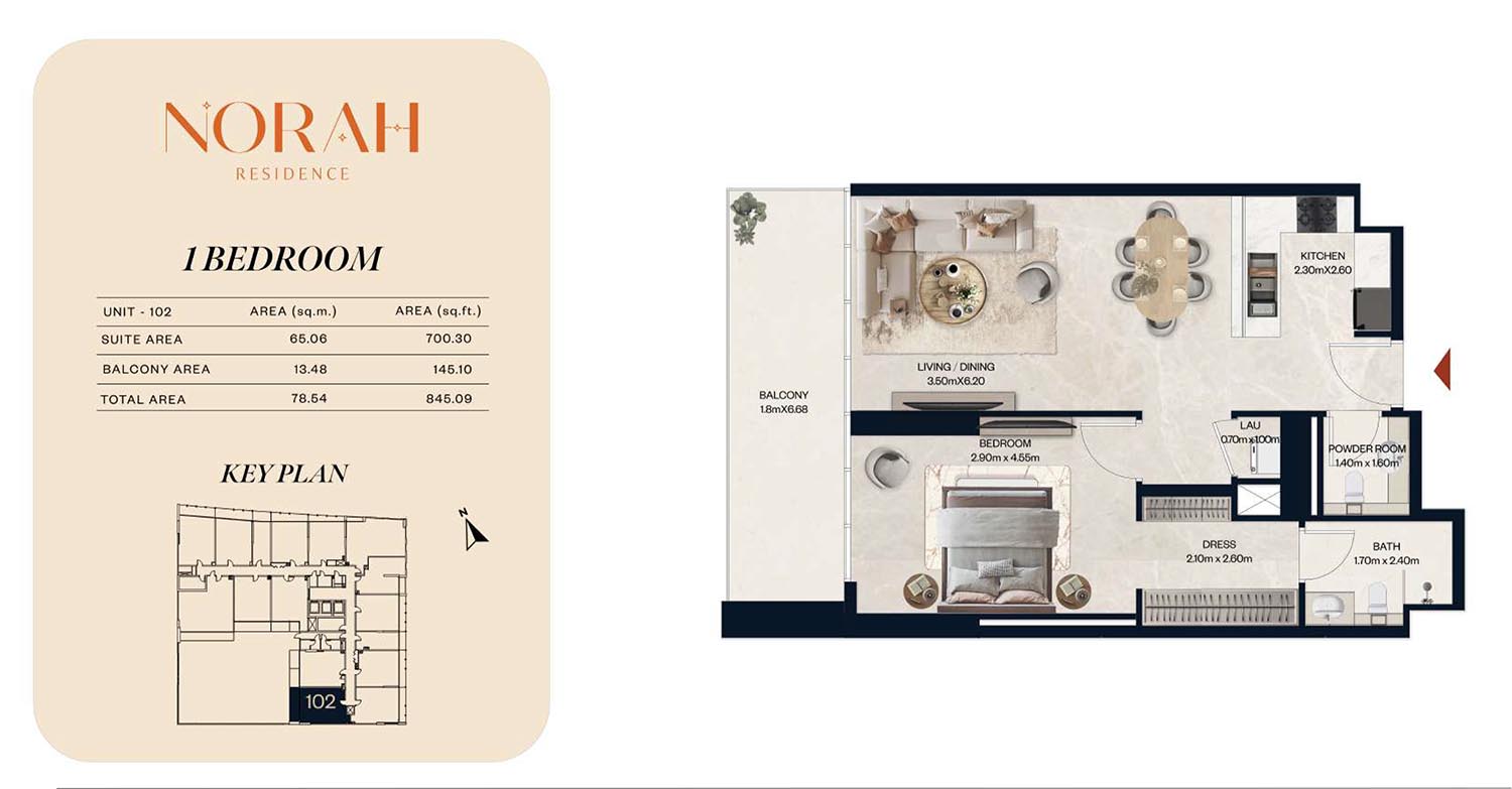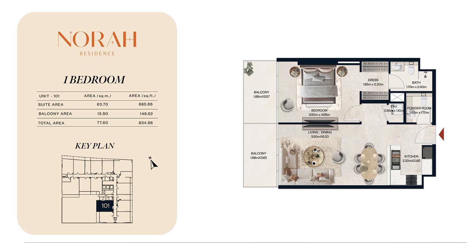 Catered to the futuristic & modern lifestyle, the Norah Residence is a 16-storey building with floor plans of studios, 1, 2, & 3-bedroom apartments & duplexes. From a diverse collection of unique styles, all the 183 residences have been planned to offer comfortable and dynamic open spaces. Each unit boasts smooth finishes, elegant and neutral tones, smart appliances, and furnished living areas and bedrooms with bright ambience and panoramic vistas of the cityscape and lush setting.