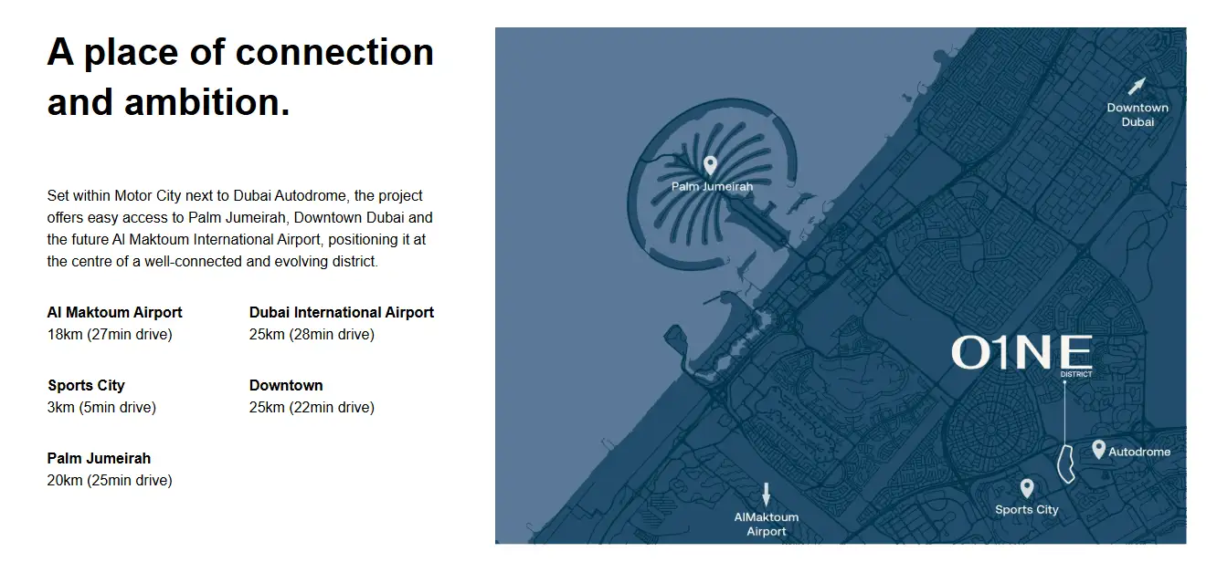 O1NE District - Dawn at Motor City is the next futuristic commercial and business advancement in Dubai, as a result of collaboration between Avenew Development & Kora Properties. As the ambitious new standard is the changing business perspective in Dubai, the complex comes with 06 high-rise commercial towers, where Dawn is the first one launched in business setting that merges architecture with connectivity and lifestyle. This is not only a working identity but a living one, an energetic place to visit, this iconic office tower combines a combination of elegant office rooms with specialty retail experiences to provide a bustling venue both to businesses and other professionals. Having a bold contemporary exterior and smart spatial design, the tower features the sophisticated language of architecture, in which simple clean lines, large glazing, and organized geometry combine to produce a visual dominating impression.
