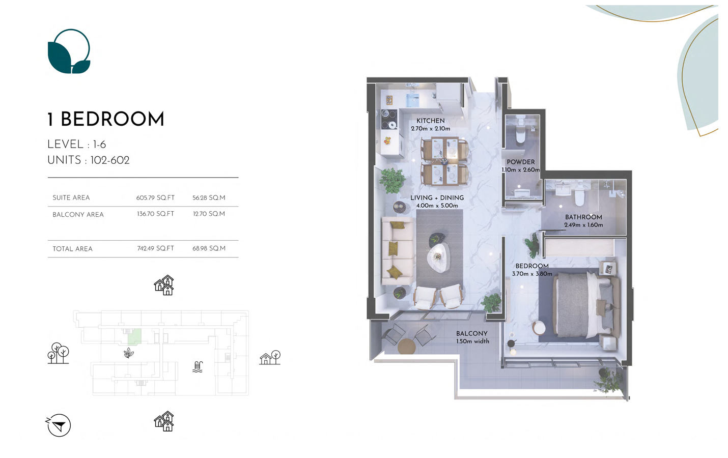 | 1 Bedroom | Level 1-6, Unit 102-602 | 742.49 Sq Ft | Click Here |