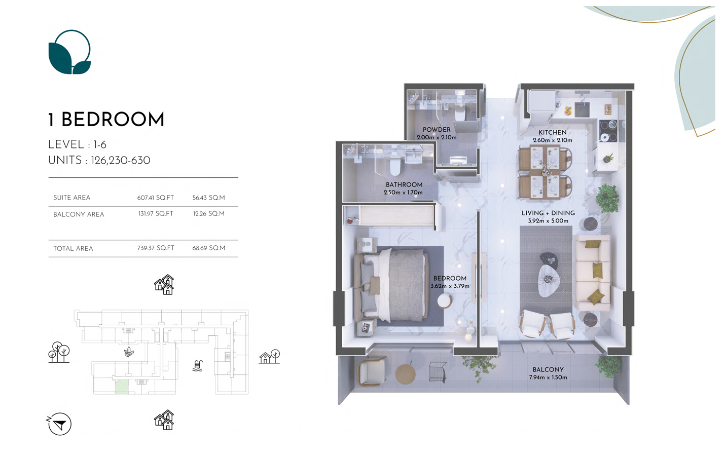 | 1 Bedroom | Level 1-6, Unit 126, 230-630 | 739.37 Sq Ft | Click Here |