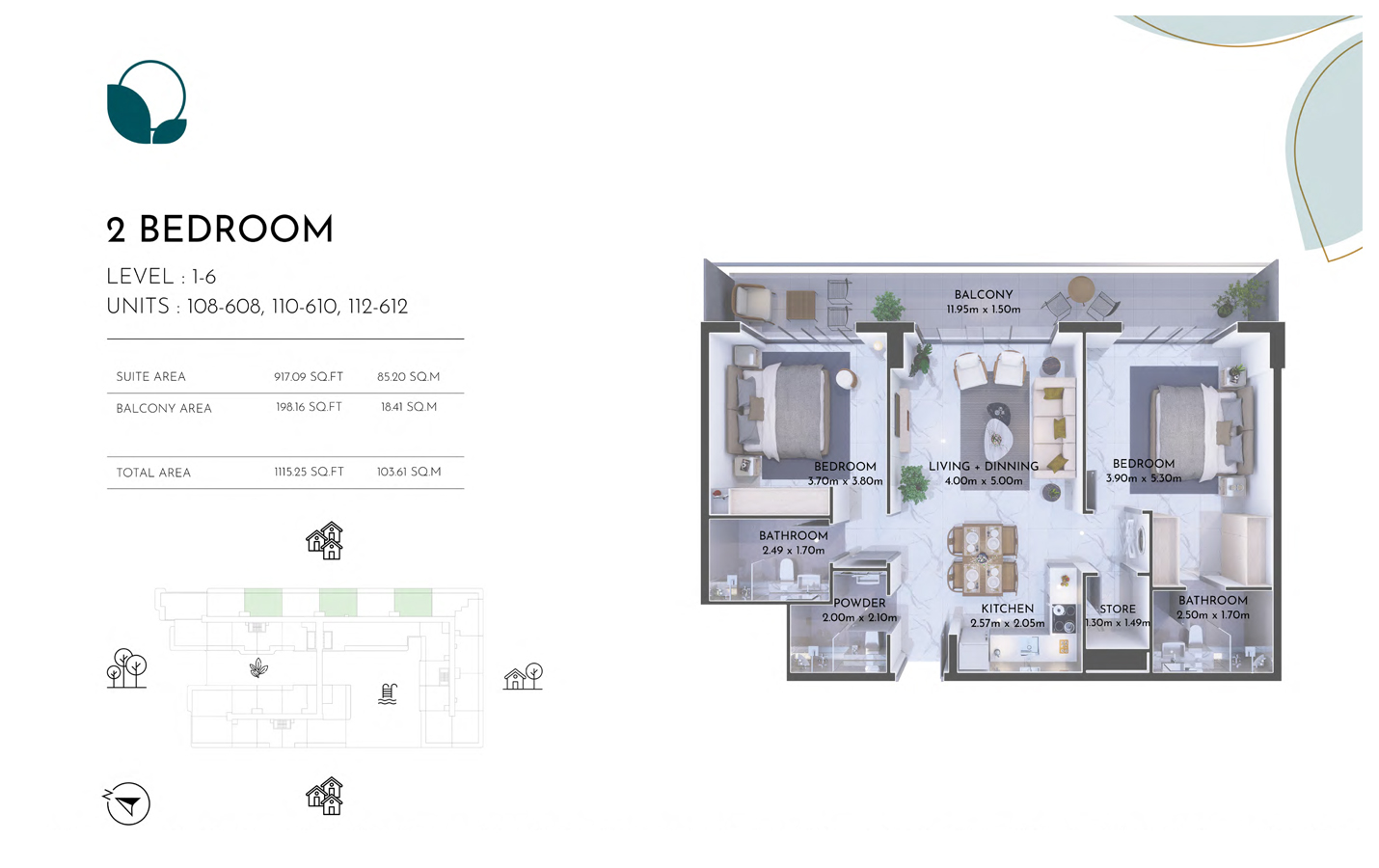 | 2 Bedroom | Level 1-6, Unit 108-608, 110-610, 112-612 | 1115.25 Sq Ft | Click Here |