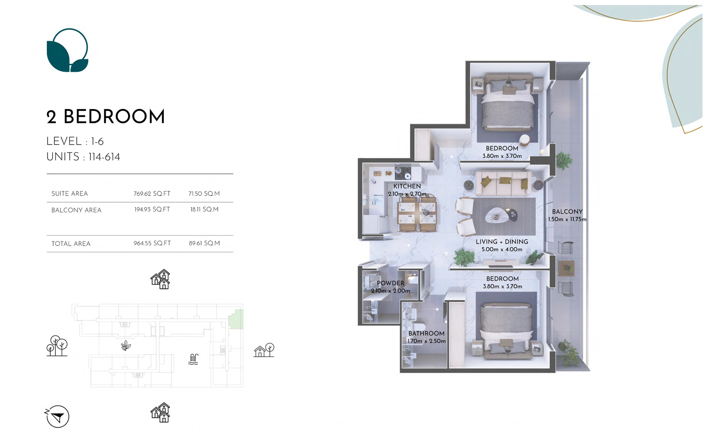 | 2 Bedroom | Level 1-6, Unit 114-614 | 964.55 Sq Ft | Click Here |