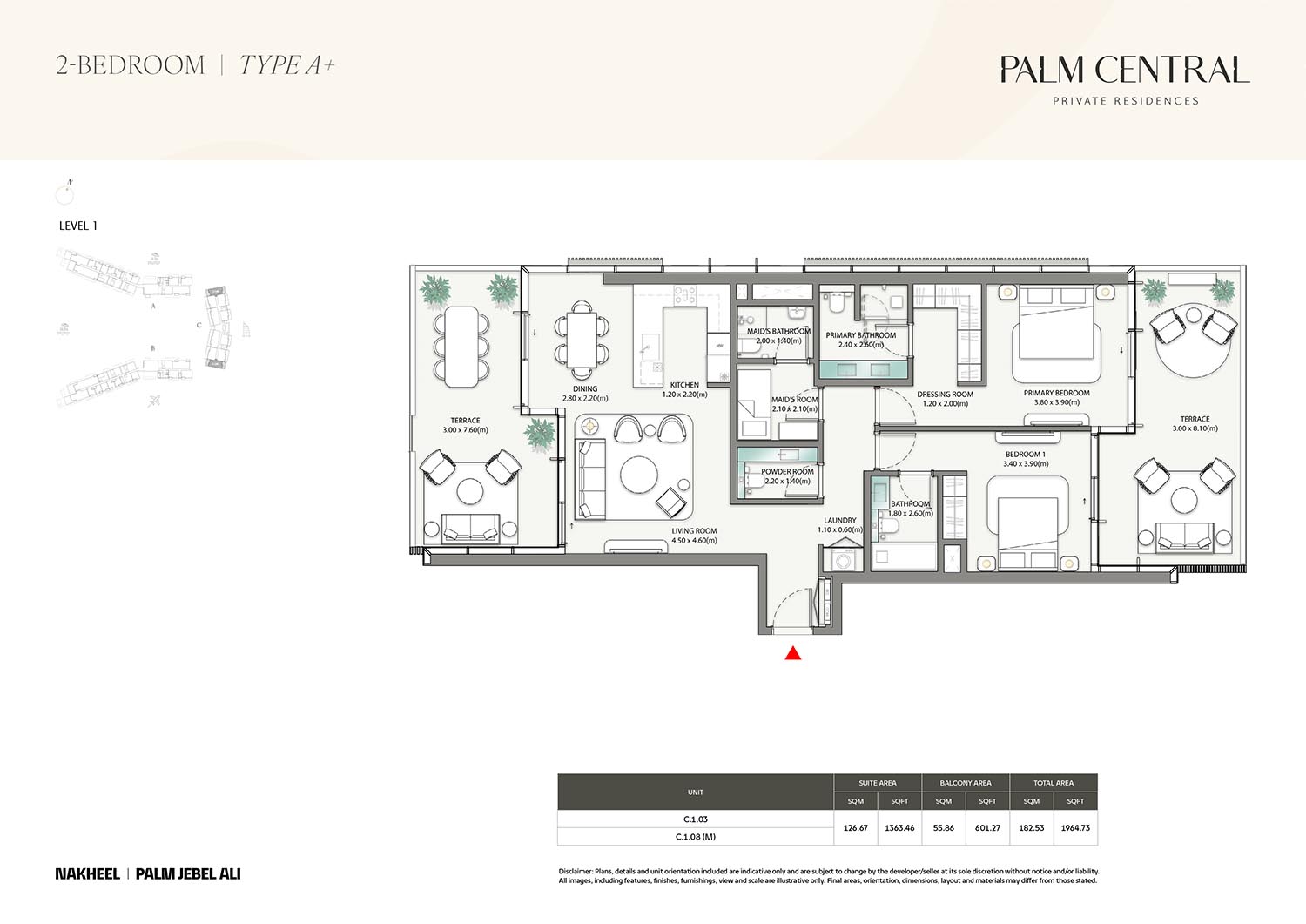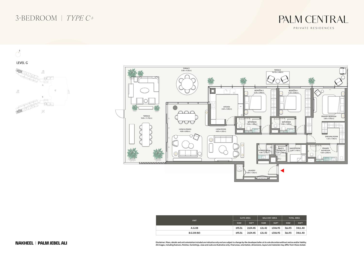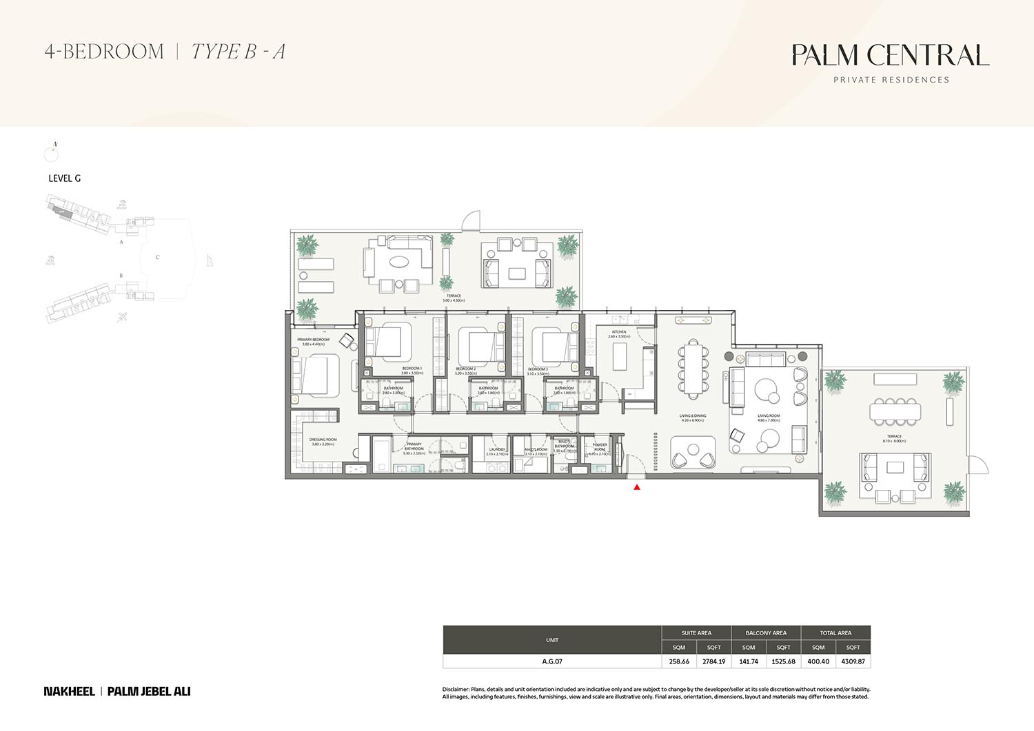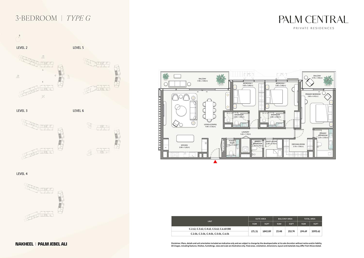 Palm Central Private Residences are selected with extensive floor plans of 1 to 5-bedroom apartments along with townhouses and penthouses at ease. The luxury apartments have open rooms with self-glazing balconies, and the larger units are enlarged to the terrace with the sea view. Townhouses have access to beaches and living spaces are double height and penthouses reinvent exclusivity with their own pools, terraces and spectacular views of the skyline. All the units are highlighted by the openness, light and informal indoor-outdoor living with sophisticated finishes, lots of storage area and personal garages that combine grace and utility to everyday living on the island.
