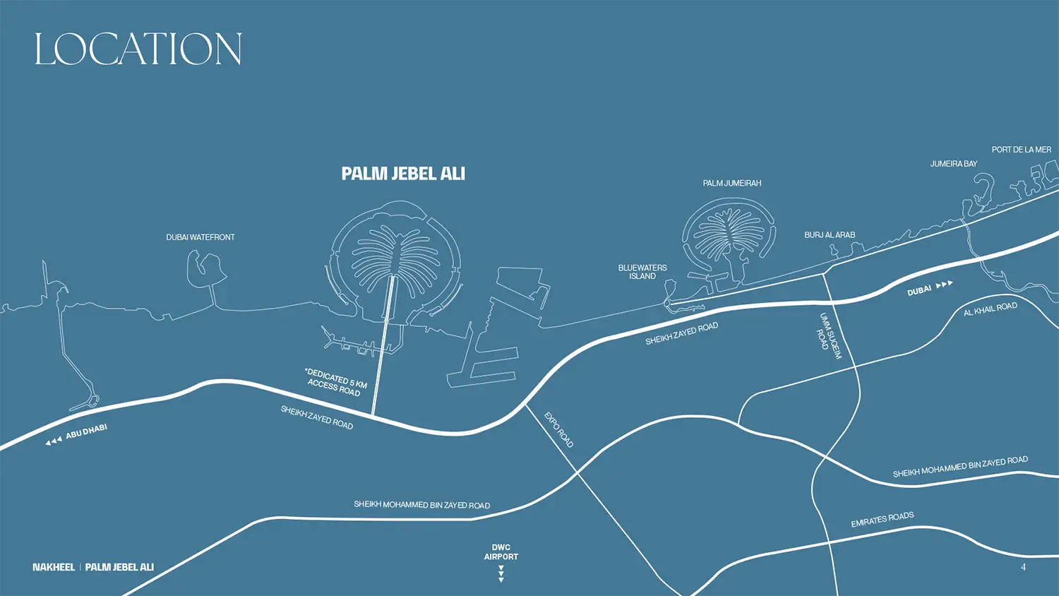 Located within the exclusive crescent of Palm the Jebel Ali on the Arabian Gulf as a new large-scale archetypal archipelago wavering merely off the Dubai. The shoreline is connected to the mainland by a specific five-kilometre access road and situated amidst Dubai most identifiable landmarks and avenues. The convenient accessibility to Sheikh Zayed Road, Dubai Waterfront and the already existing destinations like Palm Jumeirah and Bluewaters Island, the residents are enjoying a unique mix of privacy on an island and the immediate ease of access to city life, making the villas a desirable secluded area, but in close proximity. Promenades and crescents have been folded into masterplan hospitality in such a way that the sunrise and sunset experience is not only designed but is incorporated into the life of the people.