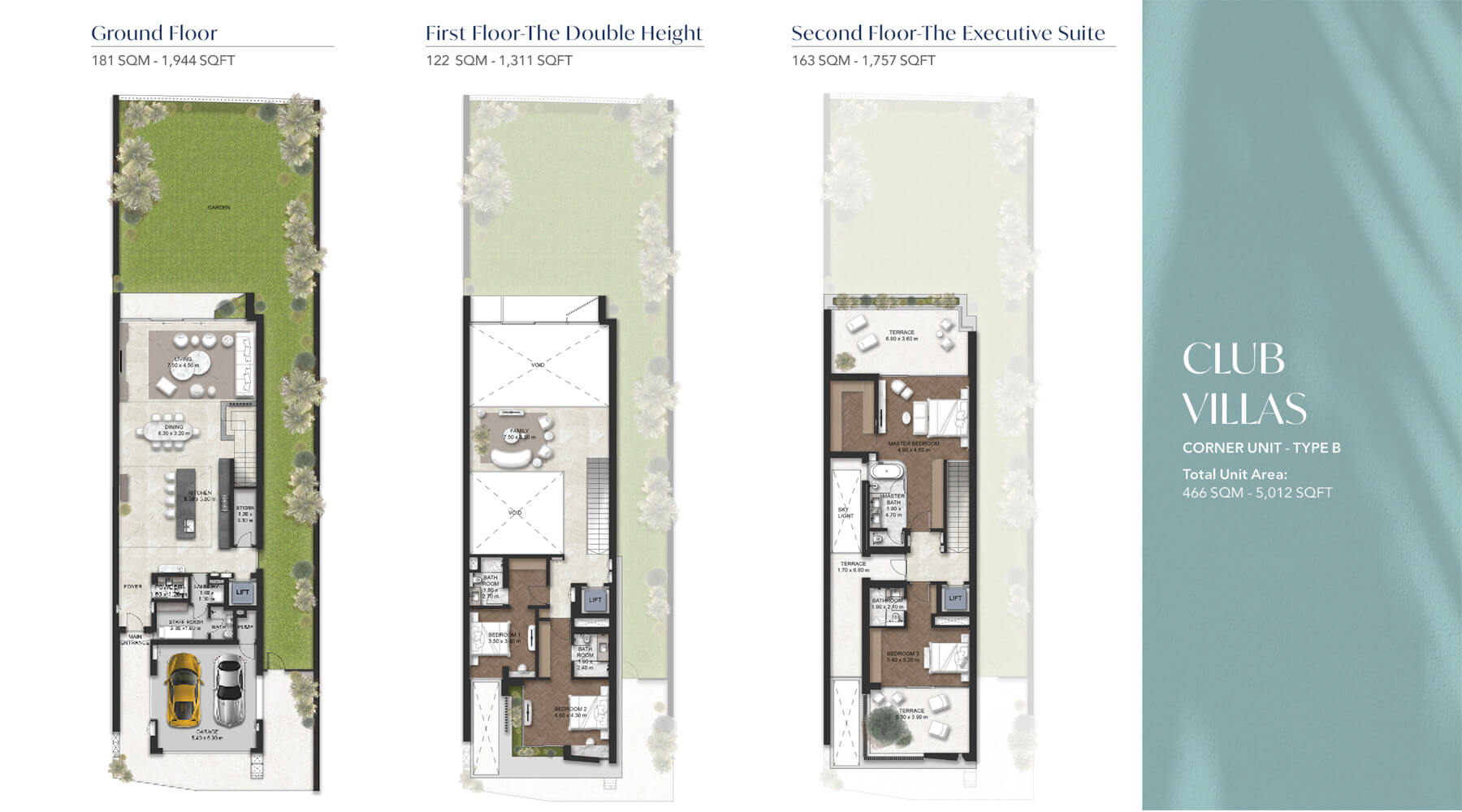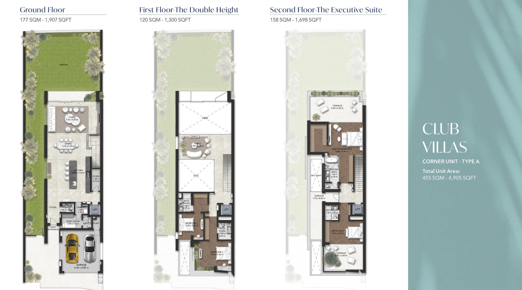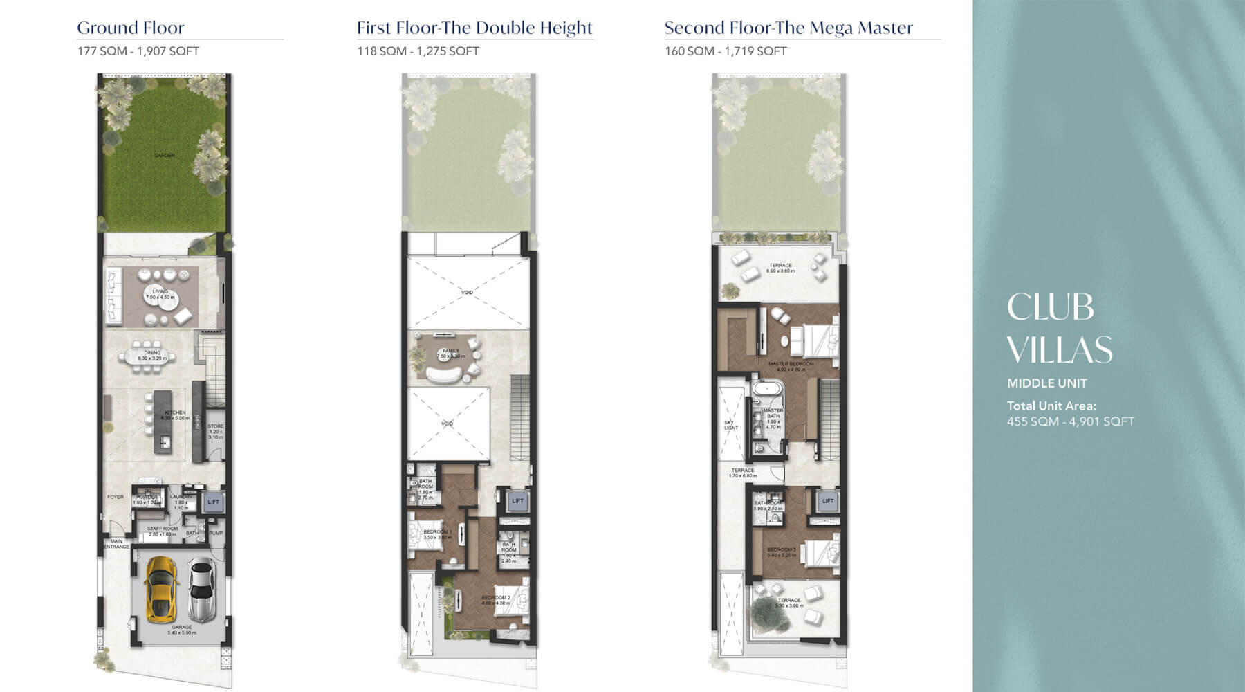 Plagette32 at Tilal Al Ghaf in Dubai is a cluster of 32 exquisite bespoke water bungalows and club villas with thoughtfully crafted floor plans. This remarkable property features only 4 water bungalows attached to the community’s lagoon and 28 state-of-the-art club villas, spanning over 3 floors, offering premium and nature-inspired quality materials in all units.