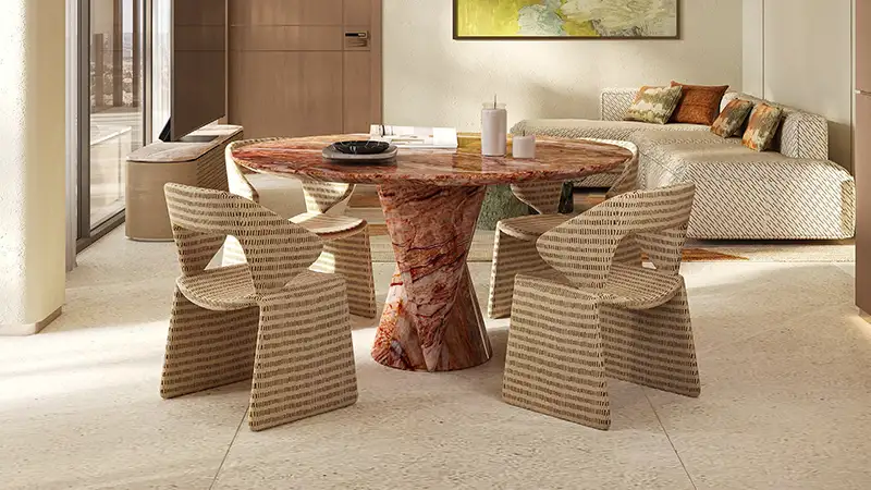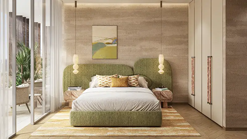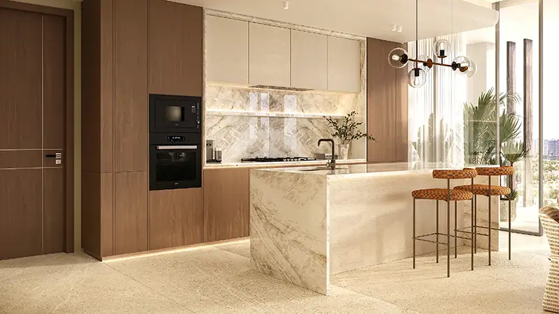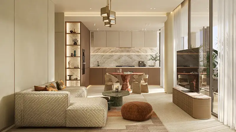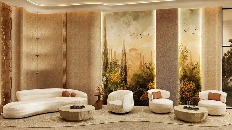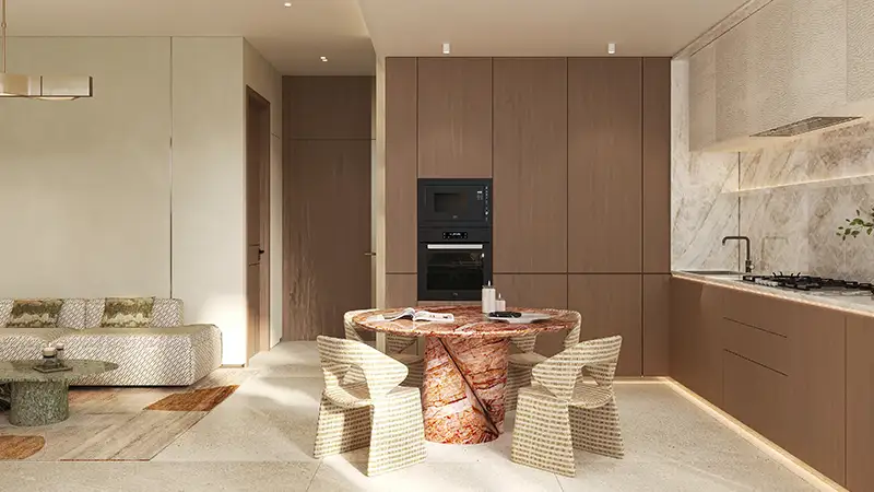 - Natural textures, warm finishes, and thoughtfully sculpted interiors establish an atmosphere of understated luxury throughout the development.