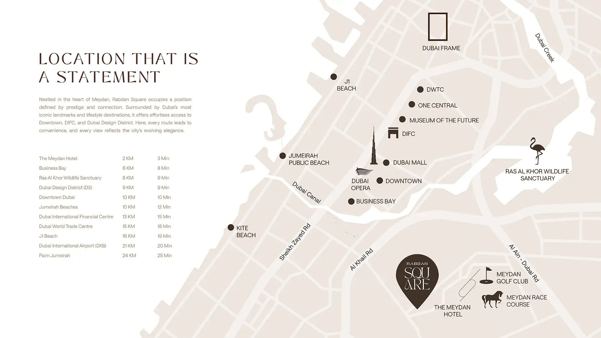 - Set within Meydan, that balances urban connectivity with park-facing serenity, creating a grounded and exclusive lifestyle.