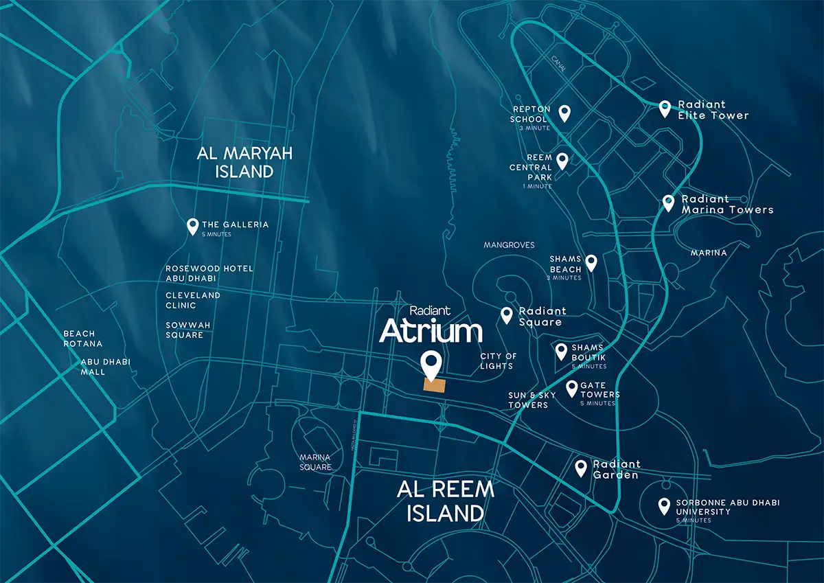 Radiant Atrium Towers at Al Reem Island is a luxury class mixed use development by Radiant Real Estate, lined with studios, 1 & 2-bedroom apartments, offices and retails in Abu Dhabi. The elegant twin tower façade uprising out of the colourful canvas of City of lights, formed as much more than a development. This is a city declaration where architecture of the present, waterfront romanticism and suburban convenience merge in a well-rounded upscale living spot. This historic mixed-use development brings about a well-balanced living, working, and recreational setting in which living, working and leisure engage in flawless harmony. Whether the architecture of its imposing dual-tower shape, or the considerate way in which it activates its podium, a modern way of living in the city that is on the one hand responsive to the visionary outlook of Abu Dhabi and, on the other, is immensely engaged with the comforts and functionality of its residents.
