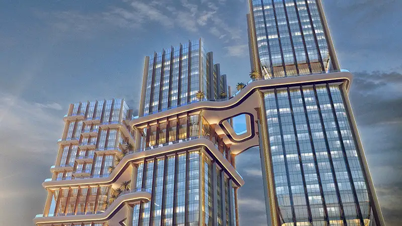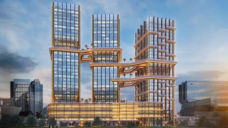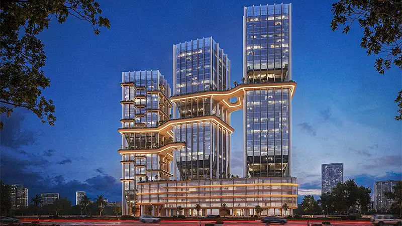- The project features three architecturally distinct towers, including two Grade-A office towers and one residential tower connected through a multi-level podium.