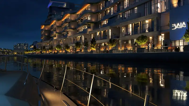 - Landscaped internal spaces that create a calm residential atmosphere within a vibrant waterfront district.