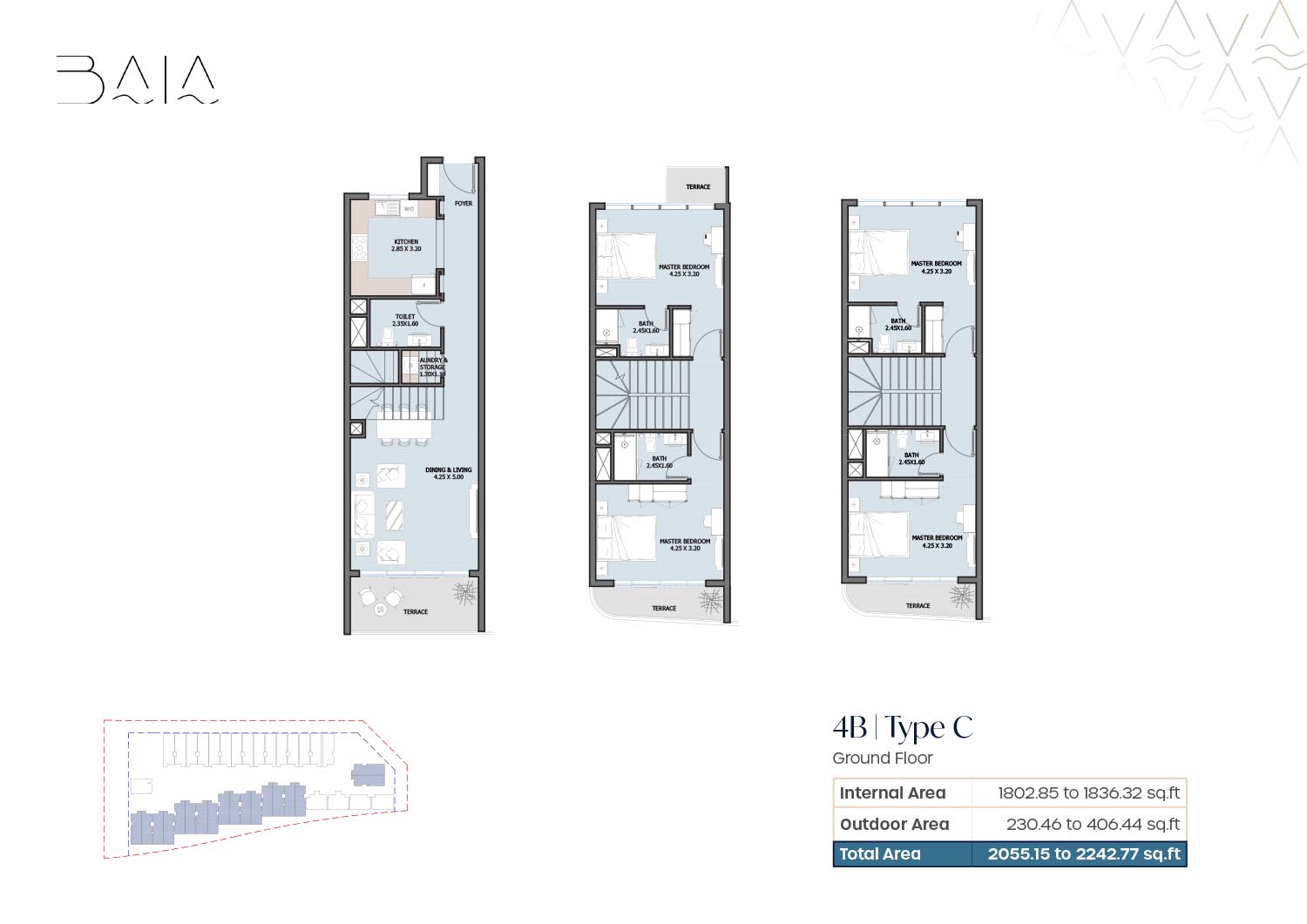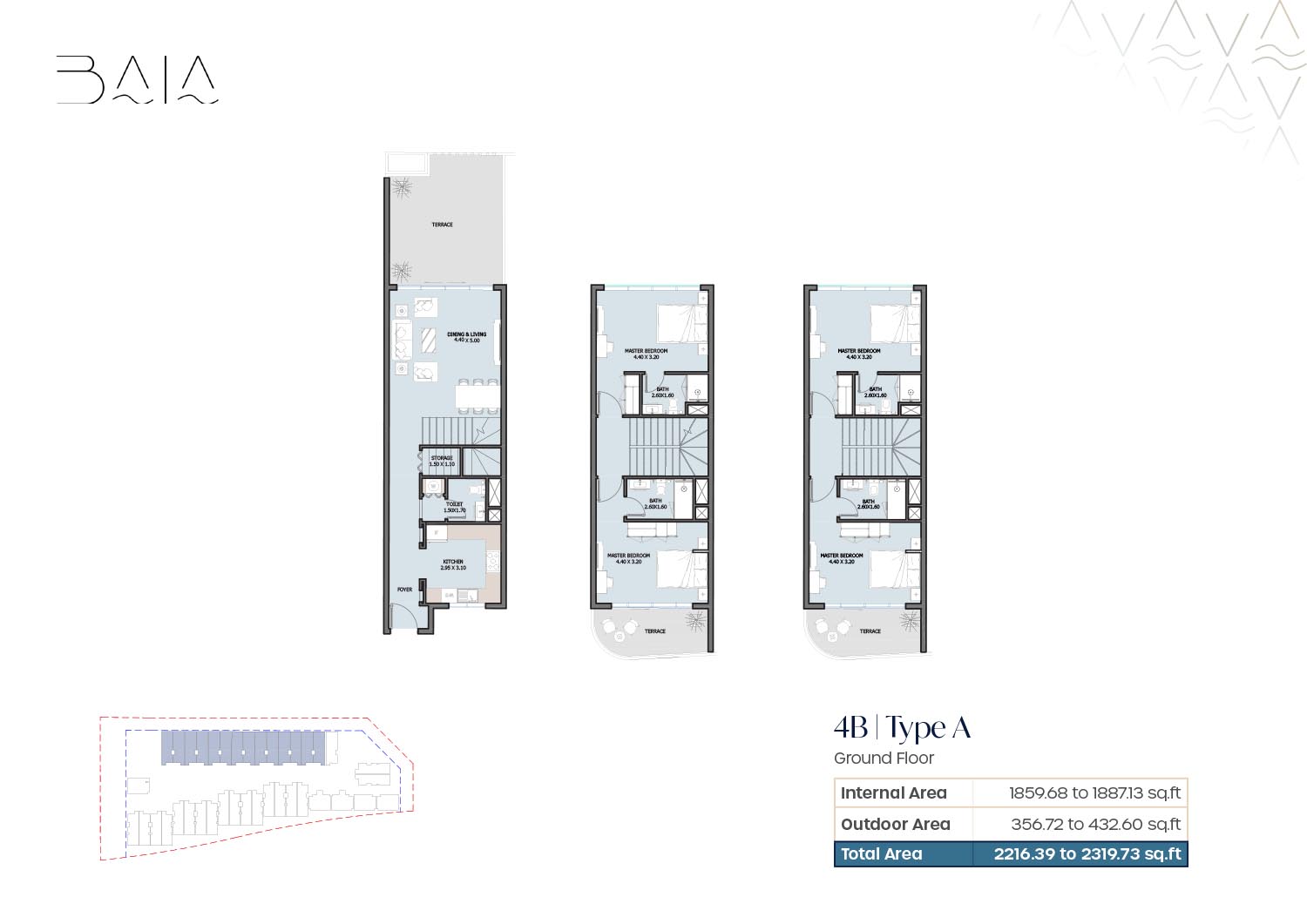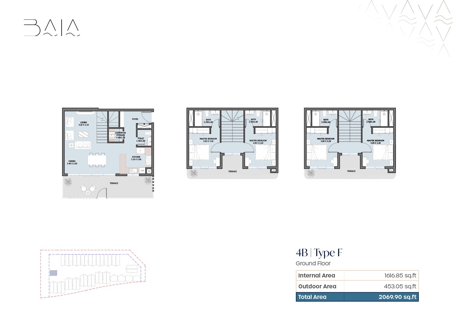 The 3 and 4-bedroom townhouses floor plans provided by Baia give a nice variety of layout which are designed to ensure air space and optimality of light. Freestanding floor plans are focused on open plan residences and dining areas which integrate qualitatively to personal outside structures. The bedrooms are spacious and en-suite bathrooms are also installed to provide an increase in privacy among family members. The presence of terraces and balconies makes the living spaces open to the outside providing a great attachment to the waterfront and landscaped environment. The layouts chosen will be maid rooms, and other service rooms which will make the houses serve the interests of the family and long-term living.