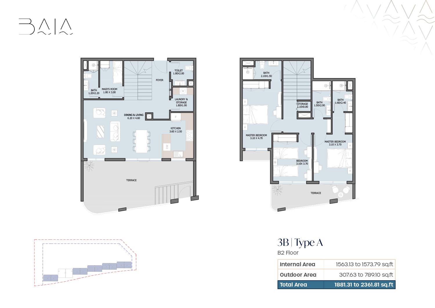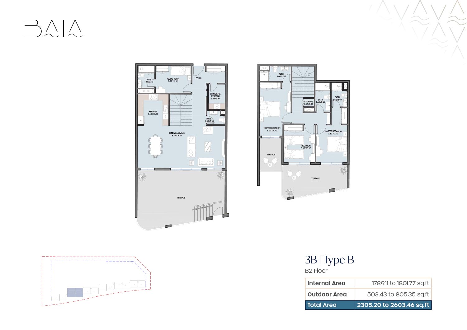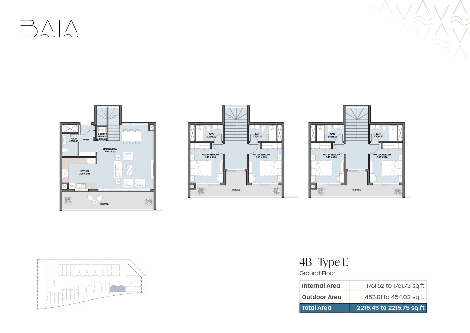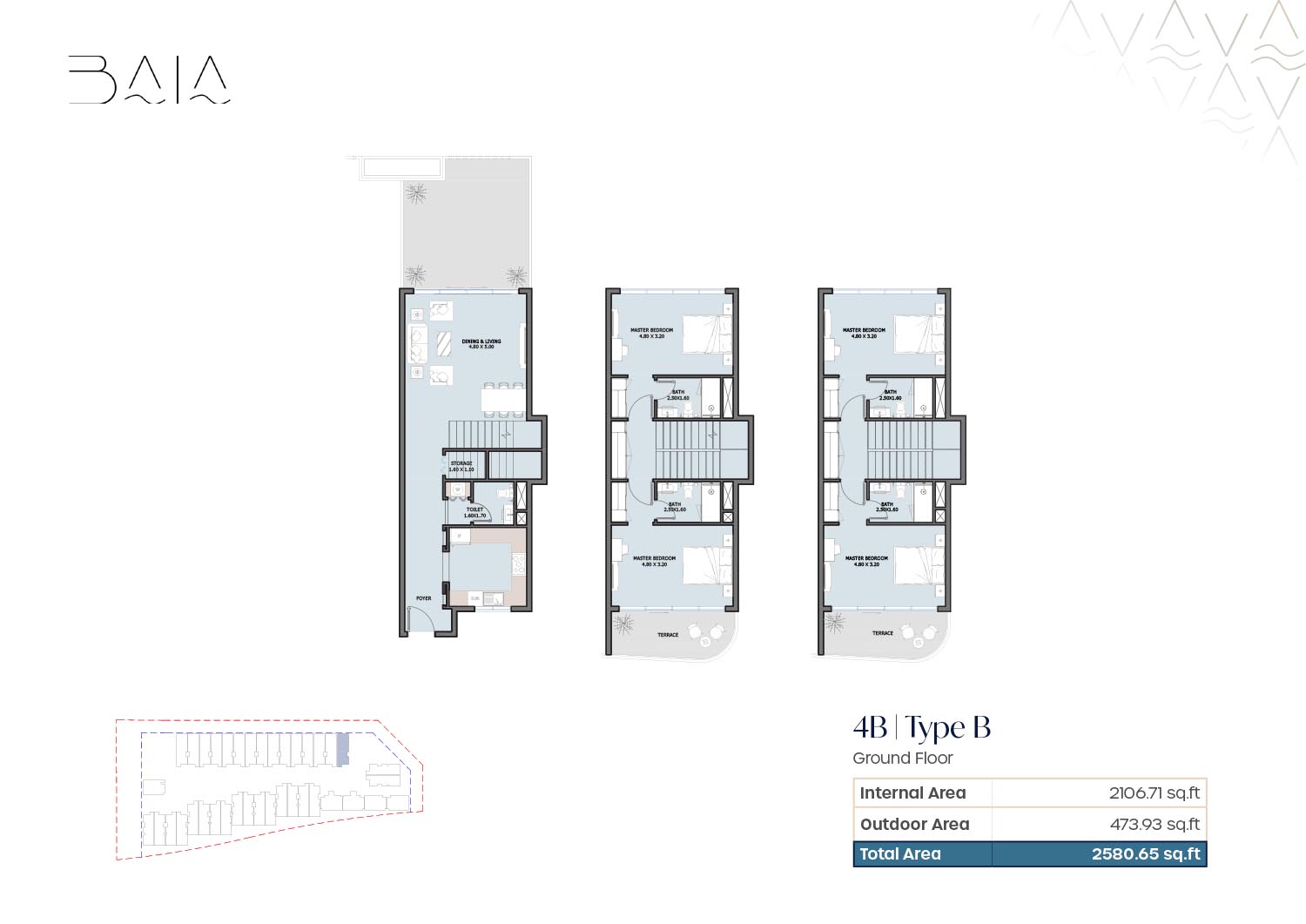The 3 and 4-bedroom townhouses floor plans provided by Baia give a nice variety of layout which are designed to ensure air space and optimality of light. Freestanding floor plans are focused on open plan residences and dining areas which integrate qualitatively to personal outside structures. The bedrooms are spacious and en-suite bathrooms are also installed to provide an increase in privacy among family members. The presence of terraces and balconies makes the living spaces open to the outside providing a great attachment to the waterfront and landscaped environment. The layouts chosen will be maid rooms, and other service rooms which will make the houses serve the interests of the family and long-term living.