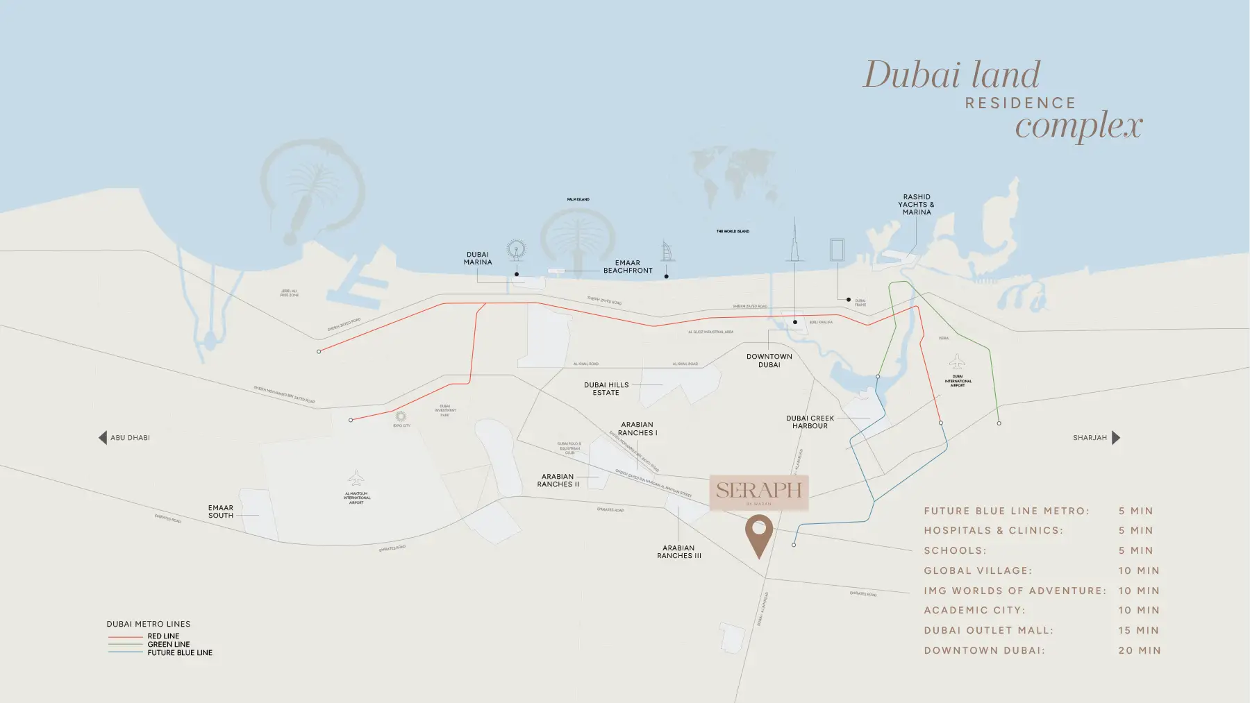 Located in the heart of the Dubailand Residence Complex, it combines the peace and tranquillity of a residential space with easy access to the city's cultural and lifestyle hubs. Getting by is easy because everything is within easy reach: schools and hospitals are within reach of just a few minutes, while other major leisure points like Global Village and IMG Worlds of Adventure are all within reach. The nearby Dubai Outlet Mall and Downtown Dubai are within a short drive and the completion of the Future Blue Line Metro network will provide even quicker access to the rest of the Emirate. Al Maktoum International and Dubai International Airports are well-serviced, while major arterial streets link the community with Dubai Hills, Dubai Marina and Dubai's major business districts.