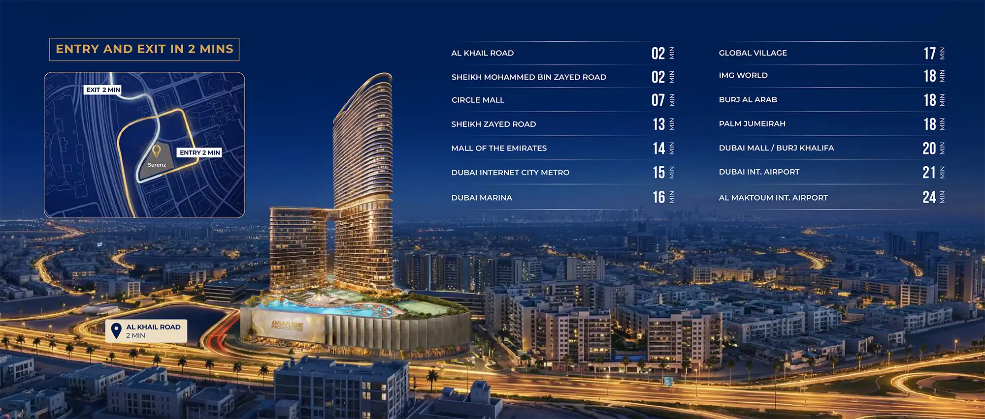 Serenz at Jumeirah Village Circle (JVC) is the latest 50-storey high-rise residential crafted by the well-known Danube Properties lined with fully furnished studios, 1, 2 & 3-bedroom apartments in Dubai. This is an ambitious architectural project that is set in the center of Jumeirah Village Circle and transforms the concept of vertical luxury living in the city. Described as a world of amenities, this iconic high-rise residential tower incorporates sculpture with the experiential style of life and builds a lifestyle destination, other than just a house. Through its living fluid exterior designed like the movement and grace, to its lighted skyline projection, it puts itself as one of the most aesthetically prominent residential underpinnings in JVC. The tower is strategically located on a multi-level podium and perfectly presents the leisure, wellness and community areas within living capacities.