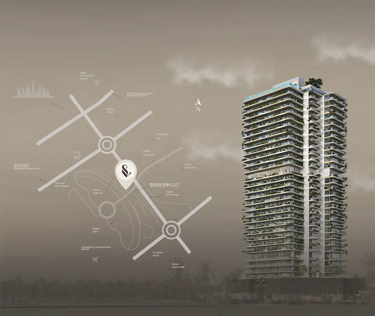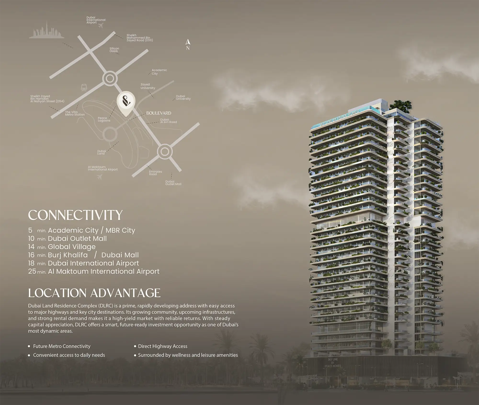 - Modern mixed-use residential tower located in the growing community of Dubai Land Residence Complex (DLRC), designed to offer a balanced urban lifestyle.