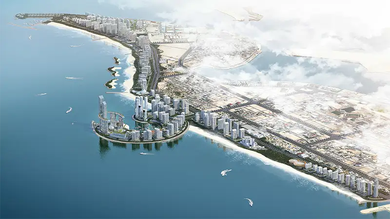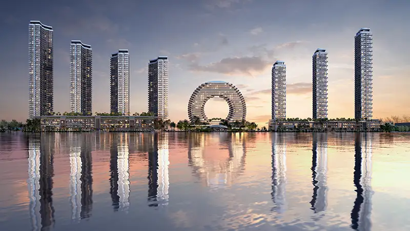 - Five gracefully rising towers inspired by the rhythm of ocean waves, blending fluid design with timeless elegance along the Umm Al Quwain coastline.