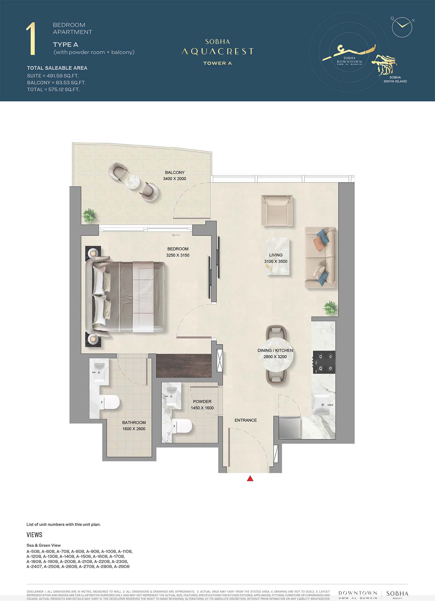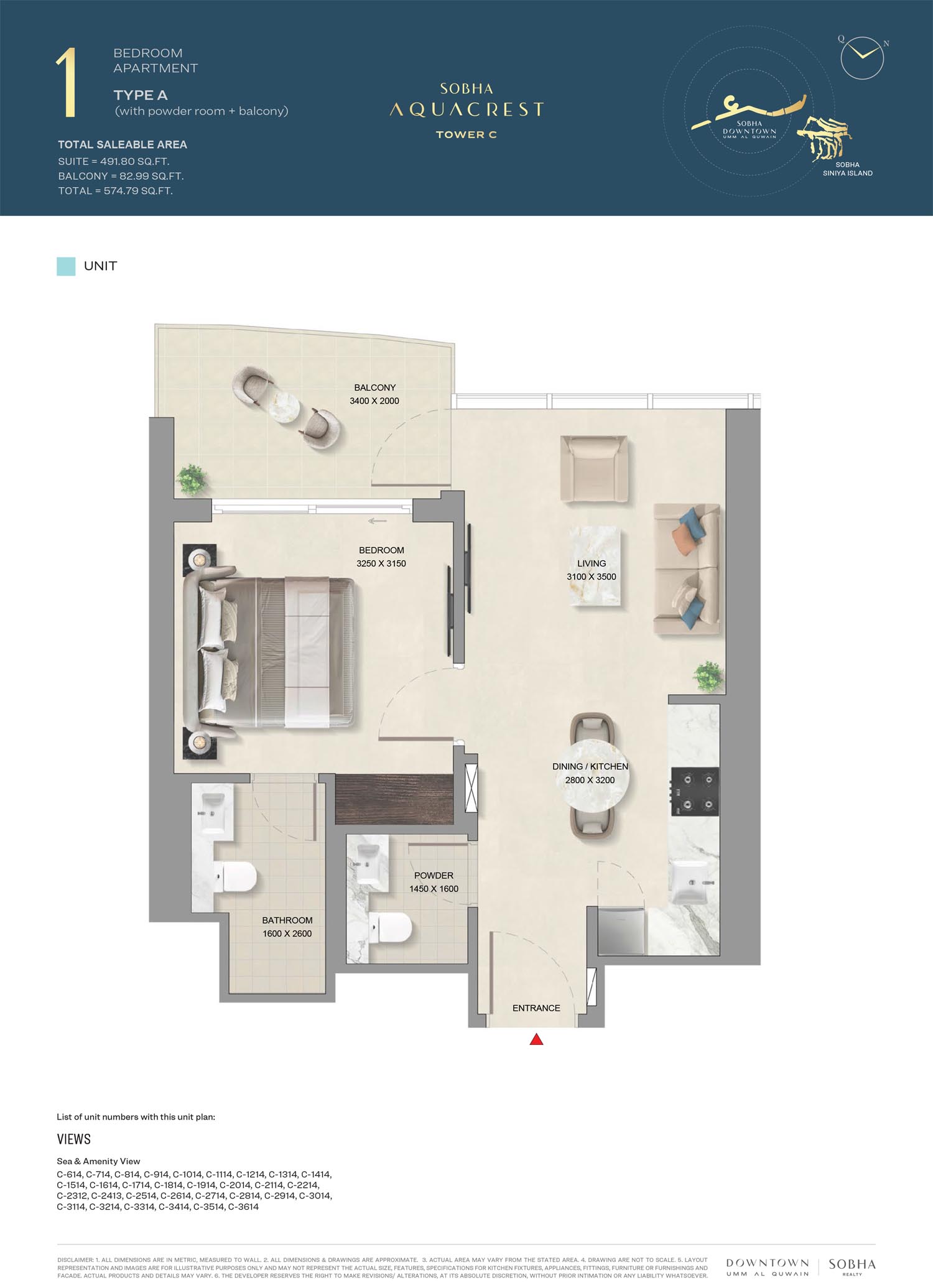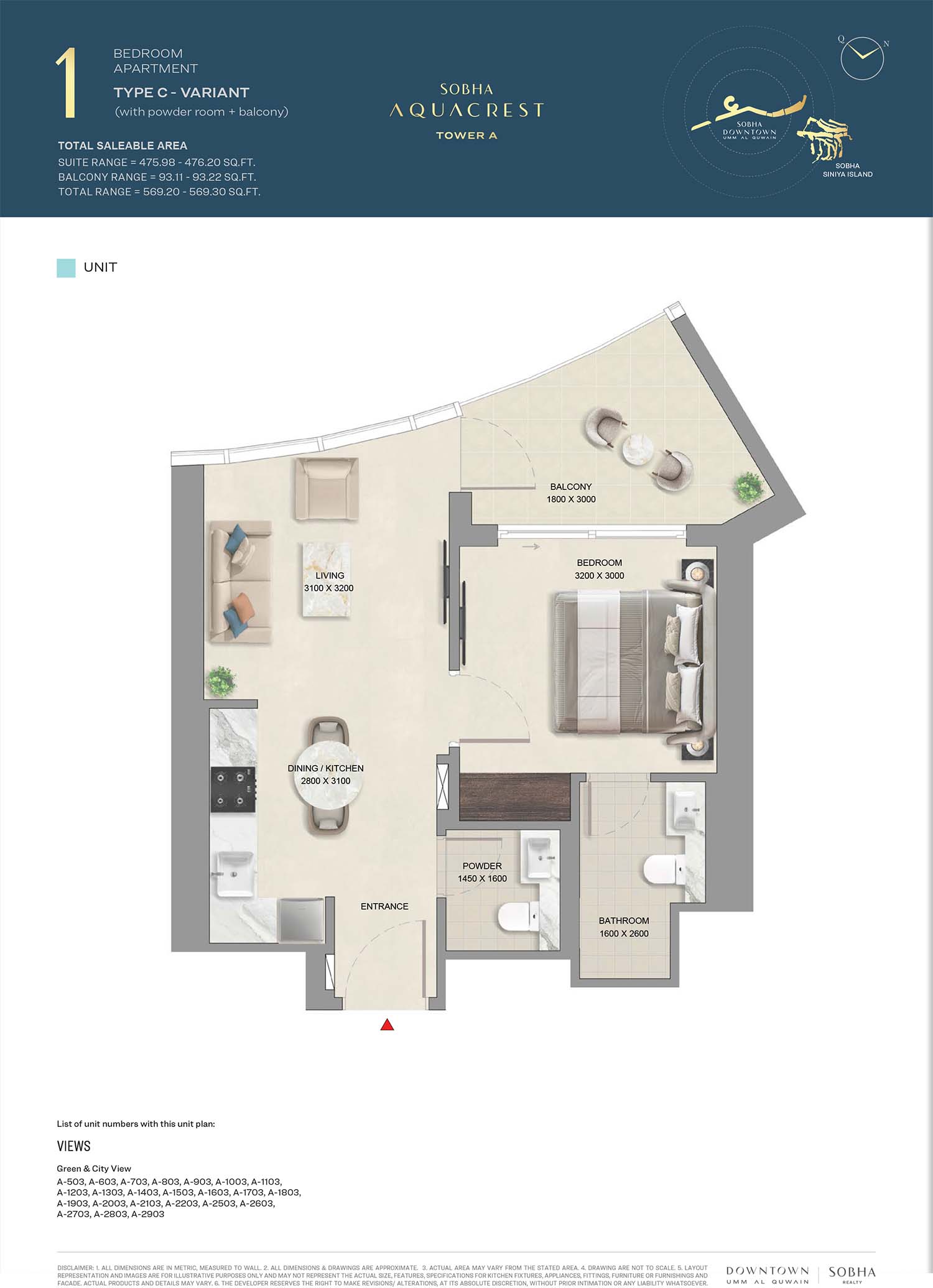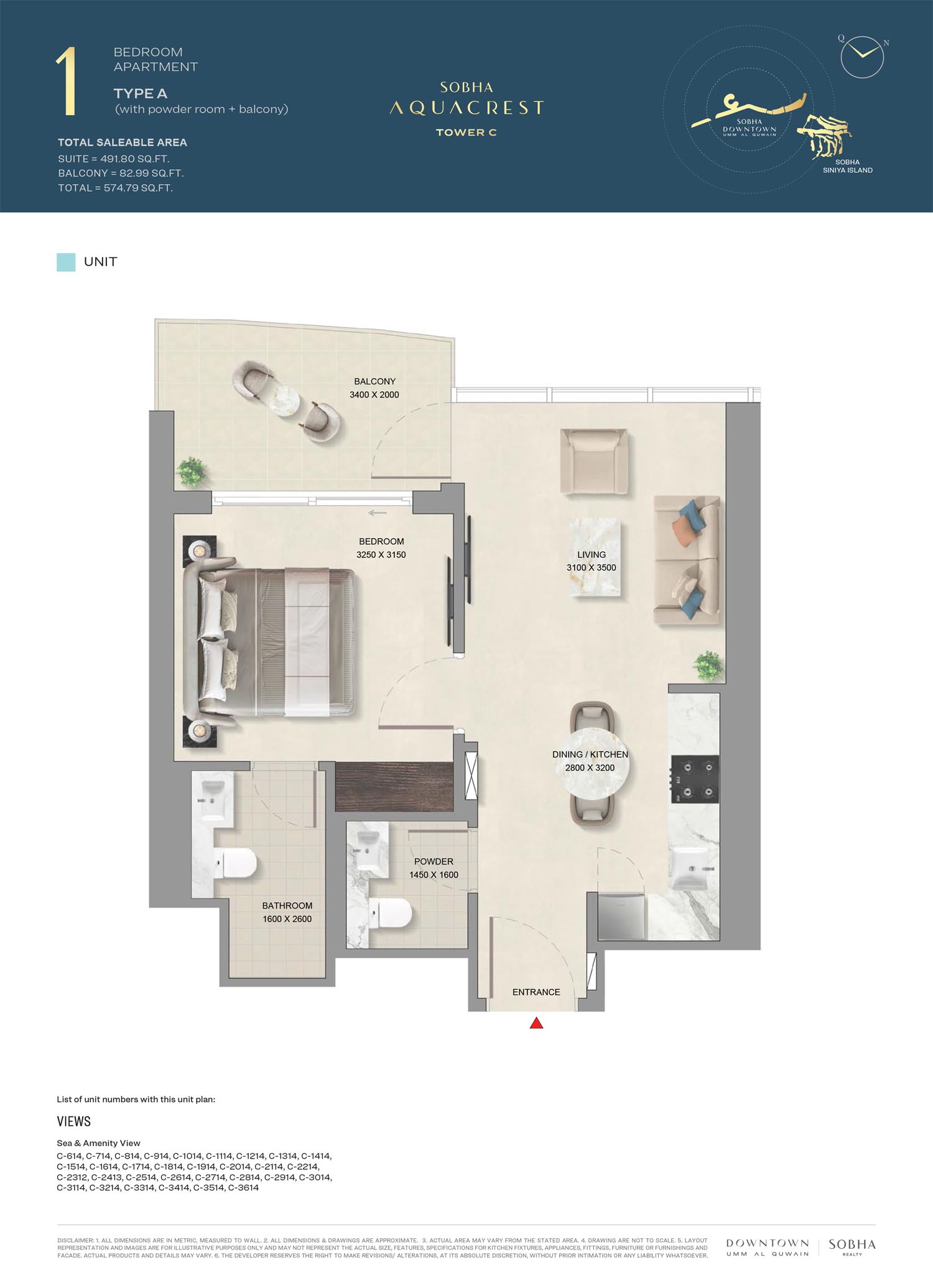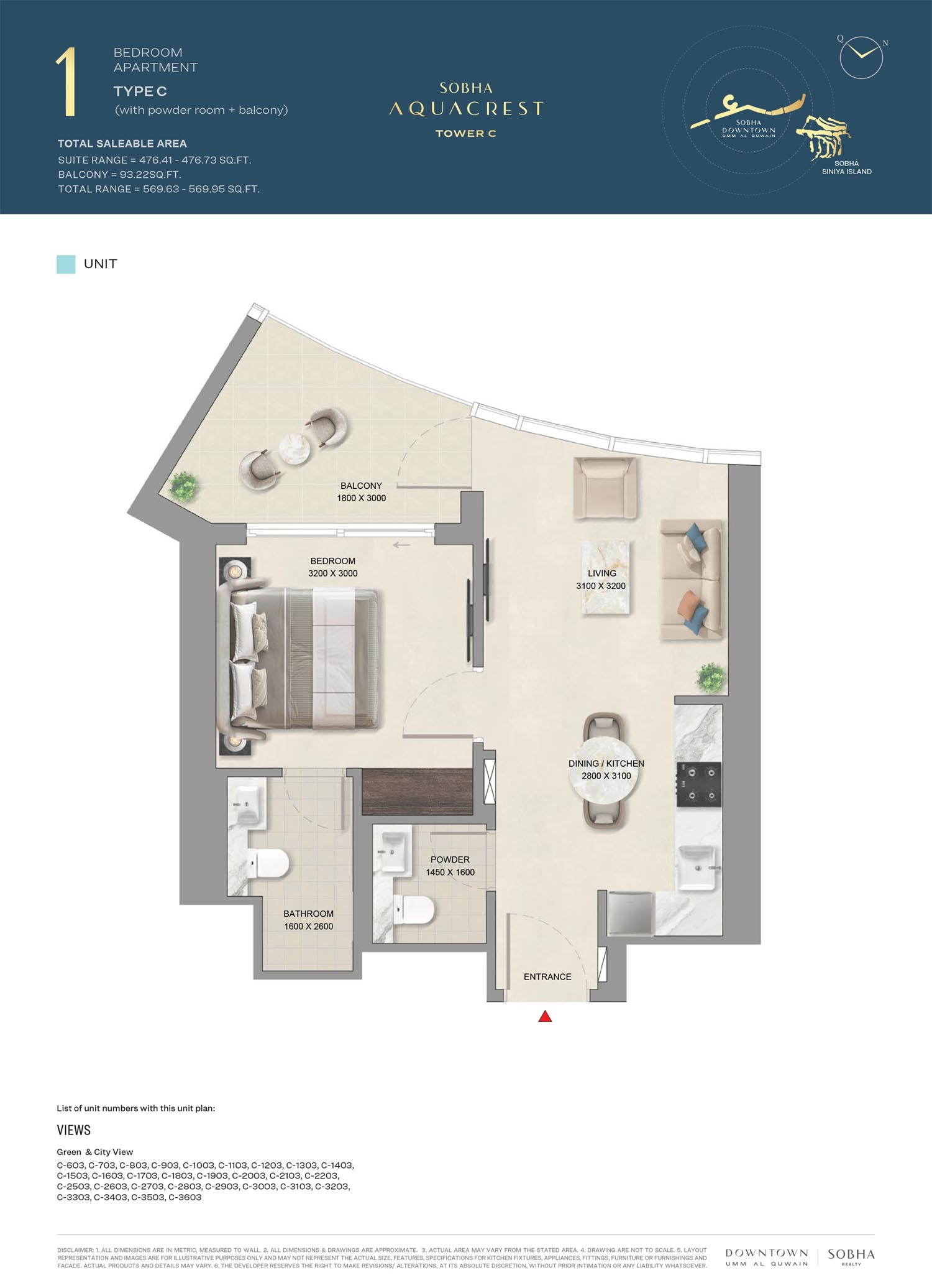 | Tower C | 1 Bedroom | Level 02-36 (Type A) | 574.97 Sq Ft | Click Here |