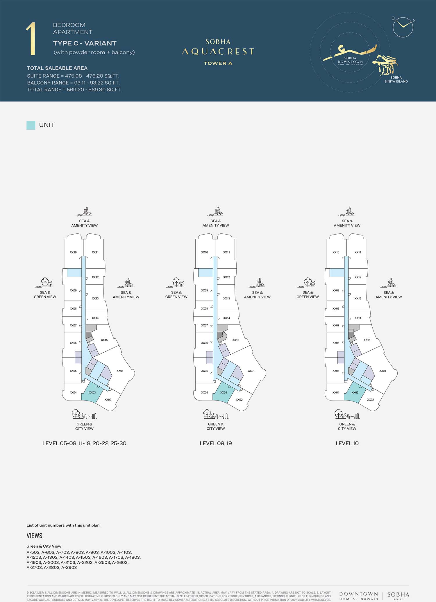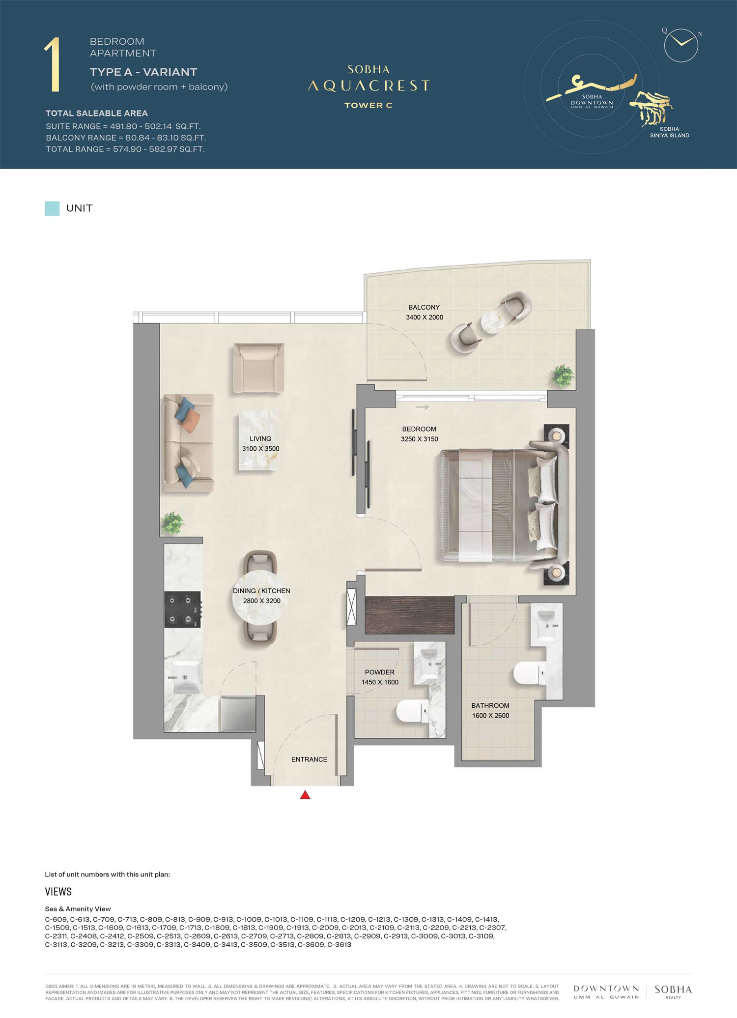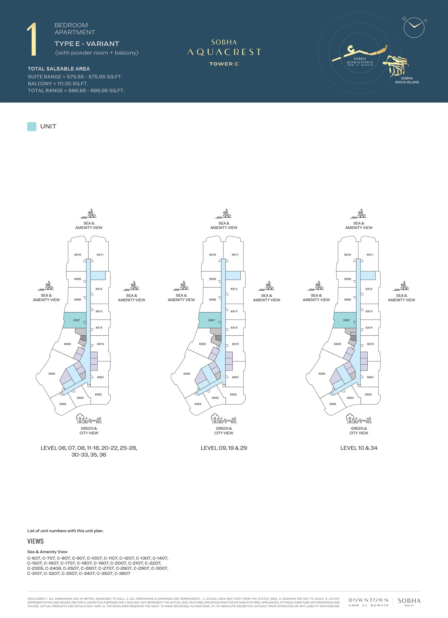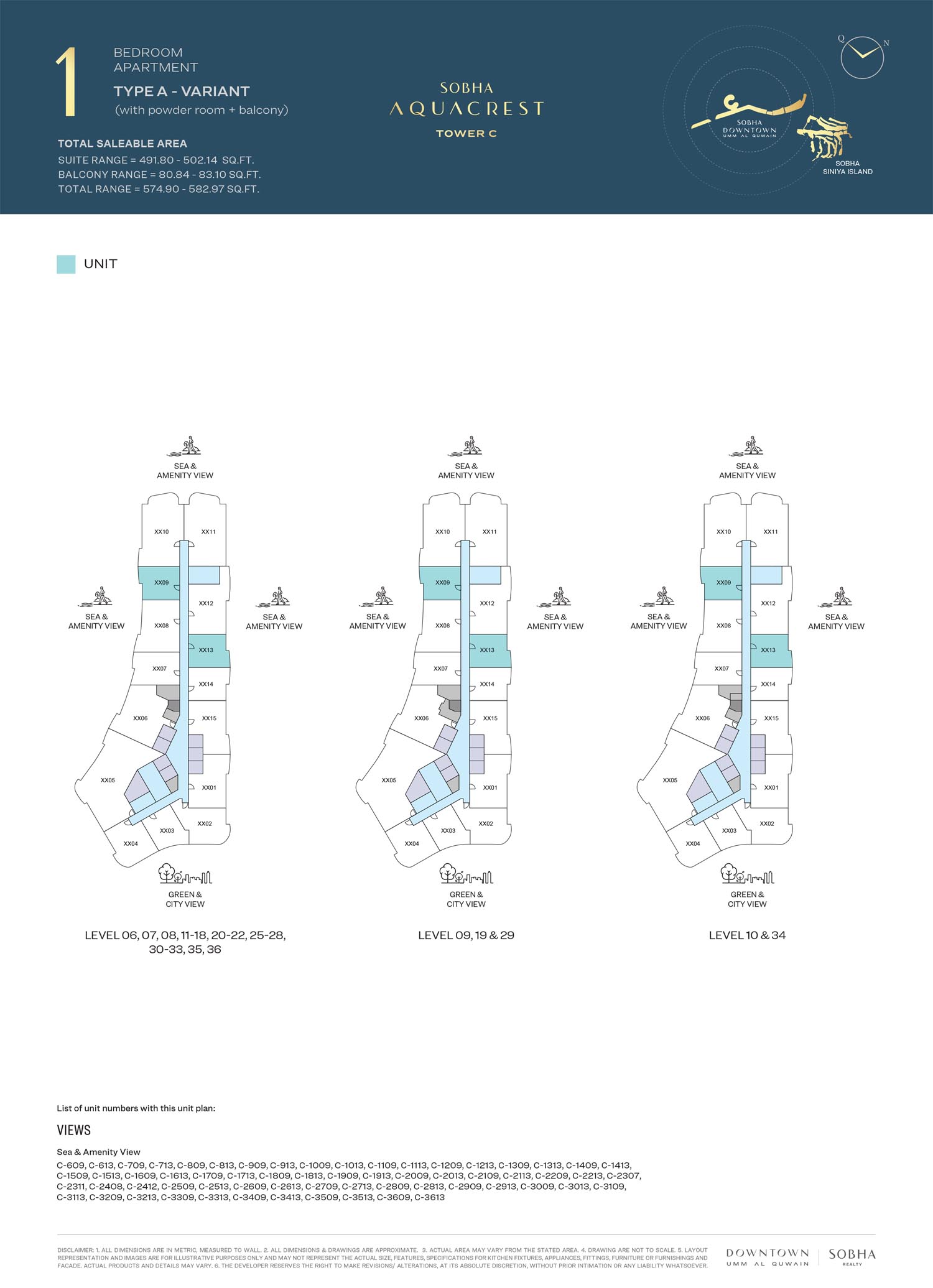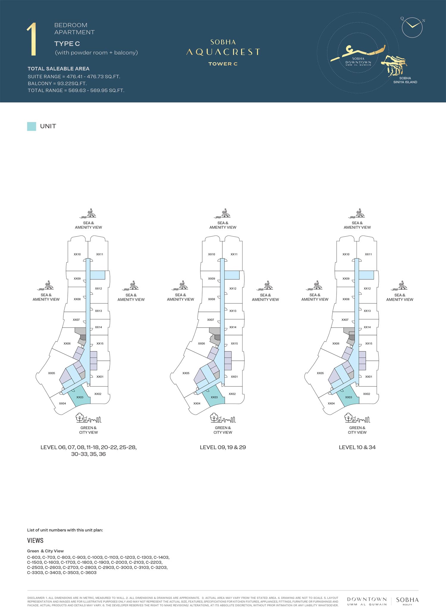 | Tower C | 1 Bedroom | Level 06-36 (Type A Variant) | 582.97 Sq Ft | Click Here |