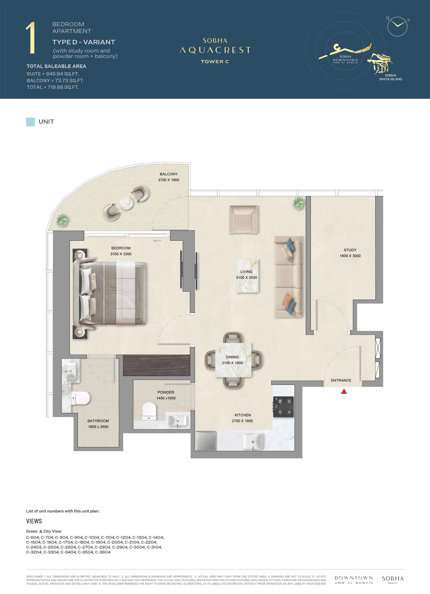 | Tower C | 1 Bedroom | Level 02-36 (Type D Variant) | 719.68 Sq Ft | Click Here |