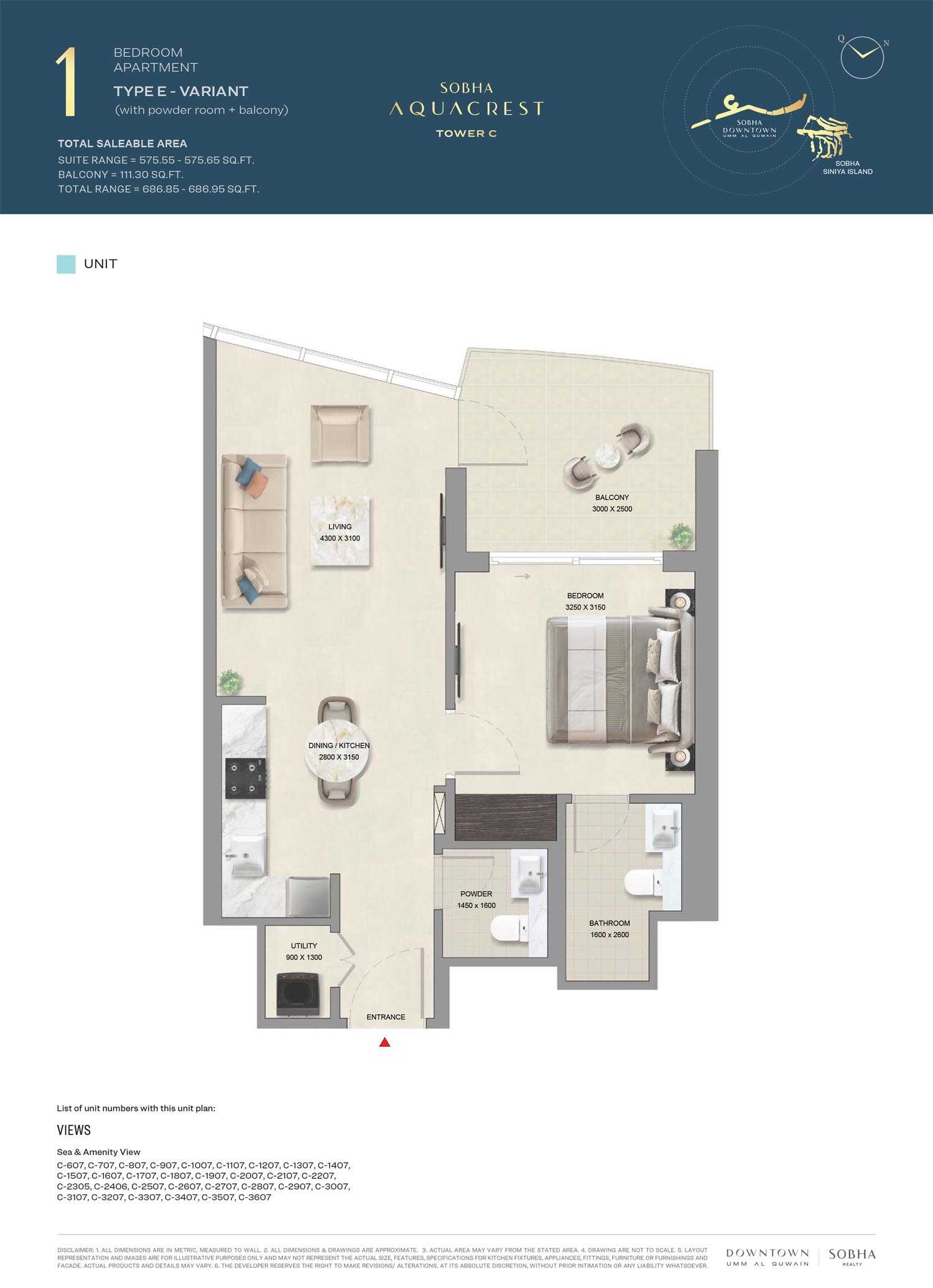 | Tower C | 1 Bedroom | Level 06-36 (Type E Variant) | 686.95 Sq Ft | Click Here |